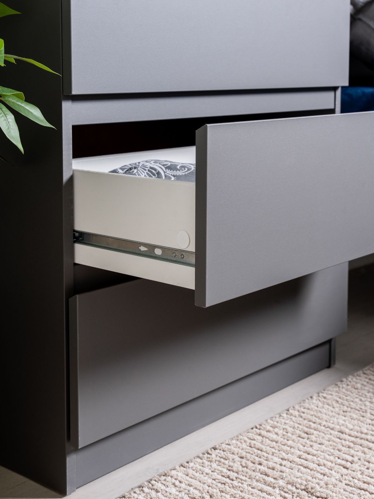 ГУД ЛАКК - знакомая мебель, которую легко купить и собрать! Серый комод КАСТОР с ящиками - новое воплощение линейки БРИМНЭС IKEA. Поклонникам скандинавского стиля точно будет по душе вместительный и компактный комод, который отлично подойдет как для гостиной, так и для спальни или детской комнаты. ГУД ЛАКК является официальным дитрибьютором с сертифицированных фабрик в Беларуси, которые производили мебель для шведской сети гипермаркетов ИКЕА. Исходное качество ikea, оригинальное лакокрасочное покрытие, качественная фурнитура - выгодно отличают мебель ГУД ЛАКК от сомнительных подделок. По отзывам наших покупательниц, со сборкой без проблем справится женщина при наличии шуруповерта или. ГУД ЛАКК - всё, как вы любите! Дополнительные характеристики Ящики без доводчиков Внутренние панели выполнены в белом цвете Внутренний размер ящика: 584х327 мм Материал и толщина корпуса: кашированное ДСП 16, 18 мм Материал и толщина фасадов: кашированное ДСП 16 мм Материал и толщина полок (крышки): кашированное ДСП 22 мм Тип опор - подпятник 5 мм Рекомендуем протирать тканью, смоченной мягким моющим средством.
