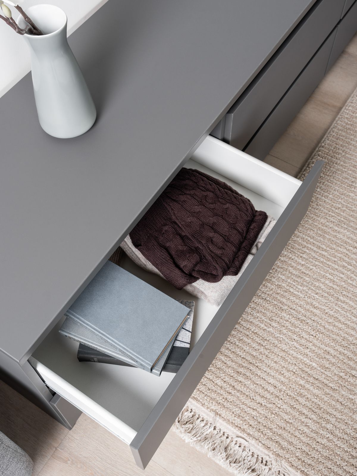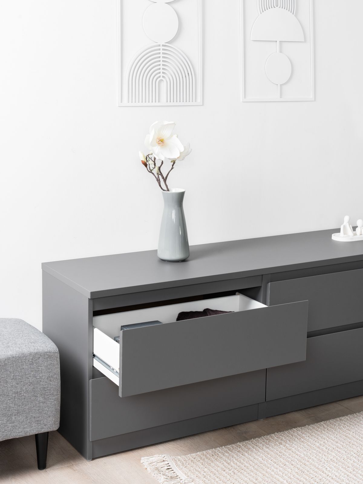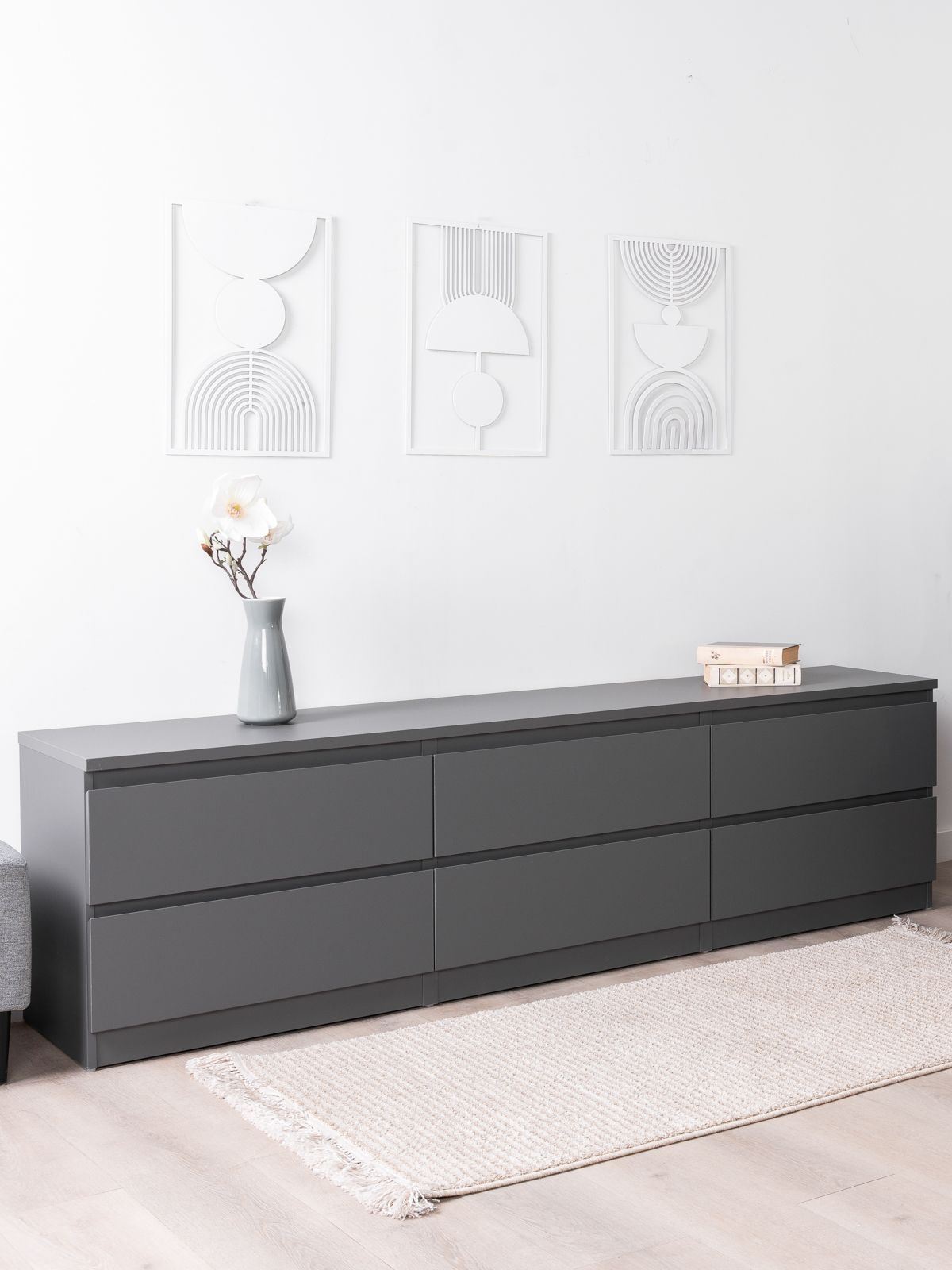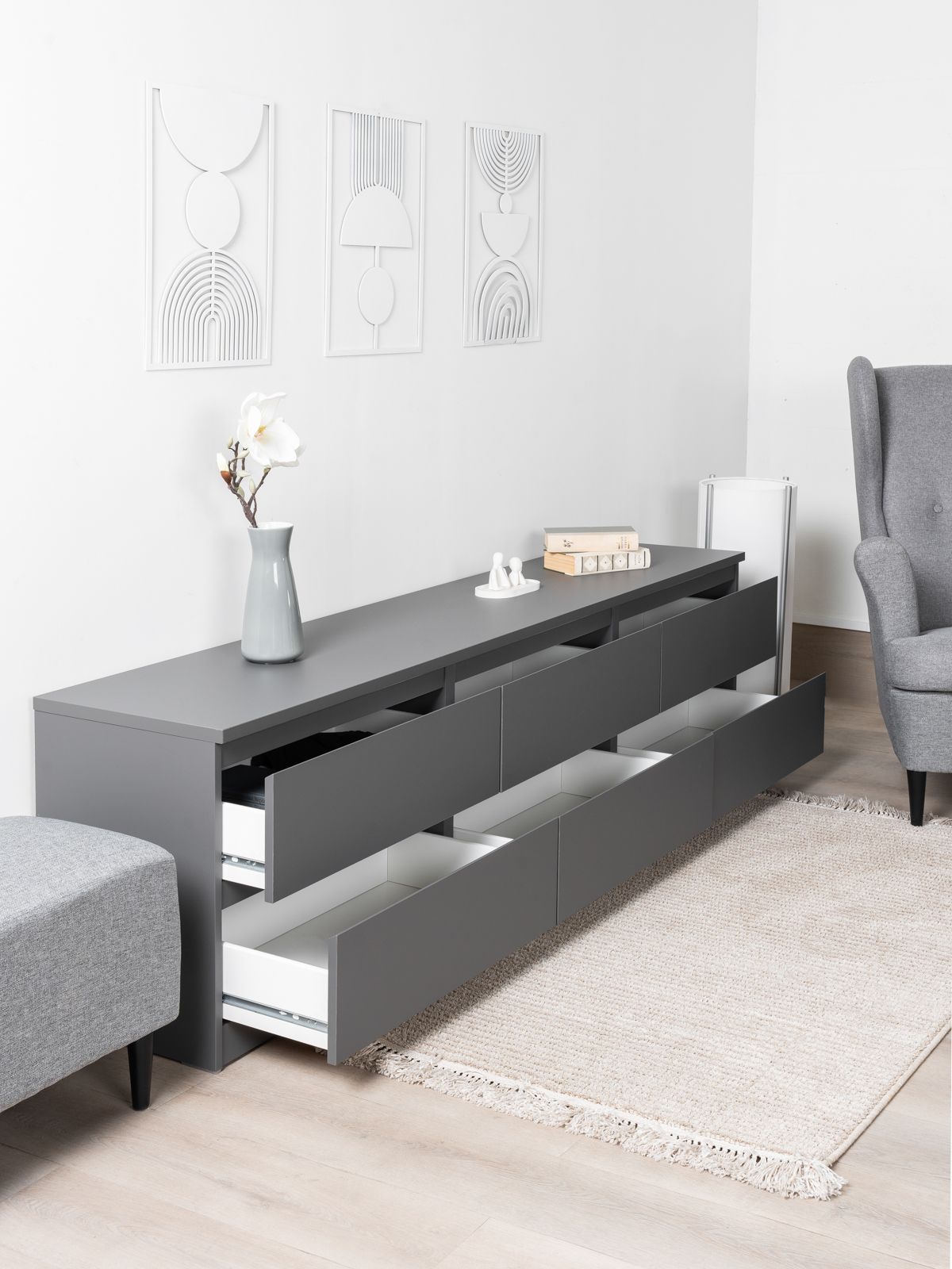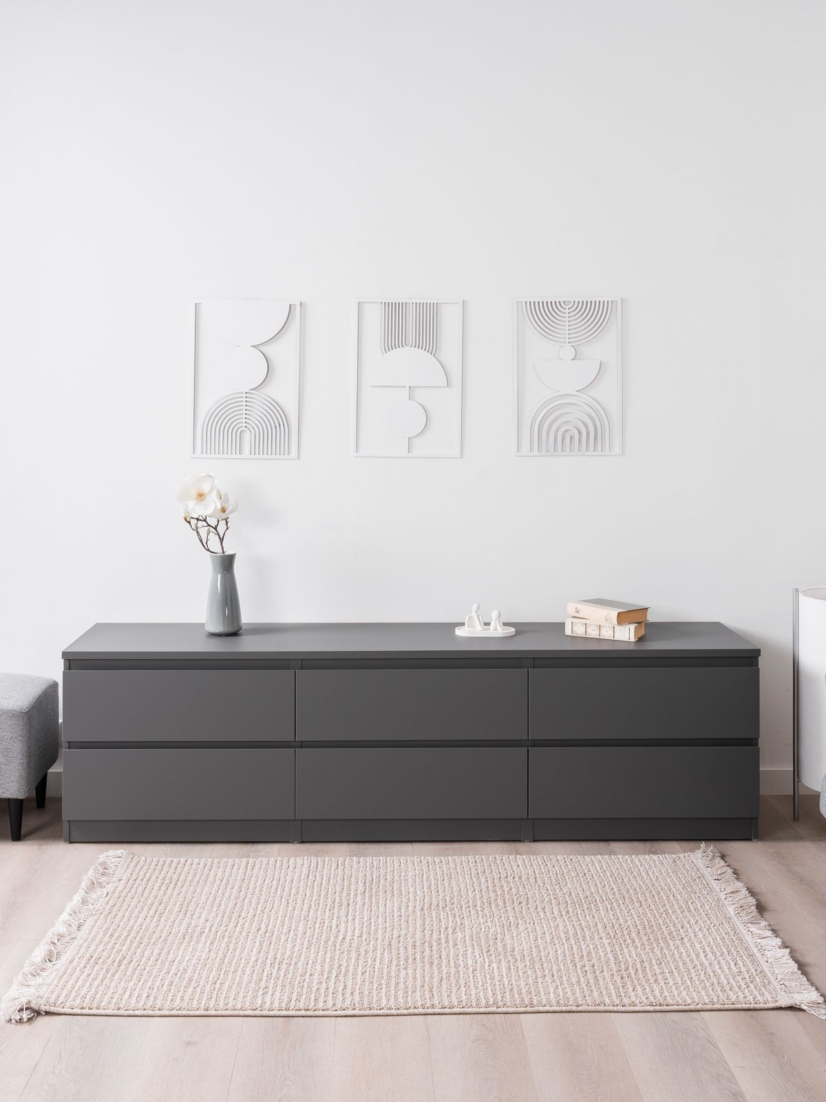 В белой узкой тумбе под ТВ поклонники минимализма непременно узнают серию IKEA БРИМНЭС. Вместительные ящики, функциональность, оригинальное лакокрасочное покрытие - это именно то, что выгодно отличает тумбу КАСТОР от некачественных подделок.