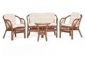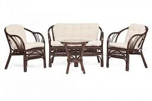 Материал: каркас - натуральный ротанг (высший сорт), столешница - закалённое стекло. Размеры: кресло - 61х67х78,5см, диван - 108х66х78,5см, стол - D50х56,5см Страна-производитель: Индонезия