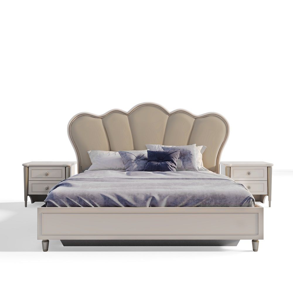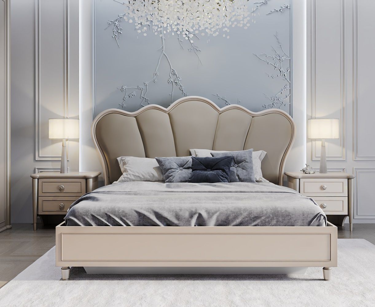 Изголовье кровати выполнено в форме, напоминающей бутон цветка. Оно имеет мягкие, плавные линии и округлые формы, что придает ему элегантный и романтичный вид.