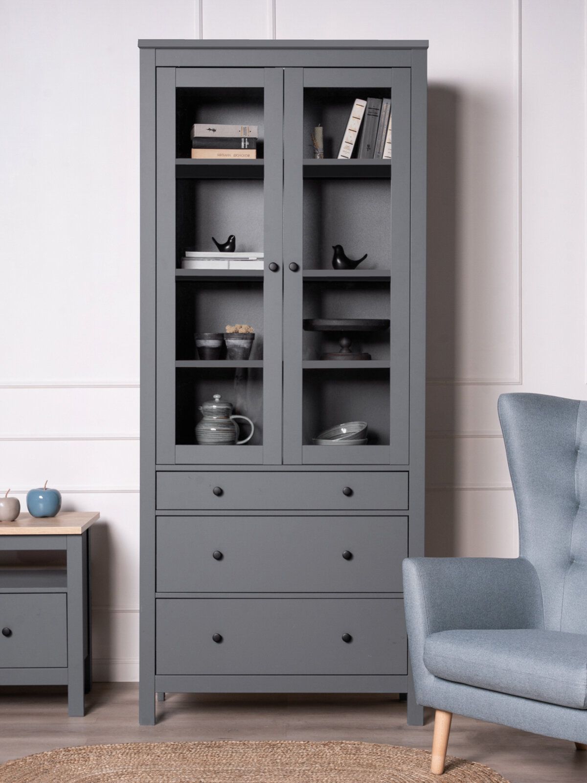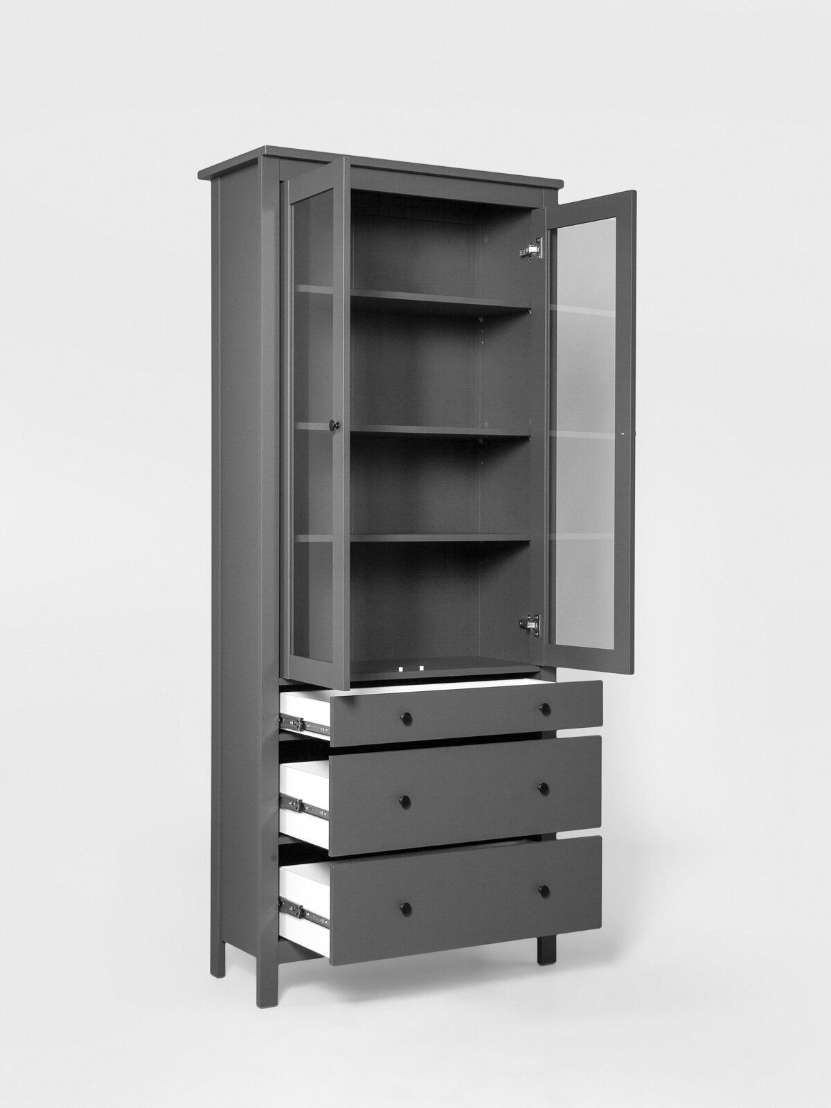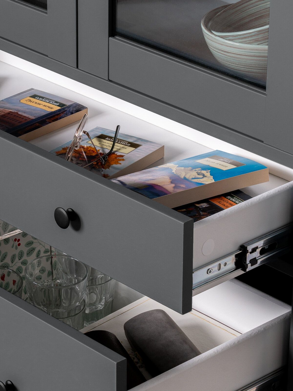 САГА шкаф с витриной 90? Шкаф с витриной САГА — это элегантное и функциональное решение для хранения, которое идеально сочетает в себе стиль, практичность и продуманный дизайн. Стеллаж оснащен тремя вместительными полками, регулирующимися по высоте, что позволяет гибко организовать пространство для хранения книг, посуды, декоративных элементов, фоторамок или других вещей. Дополнительно стеллаж оборудован тремя выдвижными ящиками, которые идеально подходят для хранения тех предметов, которые вы предпочитаете держать вне поля зрения. Ящики оснащены доводчиками и направляющими полного выдвижения, обеспечивающими плавное и бесшумное открывание, а также максимальное удобство в использовании. Благодаря такой продуманной конструкции, вы сможете легко адаптировать стеллаж под свои нужды и поддерживать порядок в доме.