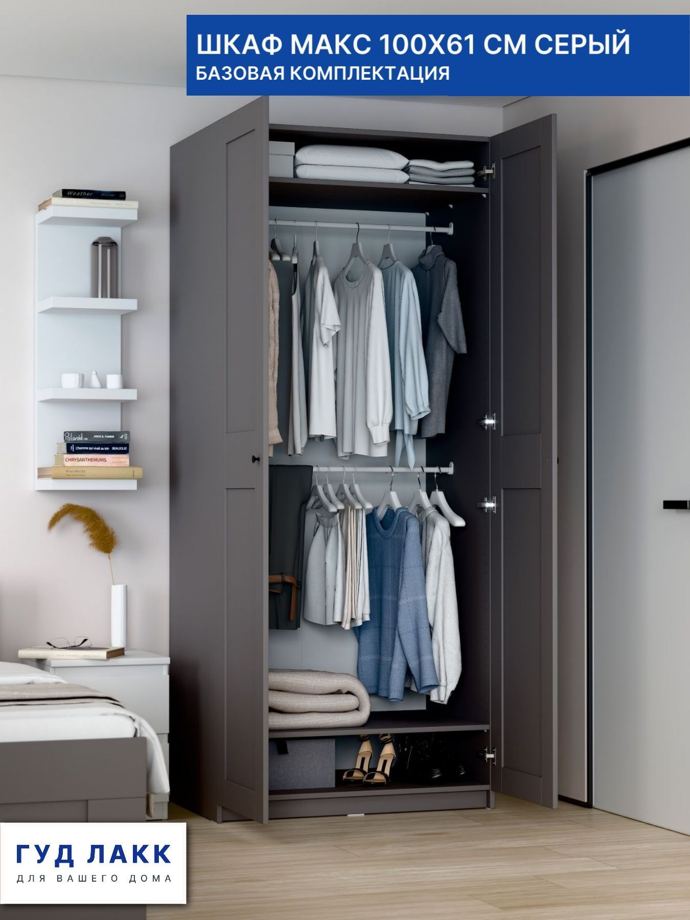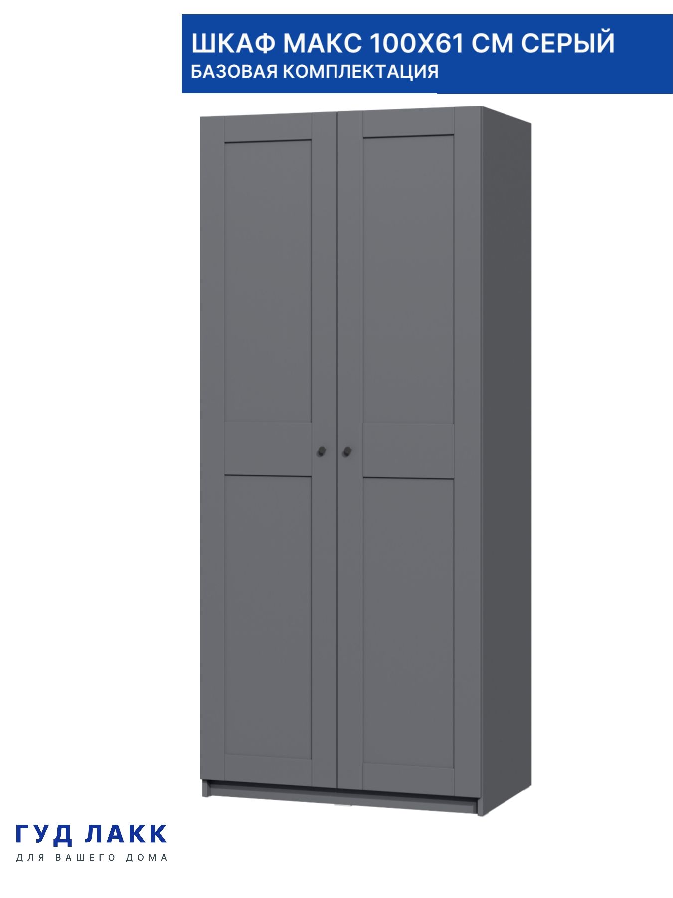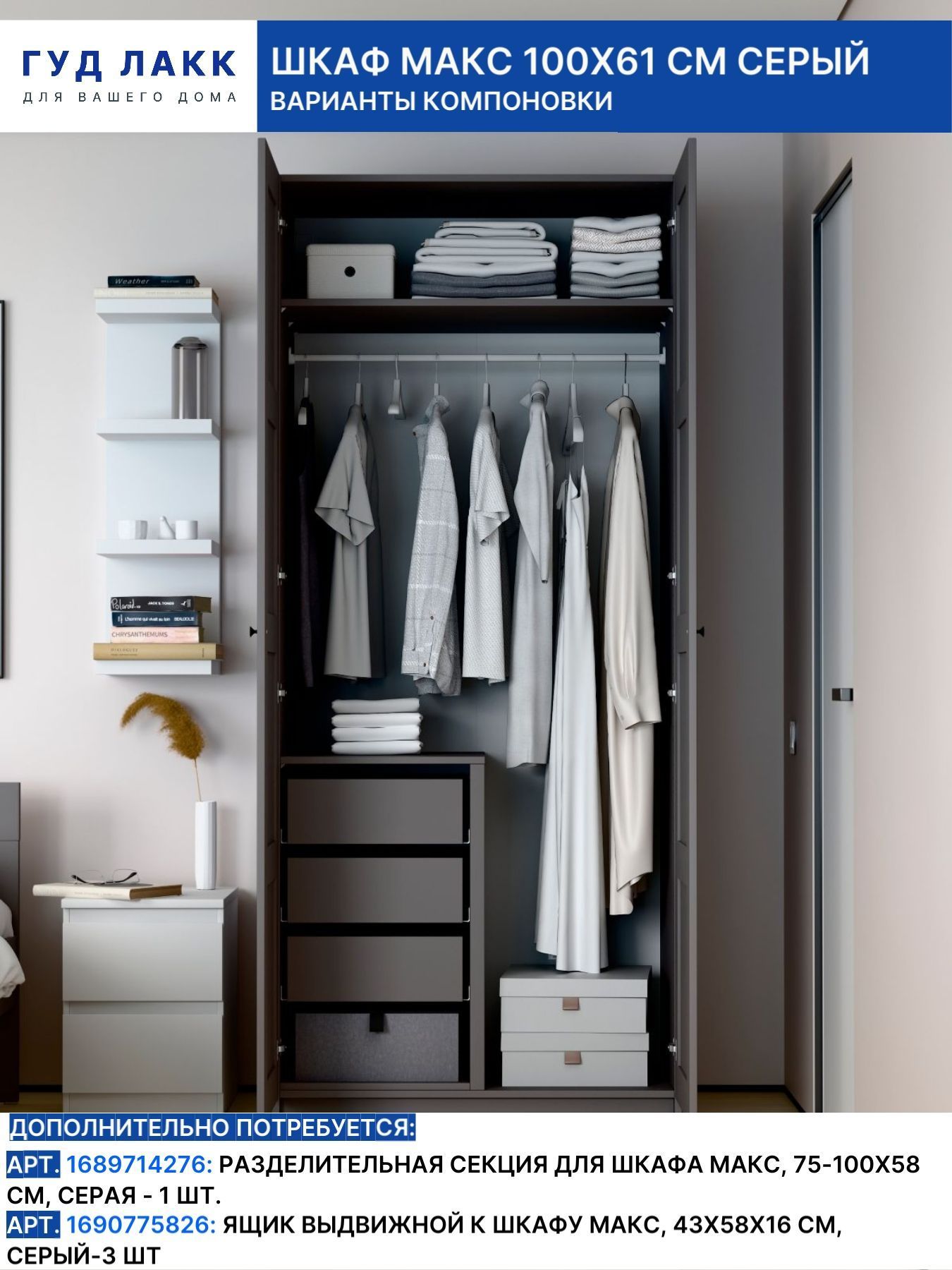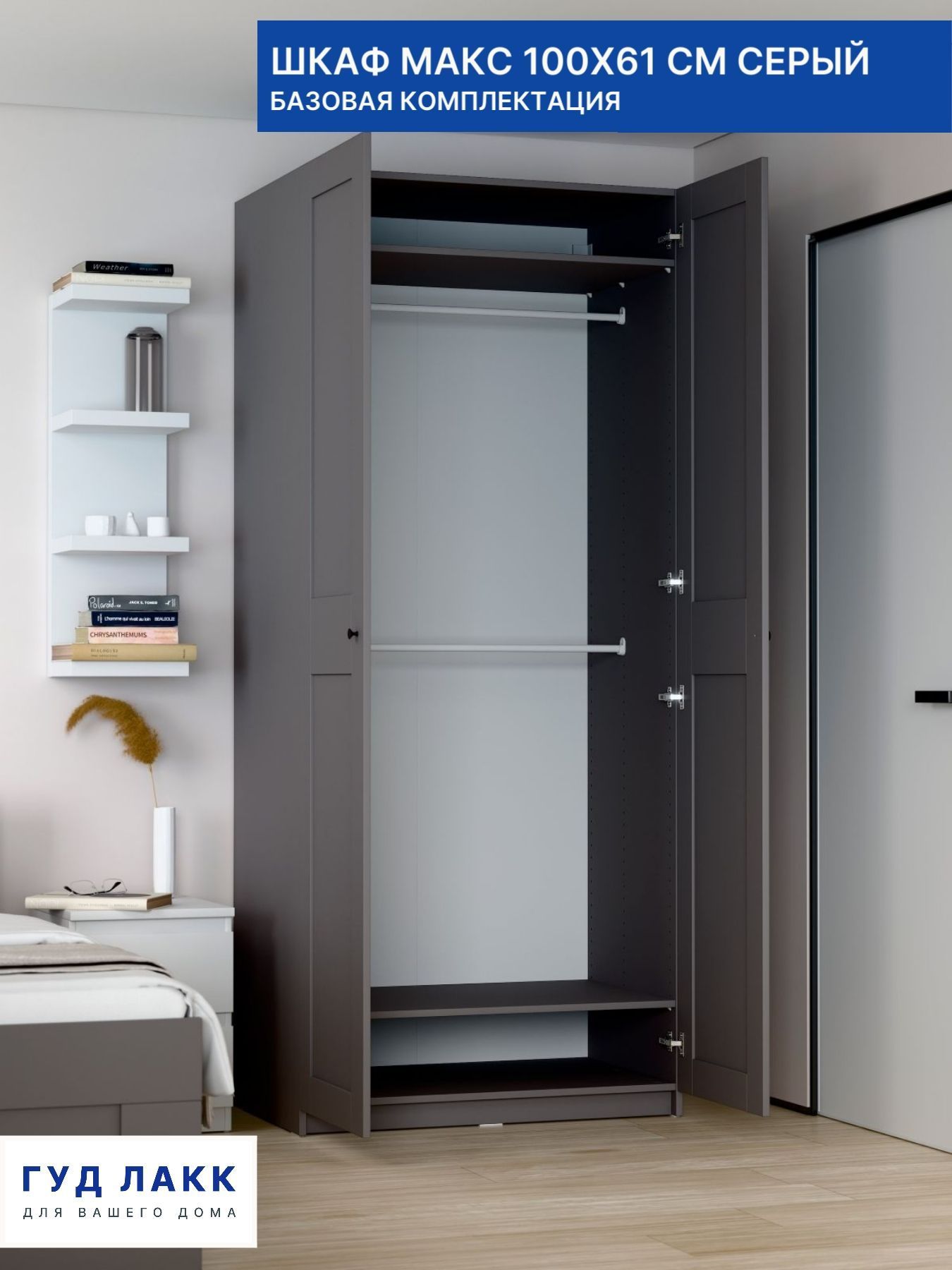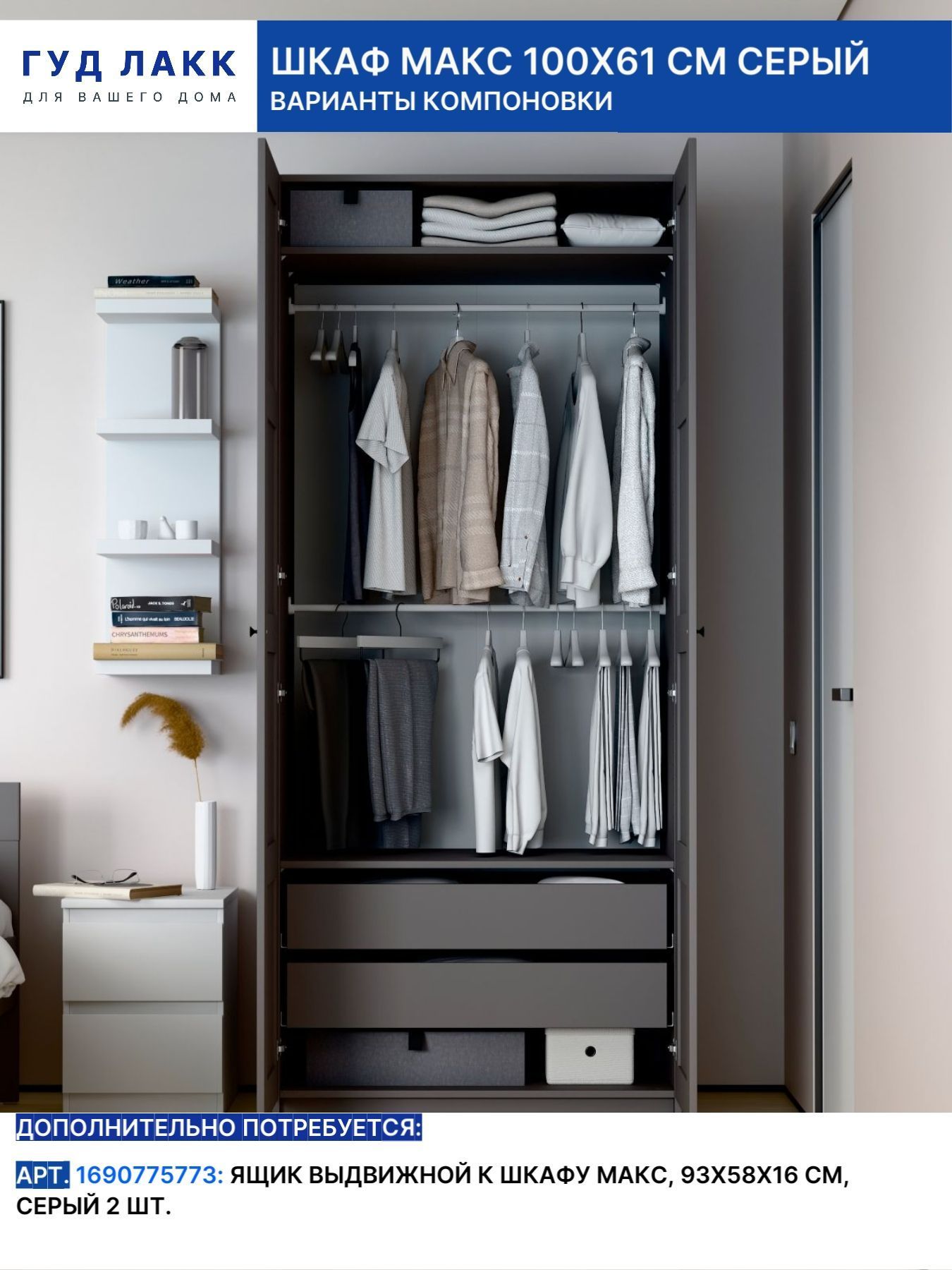 ГУД ЛАКК - знакомая мебель, которую легко купить и собрать!Ищете ПАКС IKEA? Шкаф МАКС — это тот же ПАКС, стильное и функциональное решение для хранения одежды, обуви и аксессуаров. Он выполнен в нейтральном белом цвете, который легко впишется в любой интерьер.Шкаф имеет две распашные двери, что обеспечивает удобный доступ к содержимому. Внутри шкафа есть две полки, которые позволяют организовать хранение вещей. Полки регулируются по высоте, что позволяет настроить пространство под свои потребности.Благодаря своим компактным размерам, шкаф МАКС не займет много места в комнате. Его можно разместить в прихожей, спальне или гардеробной.Шкаф изготовлен из ДСП с минимальным содержанием формальдегида и соответствует Европейскому классу экобезопасности Е0,5. Это значит, что мебель ГУД ЛАКК идеально подходит и для детской комнаты. Белый цвет придает шкафу свежий и современный вид.Если вы ищете шкаф для хранения одежды и других вещей, то шкаф МАКС станет отличным выбором. Он сочетает в себе стиль, функциональность и удобство использования.Поставляется в разобранном виде, со всеми необходимыми комплектующими, инструкцией и схемой по сборке. Фурнитура: ручки-кнопкиДополнительно можно приобрести: Полка к шкафу МАКС, 97х59 см, белая, артикул 1200516428Ящик выдвижной к шкафу МАКС, 93х58х16 см, белый, артикул 1200614852Изготовлен из кашированного ДСП толщиной 18 мм. Крепится к стене. Материал и толщина корпуса - ДСП 18 мм, торец облицован пленкой бумажной + кромка бумажная. Двери сборные (рамочно-филенчатая конструкция). Материал и толщина полок (крышки) - кашированное ДСП 18 мм, торец облицован пленкой бумажной + кромка бумажная. В боковинах шкафов сверление выполнено с шагом 32 мм (по всей высоте шкафа) для установки полок, ящиков и штанг на желаемом уровне. Штангой комплектуются только шкафы глубиной 607 мм. Макс. нагрузка (кг) - нагрузка на полку не более 12 кг. Материал и толщина задней стенки - ХДФ 3 мм. Тип опор - подпятник 5 мм. Тип направляющих (для выдвижных систем) – шариковые направляющие скрытого монтажа. Макс. нагрузка (кг) - на ящик не более 8 кг. Тип петель - 4-х шарнирные с интегрированным доводчиком.