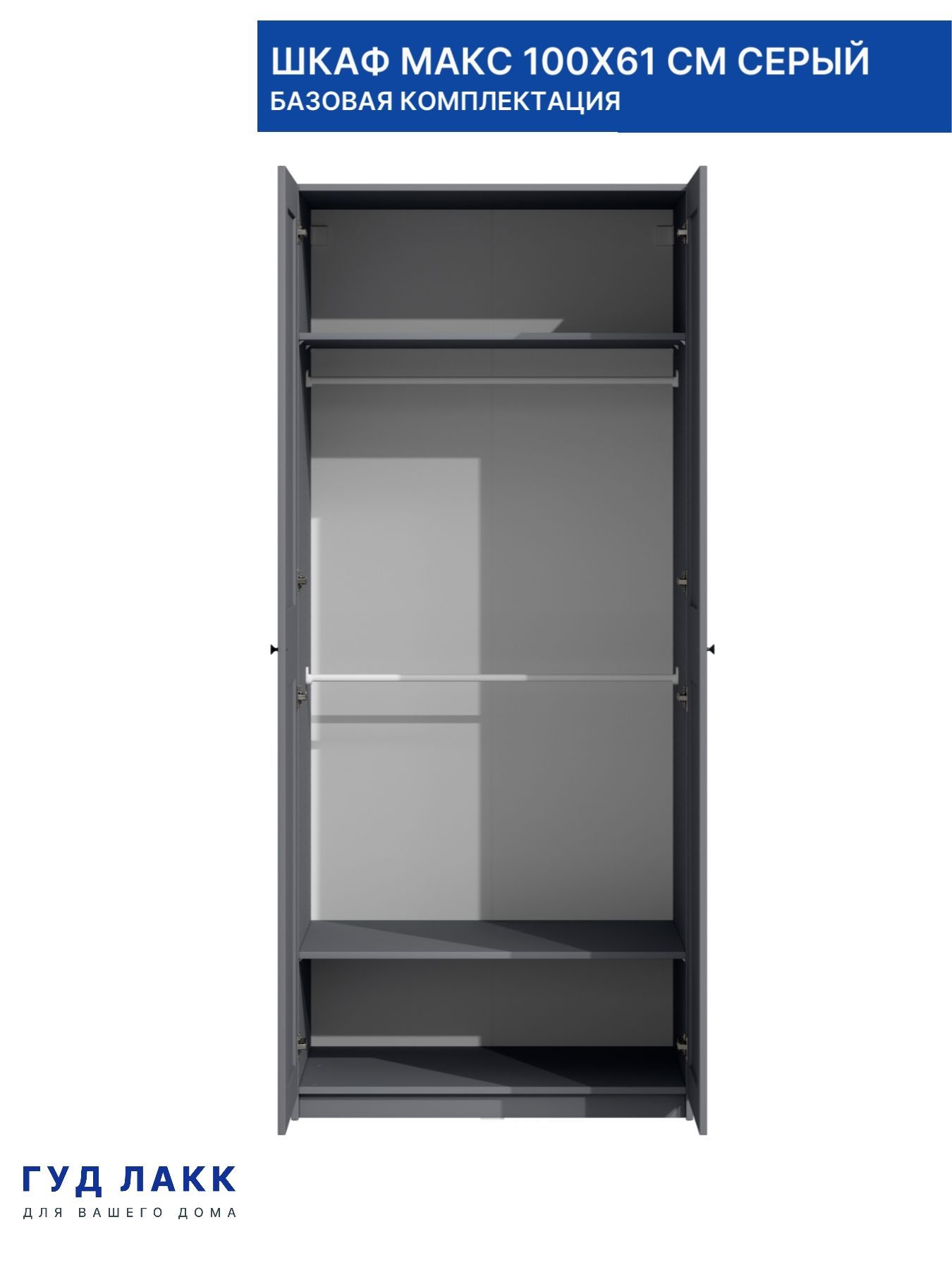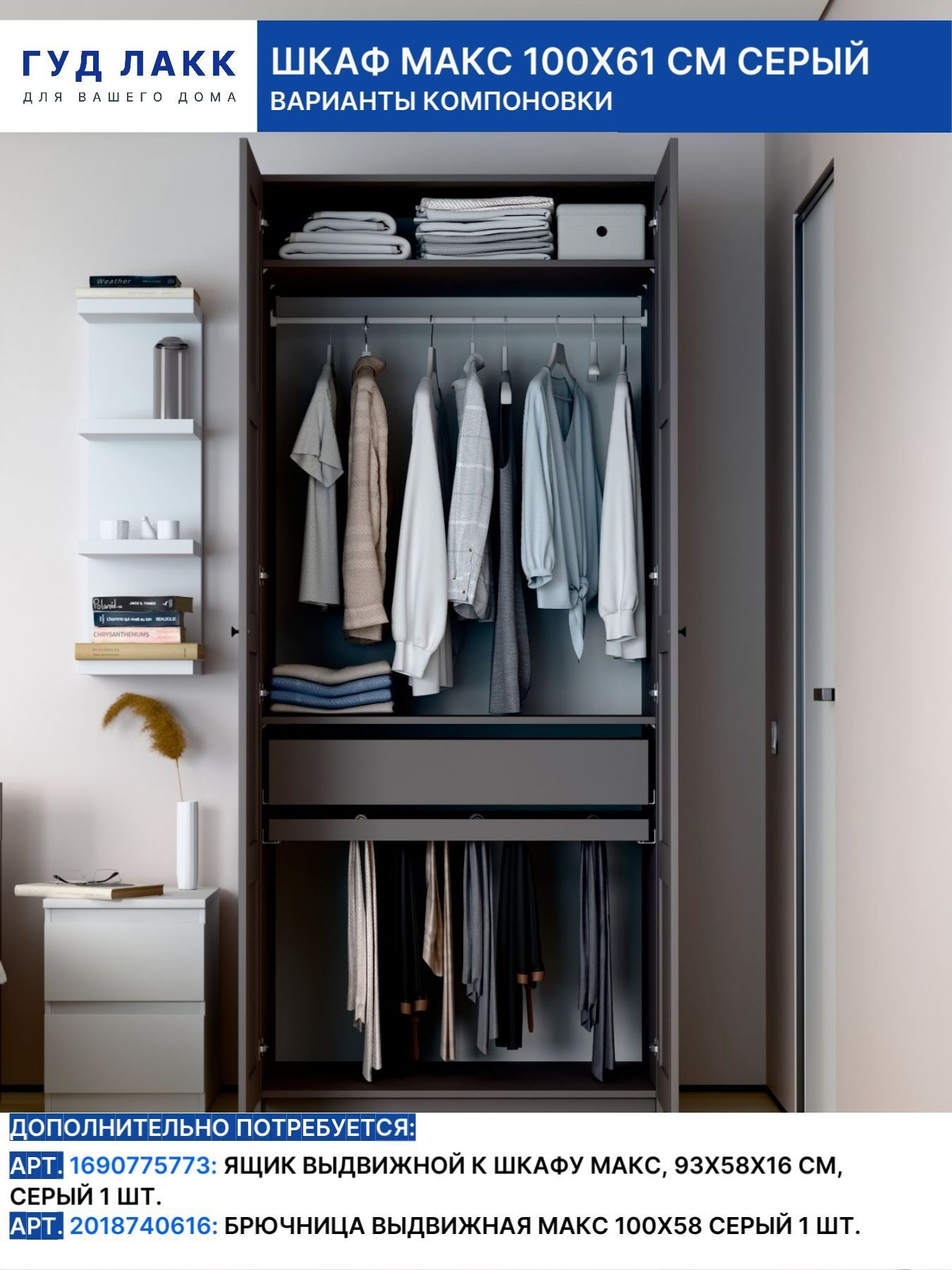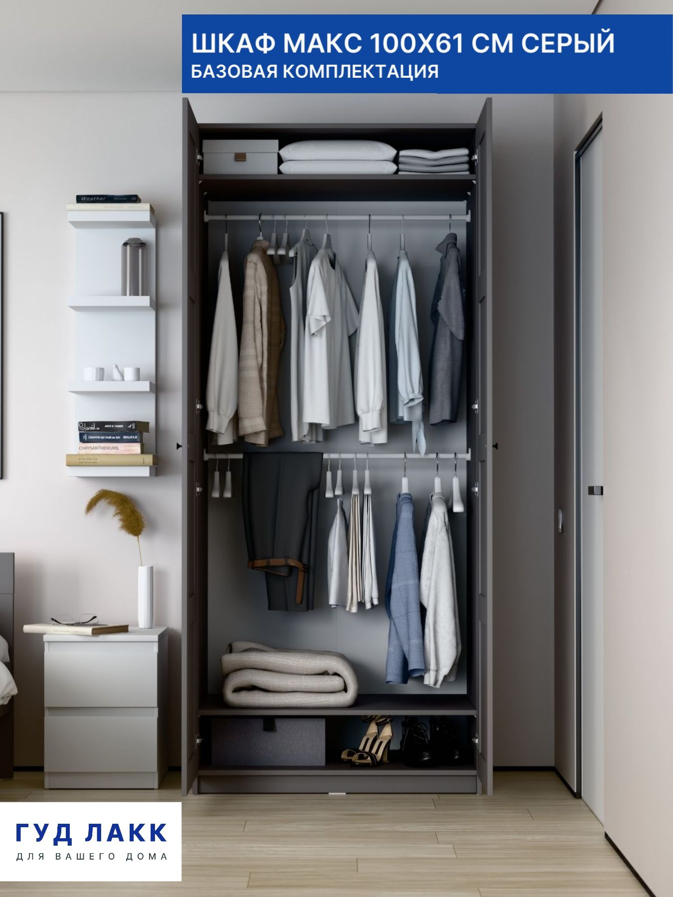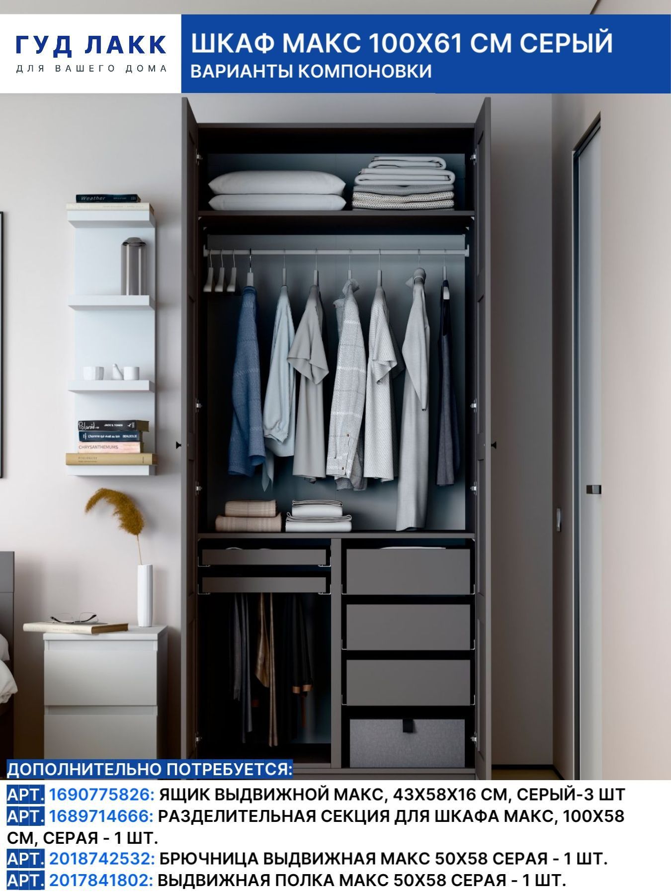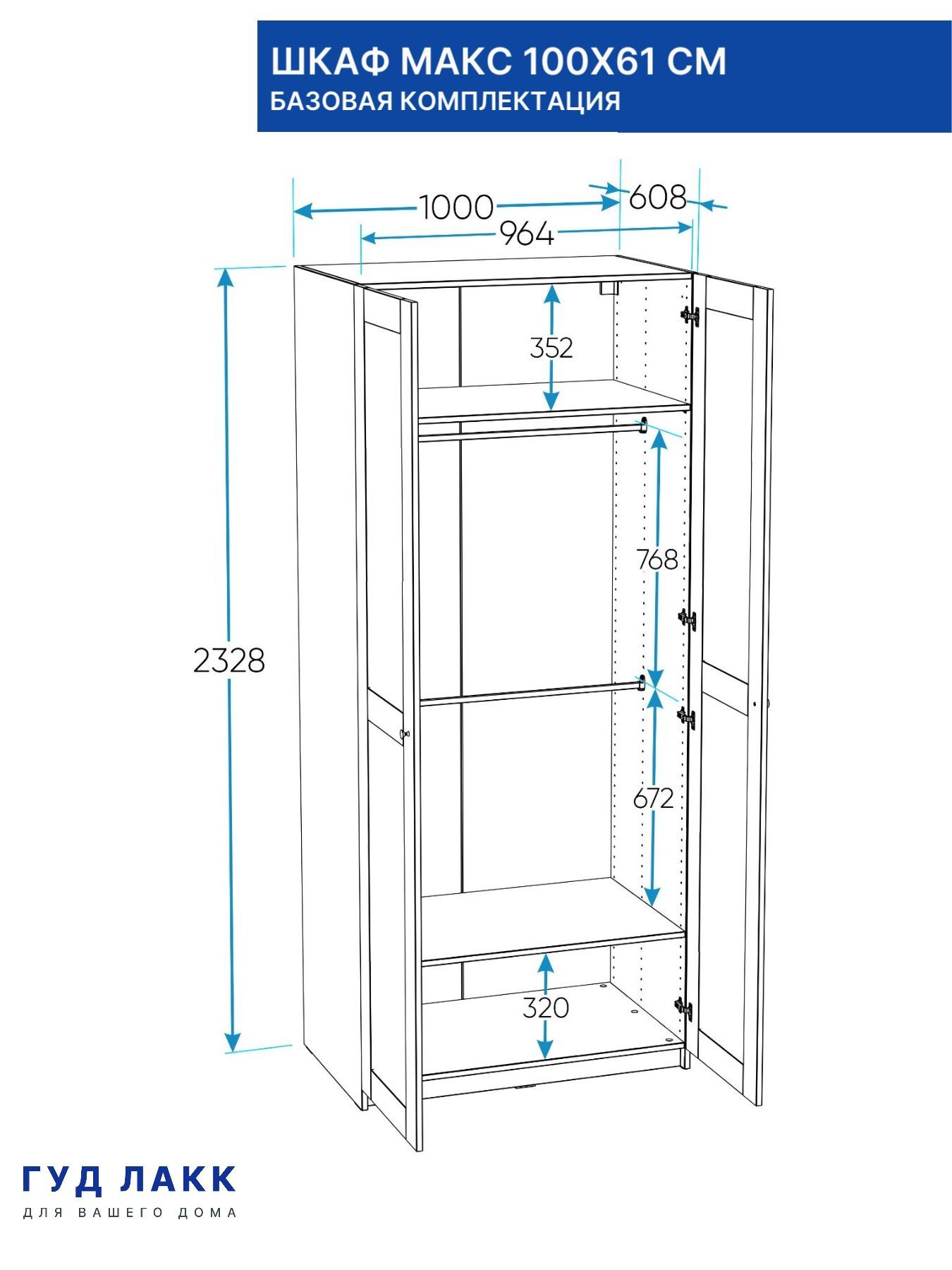 ГУД ЛАКК - знакомая мебель, которую легко купить и собрать!Ищете ПАКС IKEA? Шкаф МАКС — это тот же ПАКС, стильное и функциональное решение для хранения одежды, обуви и аксессуаров. Он выполнен в нейтральном белом цвете, который легко впишется в любой интерьер.Шкаф имеет две распашные двери, что обеспечивает удобный доступ к содержимому. Внутри шкафа есть две полки, которые позволяют организовать хранение вещей. Полки регулируются по высоте, что позволяет настроить пространство под свои потребности.Благодаря своим компактным размерам, шкаф МАКС не займет много места в комнате. Его можно разместить в прихожей, спальне или гардеробной.Шкаф изготовлен из ДСП с минимальным содержанием формальдегида и соответствует Европейскому классу экобезопасности Е0,5. Это значит, что мебель ГУД ЛАКК идеально подходит и для детской комнаты. Белый цвет придает шкафу свежий и современный вид.Если вы ищете шкаф для хранения одежды и других вещей, то шкаф МАКС станет отличным выбором. Он сочетает в себе стиль, функциональность и удобство использования.Поставляется в разобранном виде, со всеми необходимыми комплектующими, инструкцией и схемой по сборке. Фурнитура: ручки-кнопкиДополнительно можно приобрести: Полка к шкафу МАКС, 97х59 см, белая, артикул 1200516428Ящик выдвижной к шкафу МАКС, 93х58х16 см, белый, артикул 1200614852Изготовлен из кашированного ДСП толщиной 18 мм. Крепится к стене. Материал и толщина корпуса - ДСП 18 мм, торец облицован пленкой бумажной + кромка бумажная. Двери сборные (рамочно-филенчатая конструкция). Материал и толщина полок (крышки) - кашированное ДСП 18 мм, торец облицован пленкой бумажной + кромка бумажная. В боковинах шкафов сверление выполнено с шагом 32 мм (по всей высоте шкафа) для установки полок, ящиков и штанг на желаемом уровне. Штангой комплектуются только шкафы глубиной 607 мм. Макс. нагрузка (кг) - нагрузка на полку не более 12 кг. Материал и толщина задней стенки - ХДФ 3 мм. Тип опор - подпятник 5 мм. Тип направляющих (для выдвижных систем) – шариковые направляющие скрытого монтажа. Макс. нагрузка (кг) - на ящик не более 8 кг. Тип петель - 4-х шарнирные с интегрированным доводчиком.