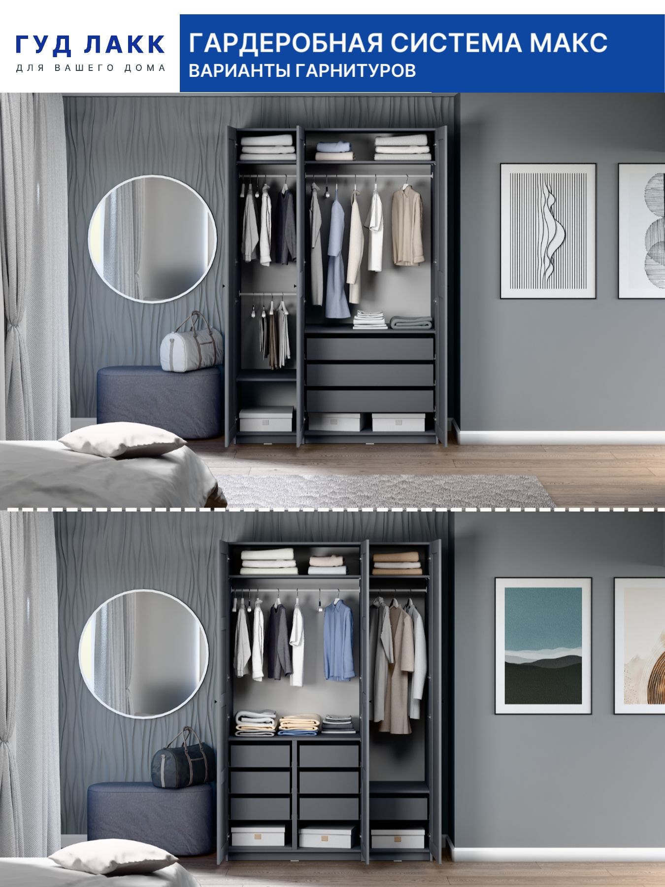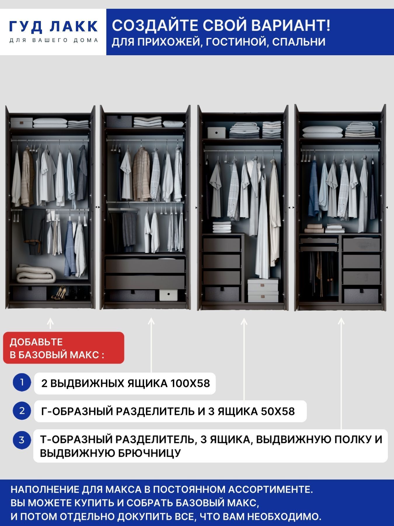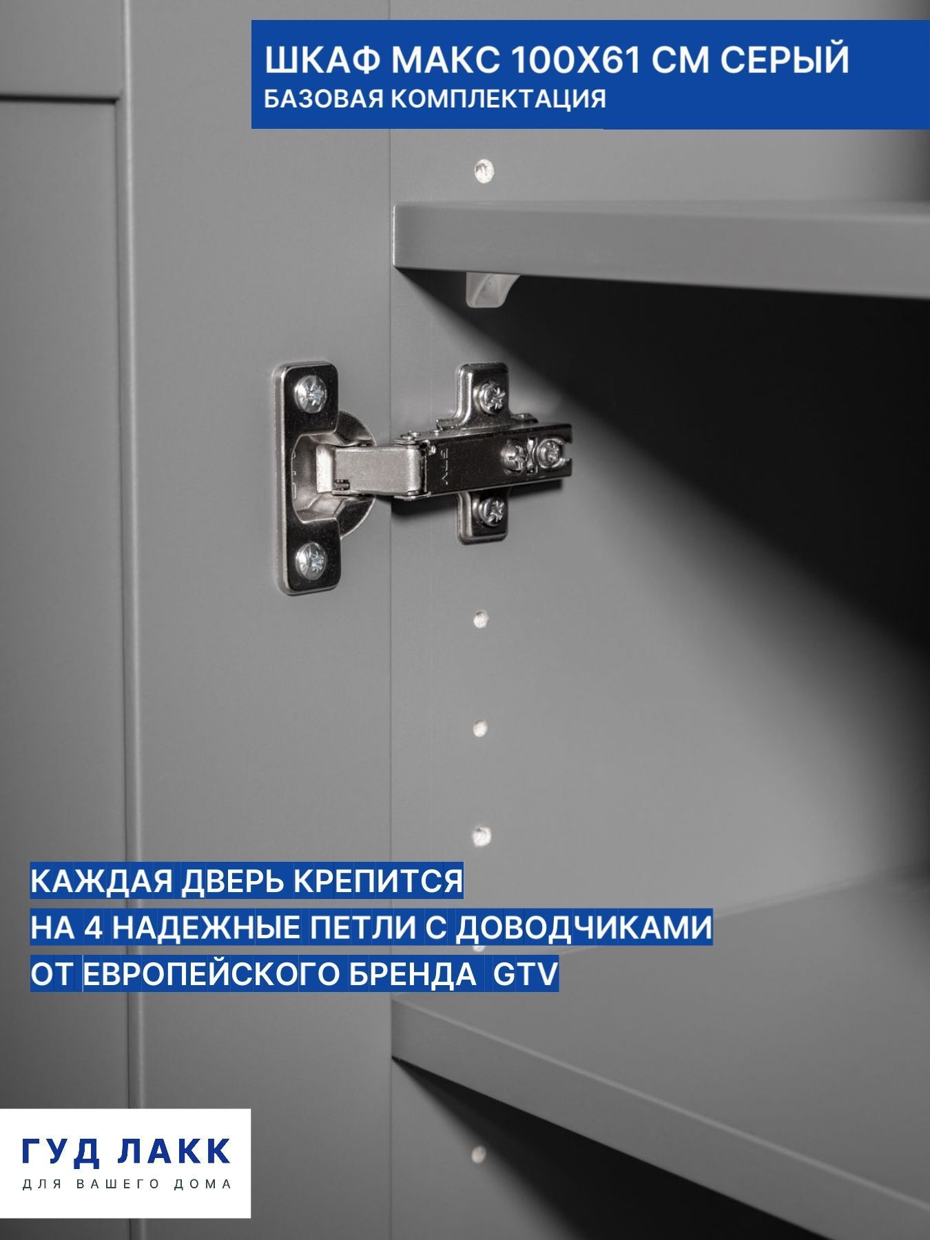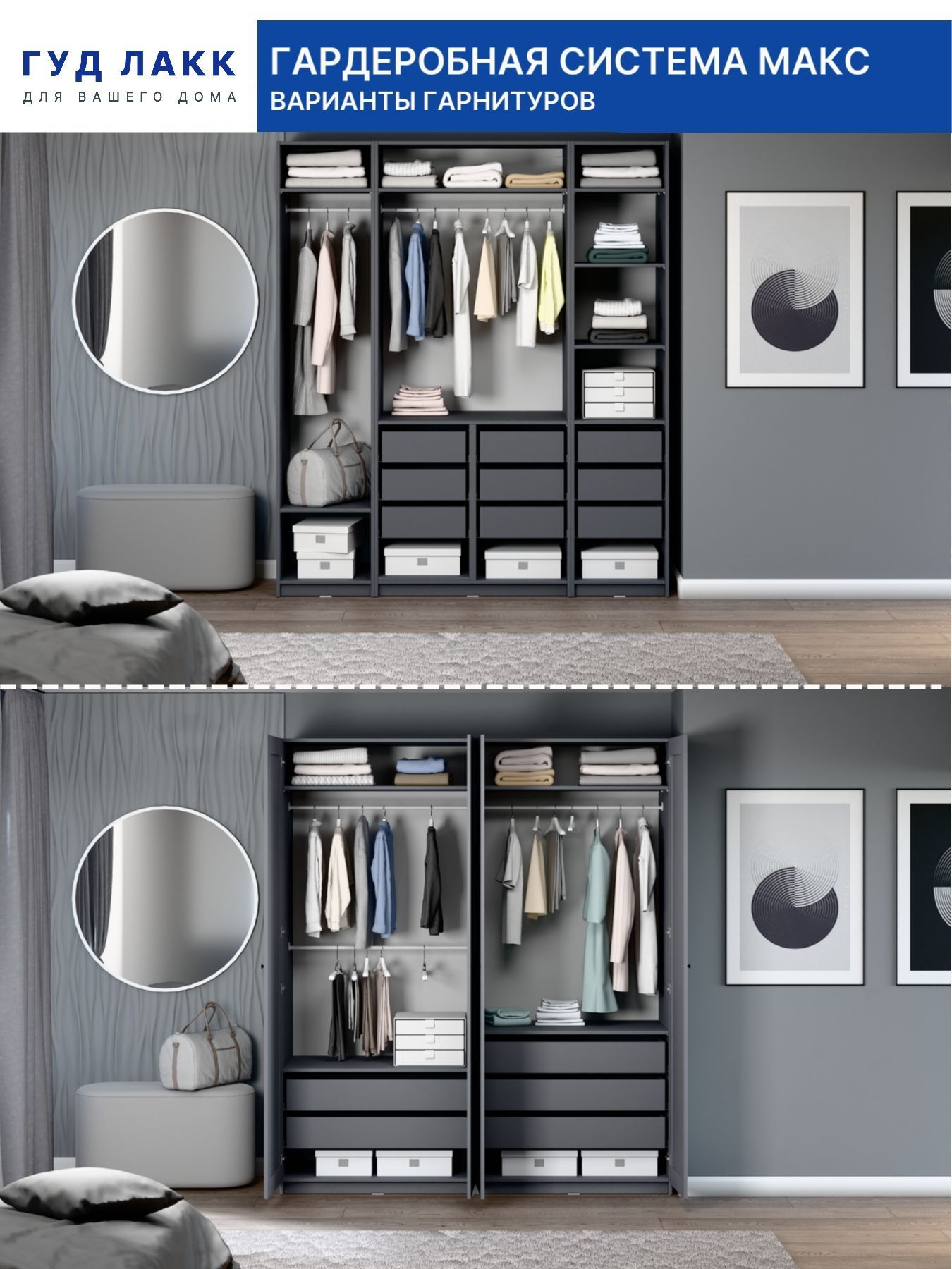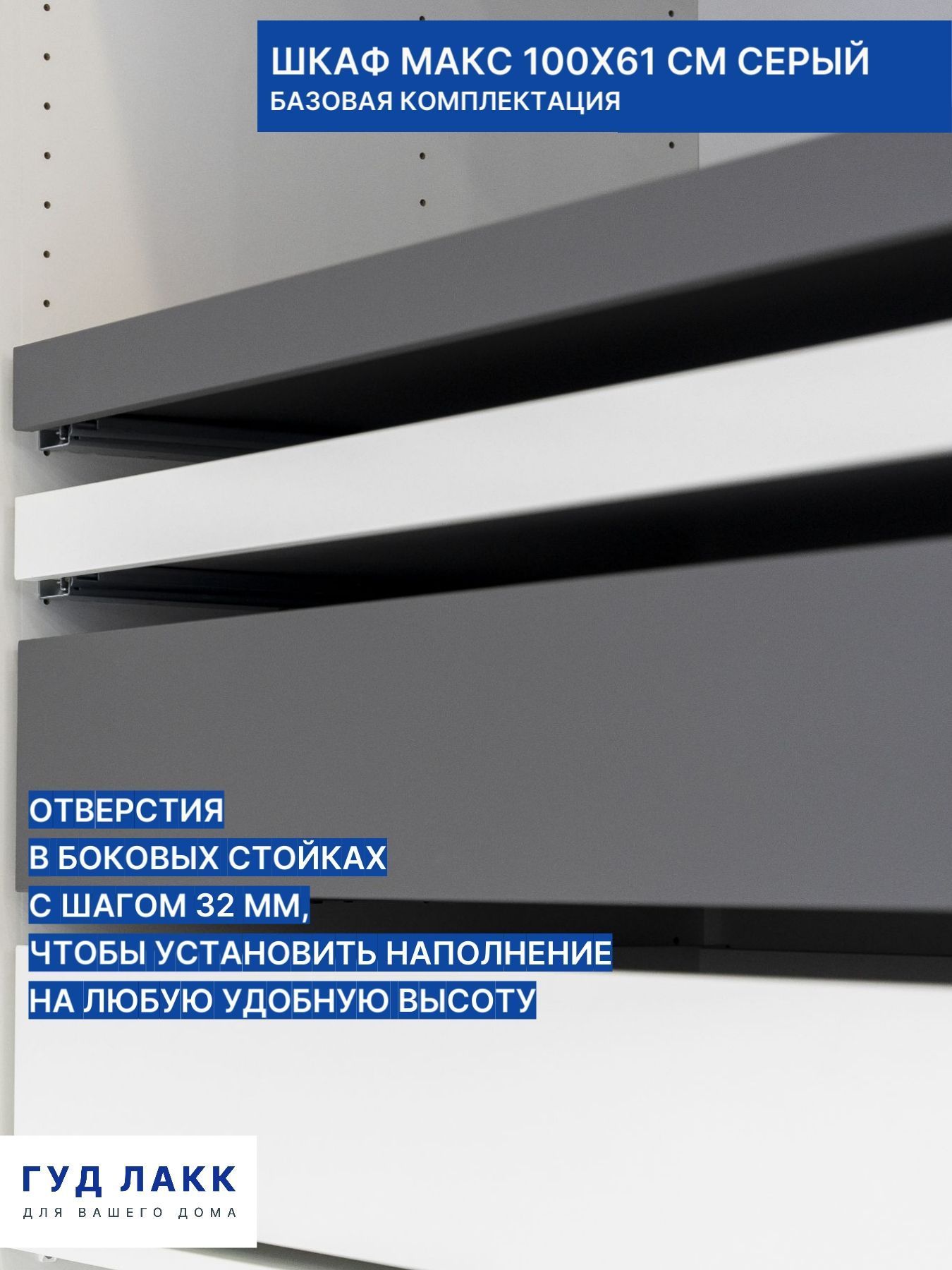 ГУД ЛАКК - знакомая мебель, которую легко купить и собрать!Ищете ПАКС IKEA? Шкаф МАКС — это тот же ПАКС, стильное и функциональное решение для хранения одежды, обуви и аксессуаров. Он выполнен в нейтральном белом цвете, который легко впишется в любой интерьер.Шкаф имеет две распашные двери, что обеспечивает удобный доступ к содержимому. Внутри шкафа есть две полки, которые позволяют организовать хранение вещей. Полки регулируются по высоте, что позволяет настроить пространство под свои потребности.Благодаря своим компактным размерам, шкаф МАКС не займет много места в комнате. Его можно разместить в прихожей, спальне или гардеробной.Шкаф изготовлен из ДСП с минимальным содержанием формальдегида и соответствует Европейскому классу экобезопасности Е0,5. Это значит, что мебель ГУД ЛАКК идеально подходит и для детской комнаты. Белый цвет придает шкафу свежий и современный вид.Если вы ищете шкаф для хранения одежды и других вещей, то шкаф МАКС станет отличным выбором. Он сочетает в себе стиль, функциональность и удобство использования.Поставляется в разобранном виде, со всеми необходимыми комплектующими, инструкцией и схемой по сборке. Фурнитура: ручки-кнопкиДополнительно можно приобрести: Полка к шкафу МАКС, 97х59 см, белая, артикул 1200516428Ящик выдвижной к шкафу МАКС, 93х58х16 см, белый, артикул 1200614852Изготовлен из кашированного ДСП толщиной 18 мм. Крепится к стене. Материал и толщина корпуса - ДСП 18 мм, торец облицован пленкой бумажной + кромка бумажная. Двери сборные (рамочно-филенчатая конструкция). Материал и толщина полок (крышки) - кашированное ДСП 18 мм, торец облицован пленкой бумажной + кромка бумажная. В боковинах шкафов сверление выполнено с шагом 32 мм (по всей высоте шкафа) для установки полок, ящиков и штанг на желаемом уровне. Штангой комплектуются только шкафы глубиной 607 мм. Макс. нагрузка (кг) - нагрузка на полку не более 12 кг. Материал и толщина задней стенки - ХДФ 3 мм. Тип опор - подпятник 5 мм. Тип направляющих (для выдвижных систем) – шариковые направляющие скрытого монтажа. Макс. нагрузка (кг) - на ящик не более 8 кг. Тип петель - 4-х шарнирные с интегрированным доводчиком.
