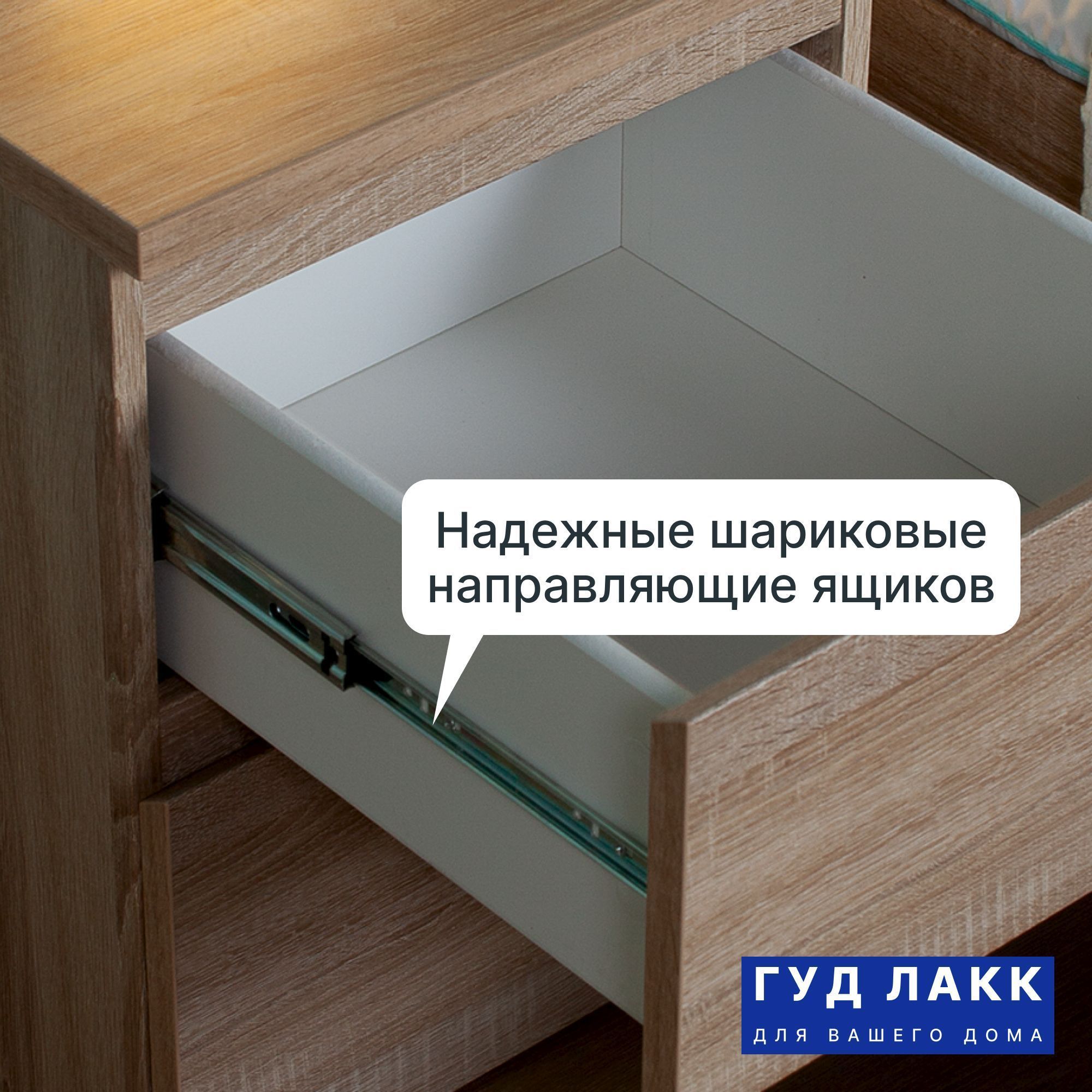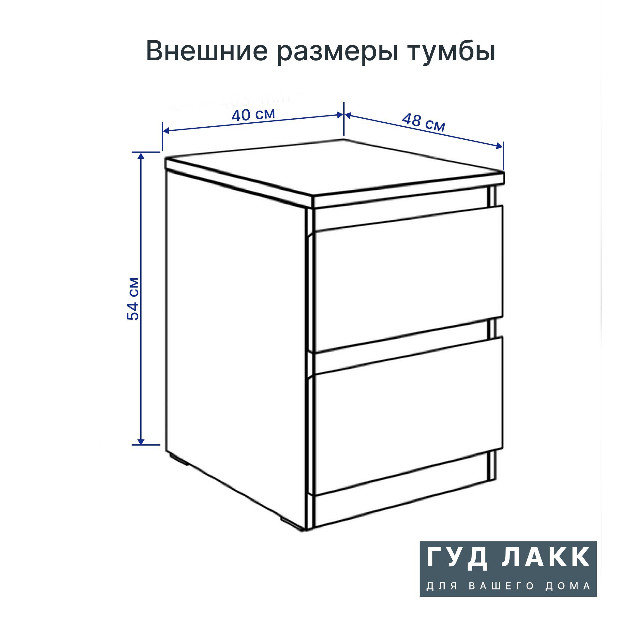ГУД ЛАКК - знакомая мебель, которую легко купить и собрать! Прикроватная тумба МАЛЬТА - минимализм и функциональность в каждой детали! Серия комодов и тумб МАЛЬТА вдохновлена популярной серией MALM от IKEA, и станет идеальным дополнением вашей спальни. Ее лаконичный дизайн гармонично впишется в любой интерьер, а компактные размеры не займут много места. Почему выбирают тумбу МАЛЬТА? Тумба МАЛЬТА — это прекрасное решение для прикроватного хранения. На столешнице можно разместить светильник для чтения, кружку кофе или поставить телефон на зарядку, а в двух вместительных выдвижных ящиках спрятать все то, что необходимо – положить планшет, книгу и массу необходимых мелочей. Ну и конечно, небольшая, но вместительная и стильная тумба пригодится абсолютно везде). УЗНАВАЕМЫЙ ДИЗАЙН В СТИЛЕ СКАНДИНАВСКОГО МИНИМАЛИЗМА. Дизайн без ручек делает тумбу более лаконичной и визуально легкой, а поверхность выглядит цельной и гармоничной, что создает ощущение порядка и чистоты. ВМЕСТИТЕЛЬНЫЕ ЯЩИКИ. Здесь удобно хранить книги, гаджеты и аксессуары для них, украшения, или мелочи, и многое другое, что обязательно должно быть у Вас под рукой. Тумба МАЛЬТА – это маленькая Нарния). ПЛАВНОЕ ЗАКРЫВАНИЕ И ПОЛНЫЙ ДОСТУП. Доводчики обеспечивают плавное и тихое закрывание ящиков. Направляющие полного выдвижения позволяют выдвигать ящик целиком, предоставляя полный доступ к его содержимому, упрощая поиск вещей и организацию внутреннего пространства ящика. ЭКОЛОГИЧНОСТЬ. Наша мебель производится на заводе полного цикла по принципу «от древесины до готового изделия». При этом применяются максимально жесткие требования к экологичности на уровне, установленном для детской мебели. КАЧЕСТВО НА УРОВНЕ IKEA. Тумба МАЛЬТА изготовлена на сертифицированной фабрике в Беларуси, которая ранее производила мебель для шведского бренда. Кстати, в том числе поэтому наш ассортимент прекрасно сочетается с мебелью ИКЕА, которая, возможно, есть у Вас дома. Сочетается как по дизайну, так и за счет совпадения цветовой гаммы. ЛЕГКОСТЬ СБОРКИ. Вы можете сами легко и быстро собрать нашу мебель, что позволит сэкономить и время на ожидание сборщика, и деньги на оплату его услуг. А поможет в этом не только высокое качество изготовленной мебели, но и понятная пошаговая инструкция. Кстати, если вы вдруг потеряли инструкцию, ее всегда можно скачать здесь, в карточке товара. НАДЕЖНОСТЬ. Несмотря на то, что гарантийный срок на мебель по закону составляет 24 месяца, реальный срок службы нашей мебели составляет до 20 лет. Уж поверьте, сменить обстановку вы решите гораздо раньше, чем выйдет из строя наша мебель. Мы хорошо знаем жизненный путь нашей мебели. Из Вашей квартиры она переедет на квартиру к детям, потом к внукам, потом на дачу, с дачи – на гараж, а потом, если захотите – вы сможете ее продать! КАЧЕСТВЕННАЯ ПЛОСКАЯ УПАКОВКА. Детали в упаковке уложены максимально плотно, с использованием демпфирующих материалов. Это позволяет максимально снизить риск повреждения при транспортировке. Однако обращаем внимание, что даже самая лучшая упаковка не гарантирует отсутствие повреждений при грубом обращении с товаром в процессе доставки. Но для таких случаев у нас работает сервисная служба, которая всегда готова бесплатно заменить поврежденные элементы (работает ежедневно с 08:00 до 20:00 МСК). ВЫСОКА
