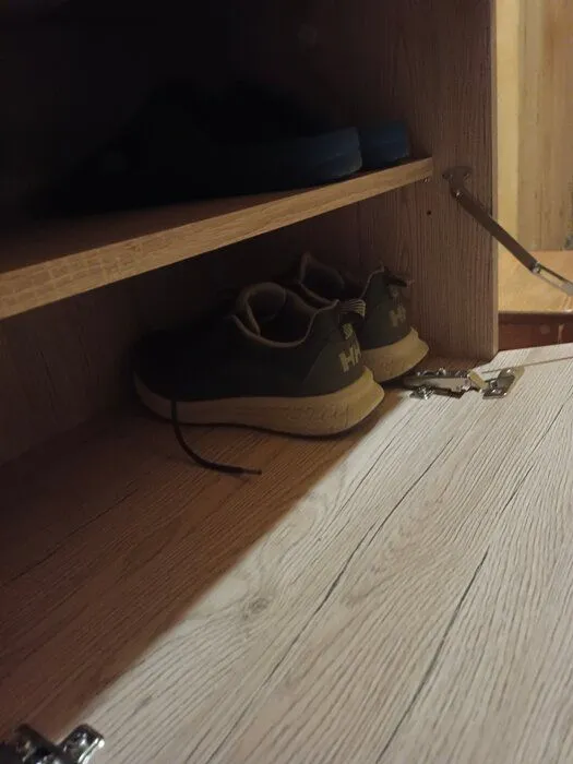 Нижнее отделение высотой 33 см - помещаются высокие ботинки. На каждую полку помещаются по три пары летней или демисезонной обуви для взрослых.
