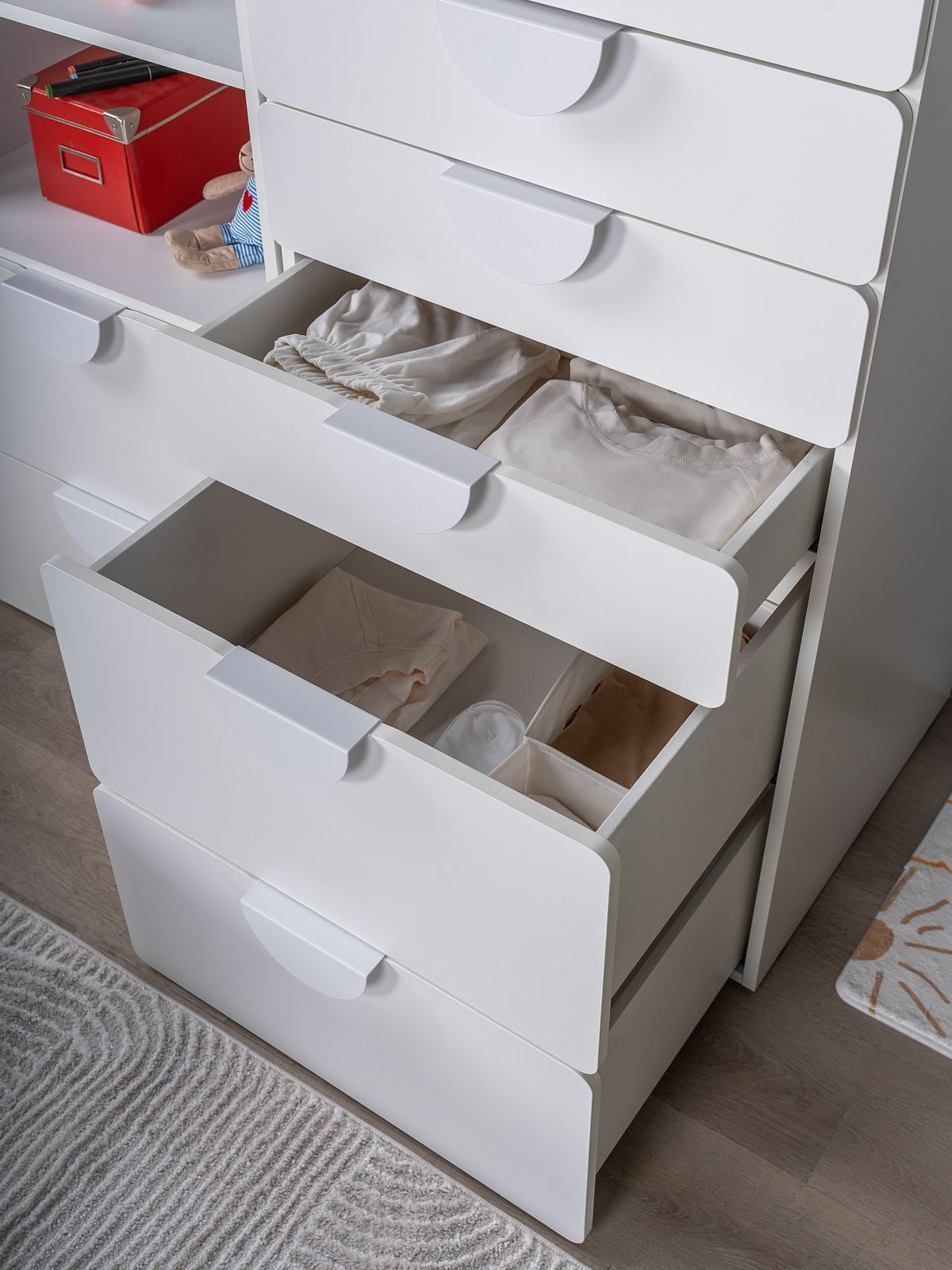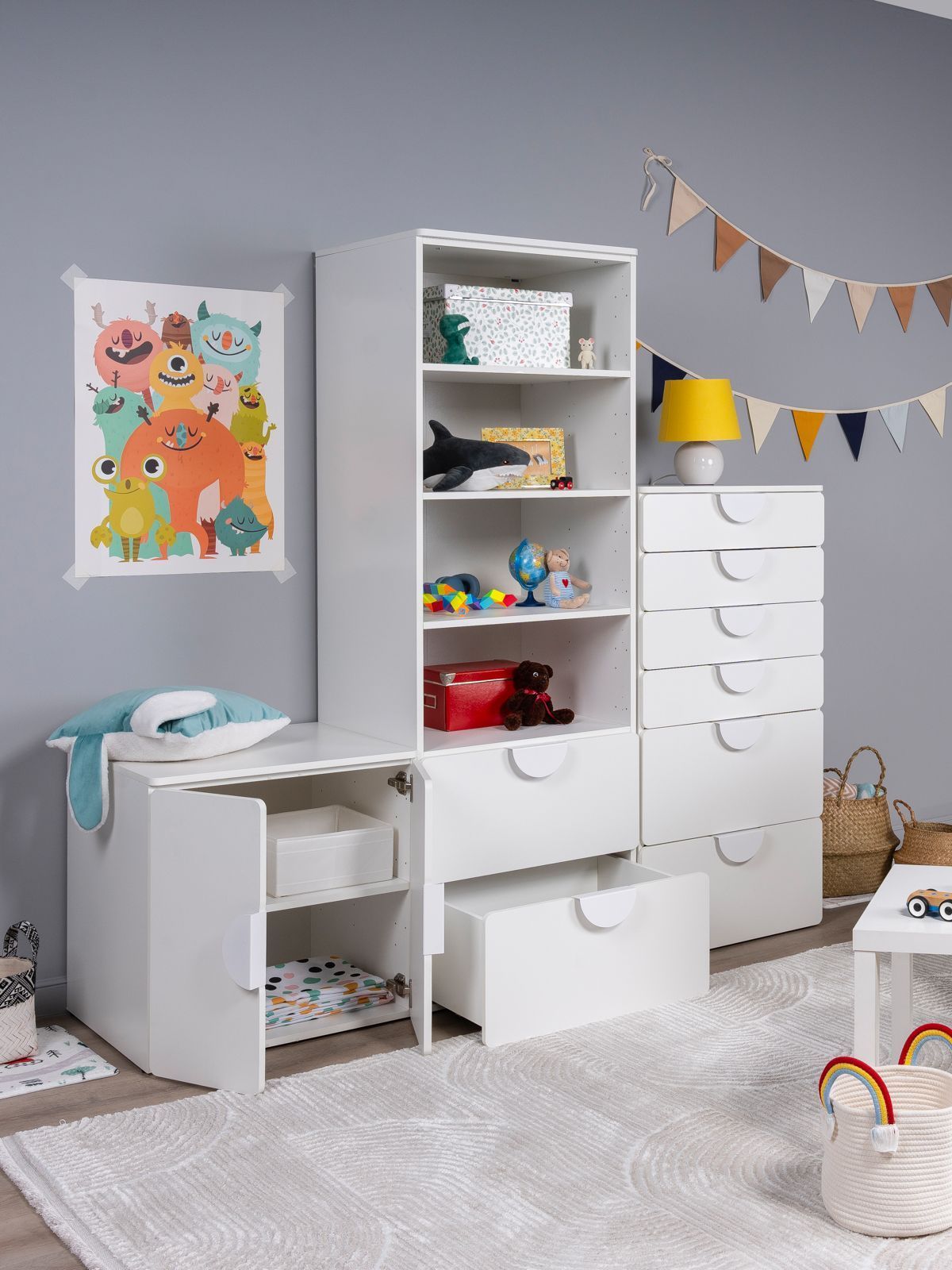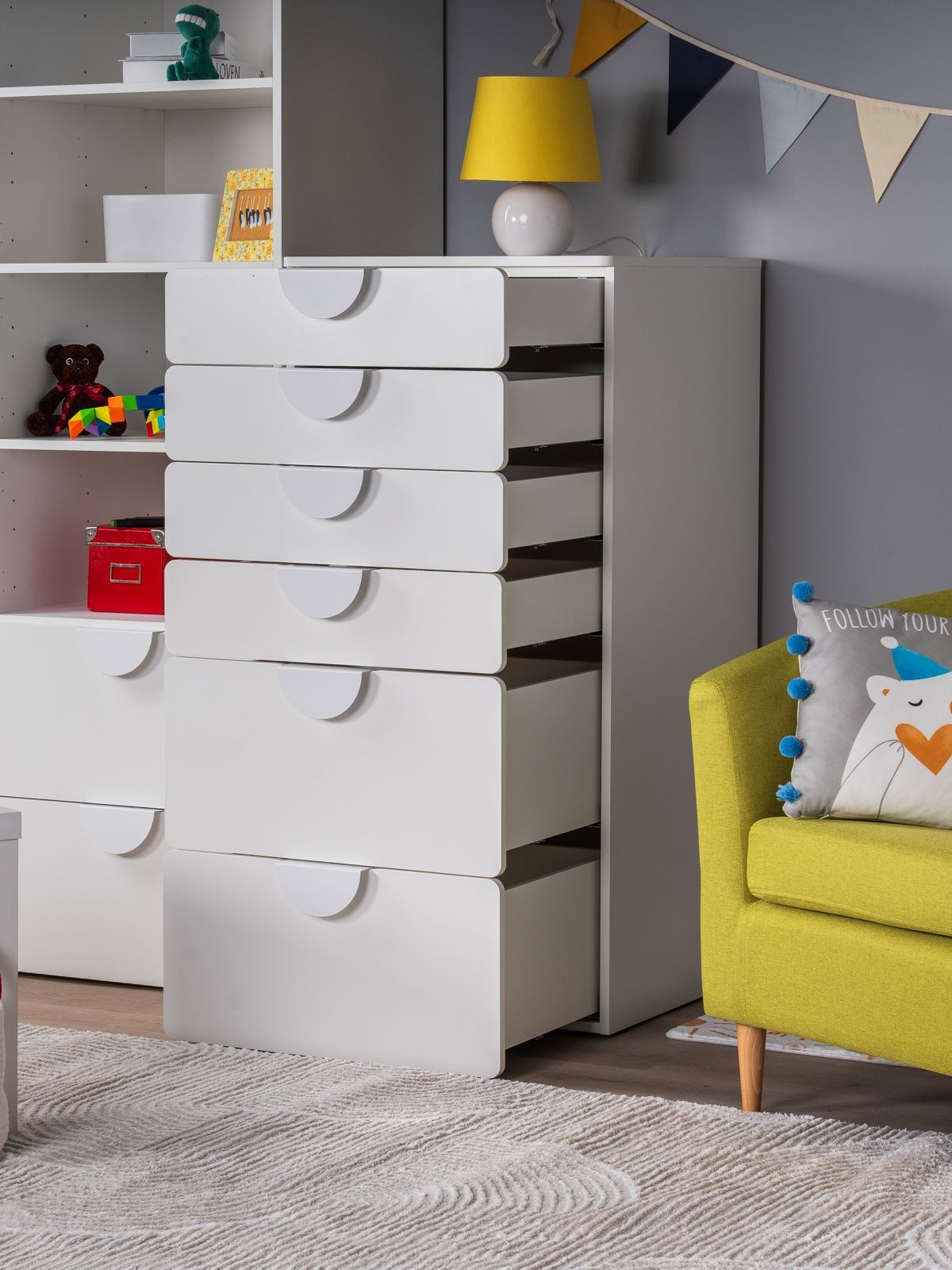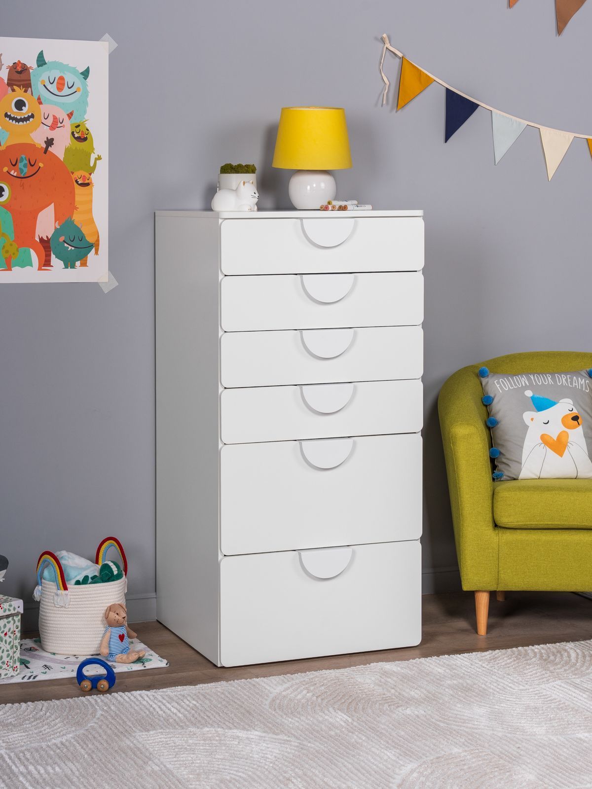 ПИКСИ комод 6 ящиков 60x57x120 ПИКСИ — больше, чем мебель. Умный многофункциональный центр для растущего ребенка! Мечтаете об идеальной мебели для детской, которая растет вместе с вашим малышом? Модульная система ПИКСИ — это именно то, что нужно! Она сочетает в себе стильный дизайн, безупречную функциональность и абсолютную безопасность. Это не просто предмет мебели, а инвестиция в комфорт и гармонию вашего пространства на долгие годы. Умное пространство для игр и порядка! Создайте идеальную систему хранения именно под ваши нужды: • Выбирайте модули с ящиками или дверцами • Легко комбинируйте и достраивайте конструктор • Наращивайте высоту и функциональность когда угодно Ребенок подрос? Появились новые вещи? Нужно больше места? Просто добавьте новый модуль! Собирайте как конструктор - создавайте внушительные системы хранения любого размера без замены мебели. Растёт вместе с вашей семьёй! Почему комод ПИКСИ выбирают заботливые родители? ♡ БЕЗОПАСНОСТЬ ПРЕВЫШЕ ВСЕГО: Закругленные края и мягкие формы защитят от случайных ушибов. Безопасные ручки, об которые невозможно пораниться. ♡ НАДЕЖНОСТЬ И ВЫСОКОЕ КАЧЕСТВО: Направляющие скрытого монтажа с доводчиками. Регулируемые по высоте ножки. Суперстойкое пигментное покрытие: устойчиво к царапинам, влаге и истиранию. Легко очищается от следов фломастеров и красок. Основные характеристики: Узнаваемый дизайн – вдохновлен популярной серией SMASTAD от IKEA. Три цвета фасадов для любого дизайна и настроения. В серии ПИКСИ скамья, кровать, комоды, шкафы и стеллажи. Экологичность – производство соответствует стандартам детской мебели. Качество на уровне IKEA – изготовлен на сертифицированной фабрике в Беларуси. Легкость сборки – понятная инструкция, экономия на услугах сборщика. Надежность – срок службы до 20 лет. Плоская упаковка – безопасная транспортировка. Сочетаемость – гармонично комбинируется с другими коллекциями ГУД ЛАКК. ГУД ЛАКК – знакомая мебель, которую легко купить и собрать!