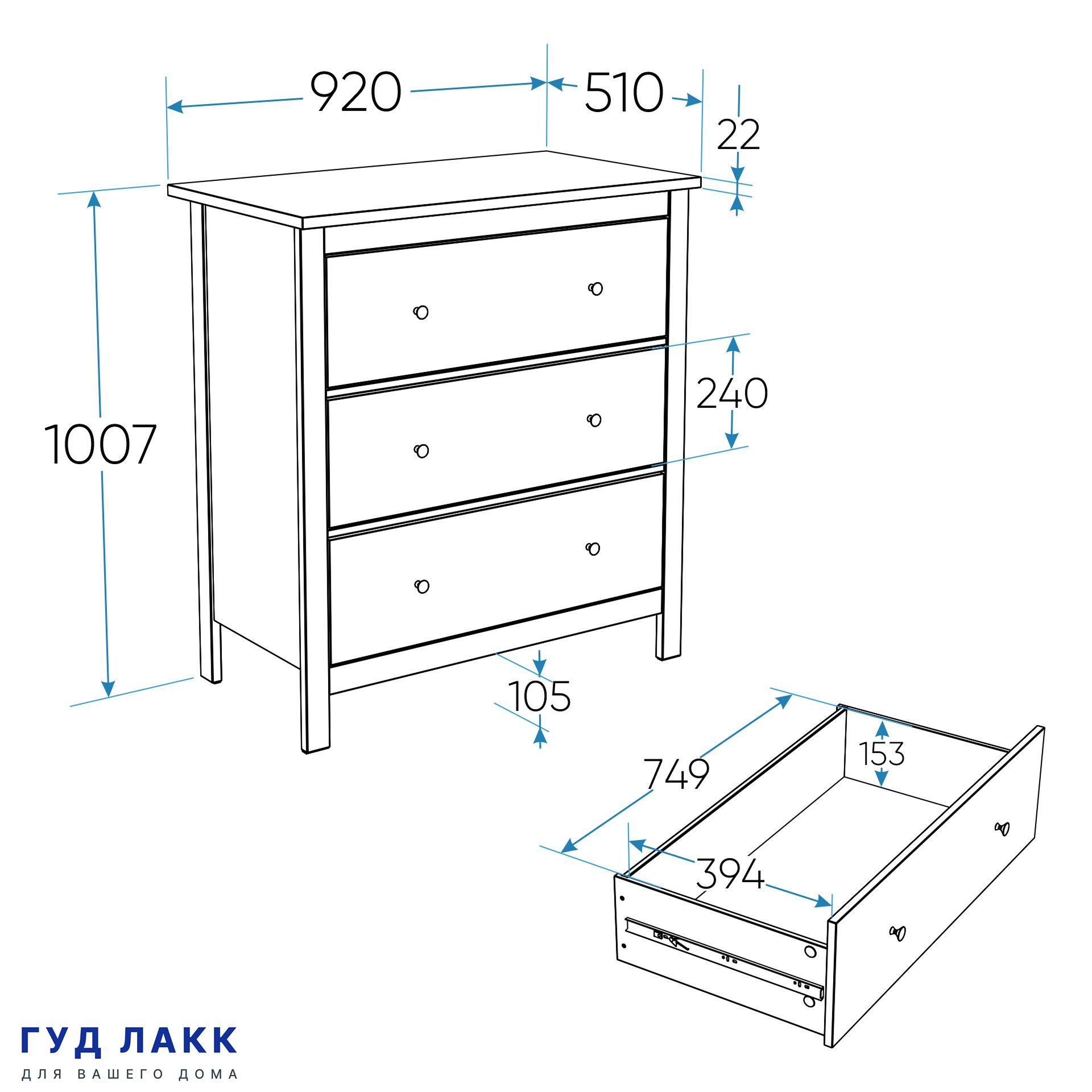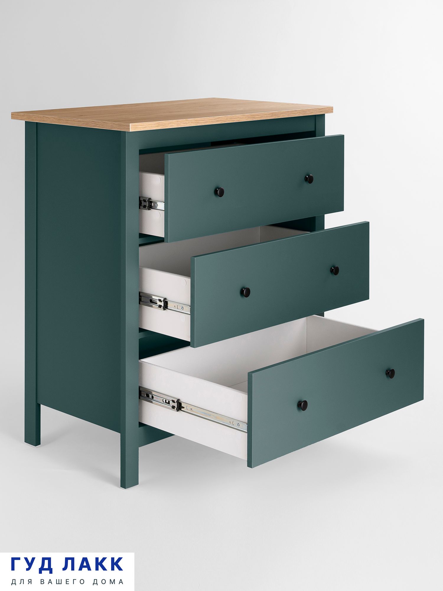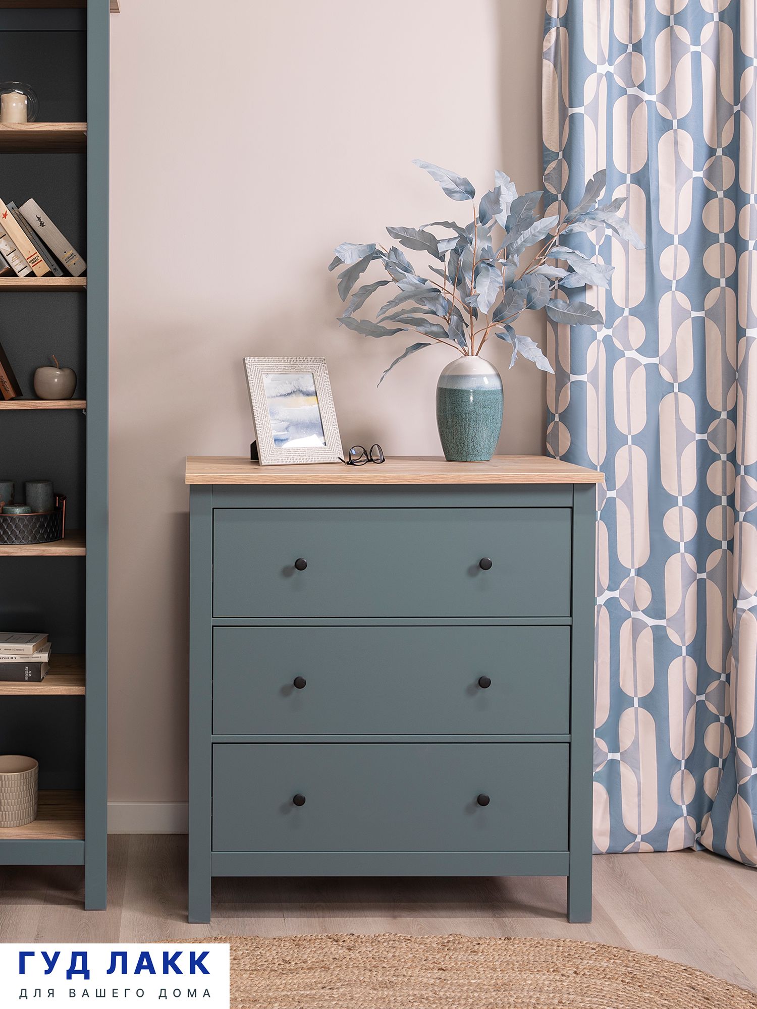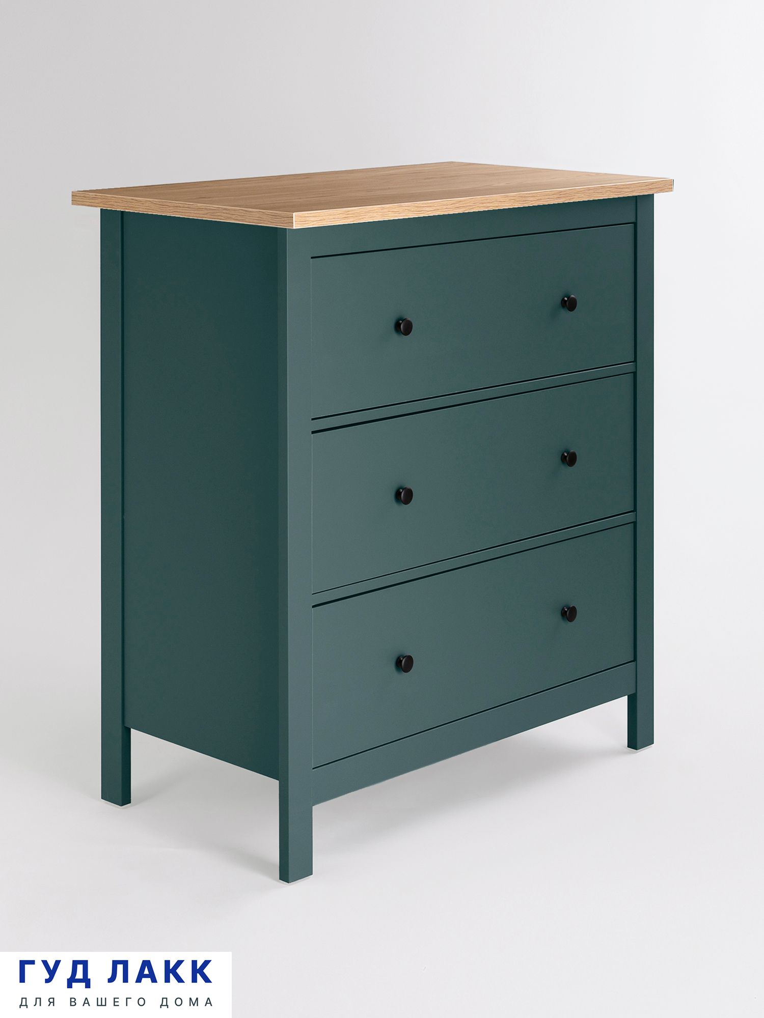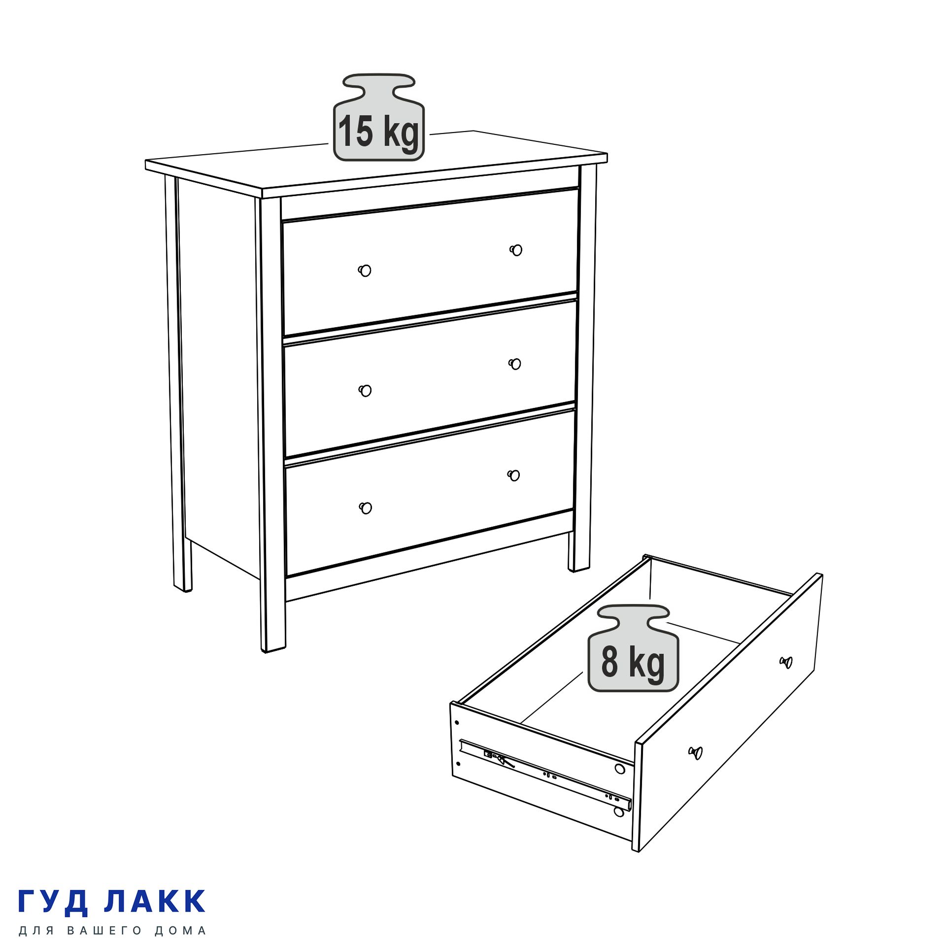 ГУД ЛАКК - знакомая мебель, которую легко купить и собрать! САГА комод 3 ящика— дизайн и функциональность в каждой детали! Серия мебели САГА вдохновлена популярной серией HEMNES в традиционном стиле от IKEA, и станет идеальным дополнением вашей квартиры. Почему САГА комод 3 ящика? Комод САГА — это элегантное и функциональное решение для хранения, которое сочетает в себе стиль, практичность и продуманный дизайн. Он станет идеальным компаньоном для вашей спальни, создавая уют, порядок и добавляя интерьеру изысканности. Комод оснащен тремя вместительными ящиками, где можно удобно хранить одежду, постельное белье, подушки, одеяла или другие вещи. Каждый ящик оборудован направляющими полного выдвижения с доводчиками, которые обеспечивают плавное, бесшумное и легкое открывание. Все части комода, подверженные нагрузке, изготовлены из прочного МДФ, что гарантирует устойчивость, надежность и долговечность даже при активном использовании. Комод САГА отличается современным и элегантным дизайном, который легко впишется в любой интерьер — от классического до минимализма. Он станет не только функциональным элементом, но и изысканным украшением вашей спальни. Комод имеет продуманные размеры, что делает его идеальным для размещения у кровати или в любой другой части комнаты, не загромождая пространство. При этом он предлагает достаточно места для хранения всех необходимых вещей. Комод стоит на стильных ножках, которые добавляют ему легкости и визуальной воздушности. Это также облегчает уборку под ним, поддерживая чистоту в комнате. Комод САГА — это идеальное сочетание стиля, функциональности и качества. Он поможет организовать пространство в вашей спальне, создаст уютную атмосферу и станет надежным помощником в повседневной жизни. Дополните свою спальню этим комодом и наслаждайтесь комфортом, порядком и эстетикой!