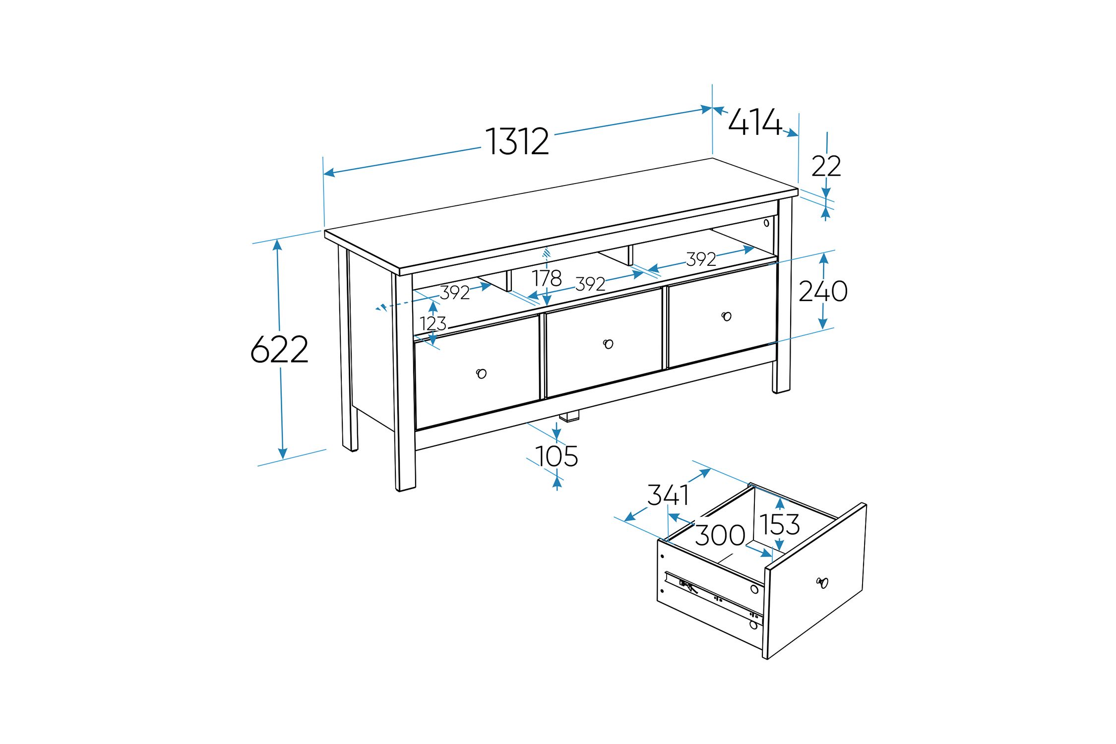 Тумба ТВ Сага, 3 ящика, 131х42х63 см, кашемир/ясень