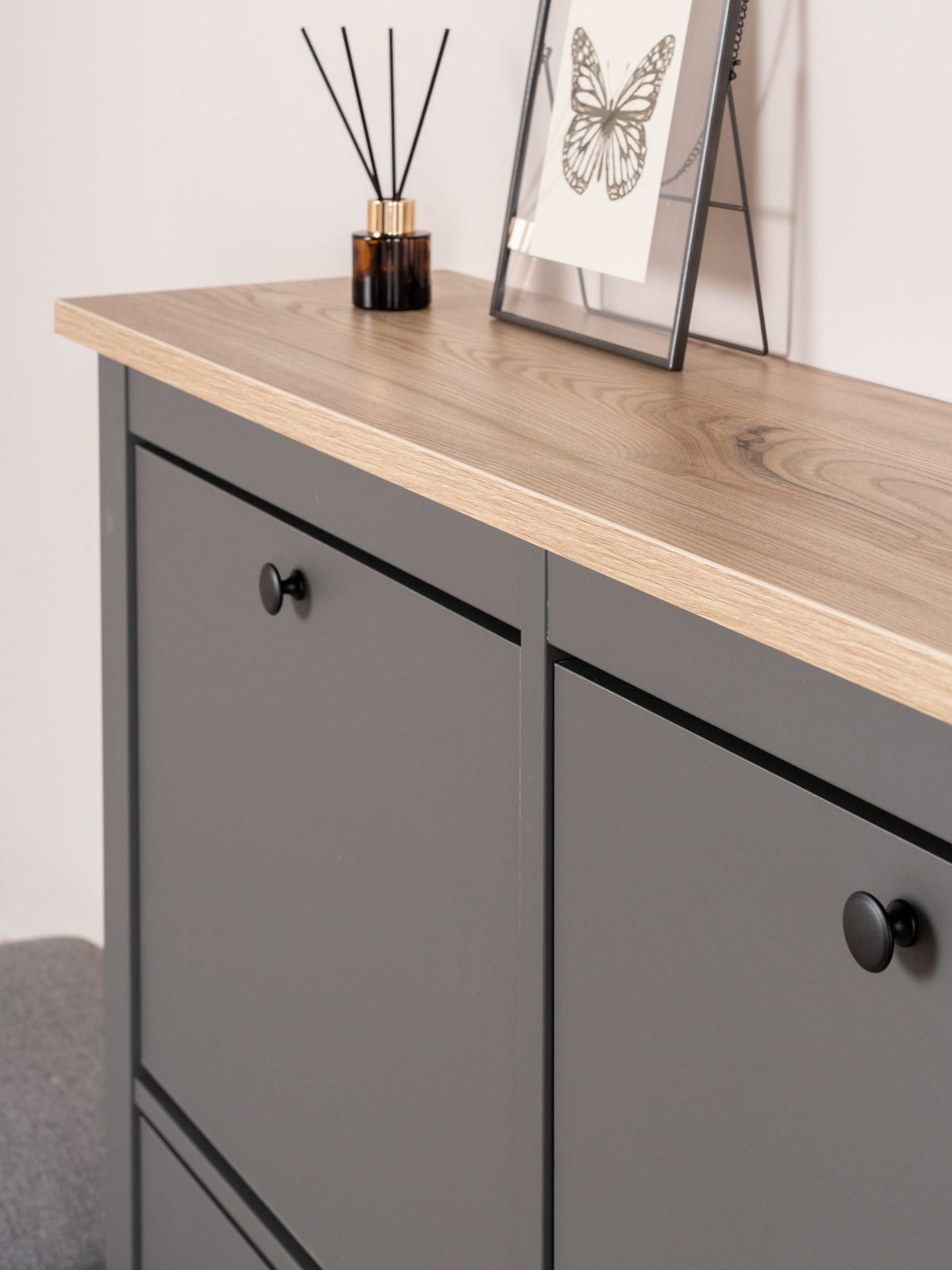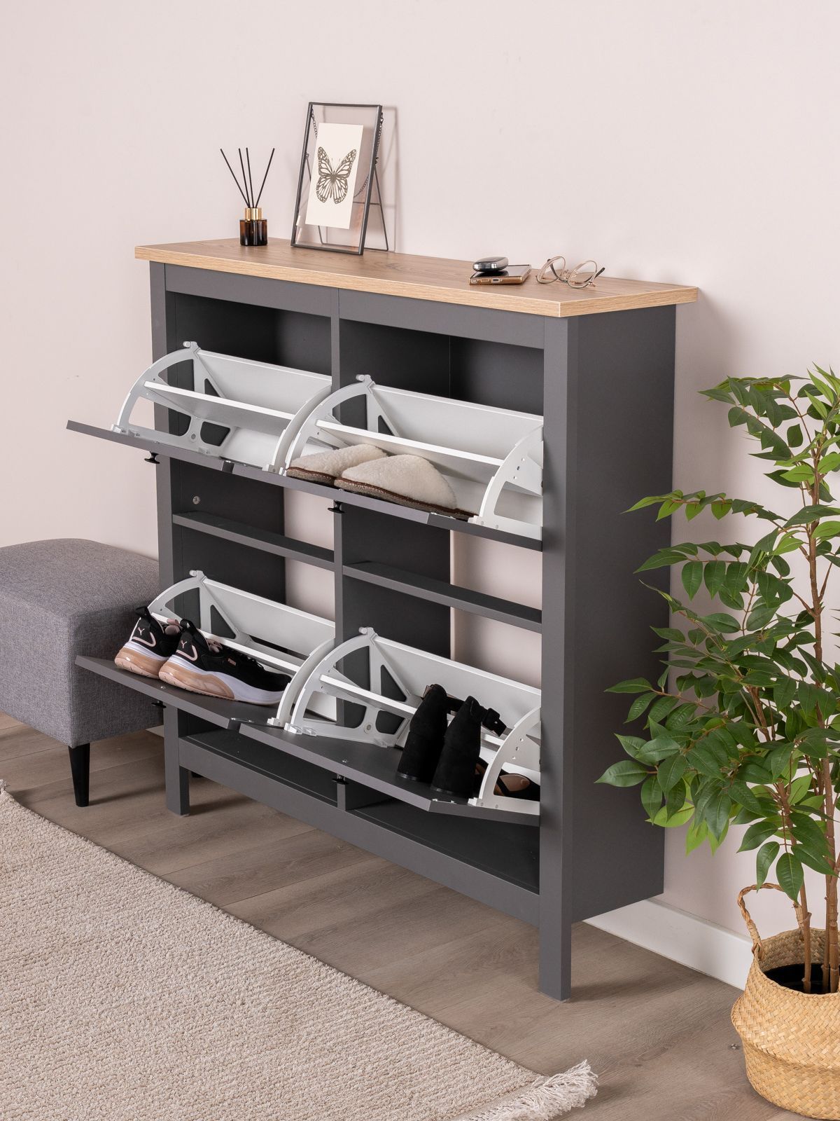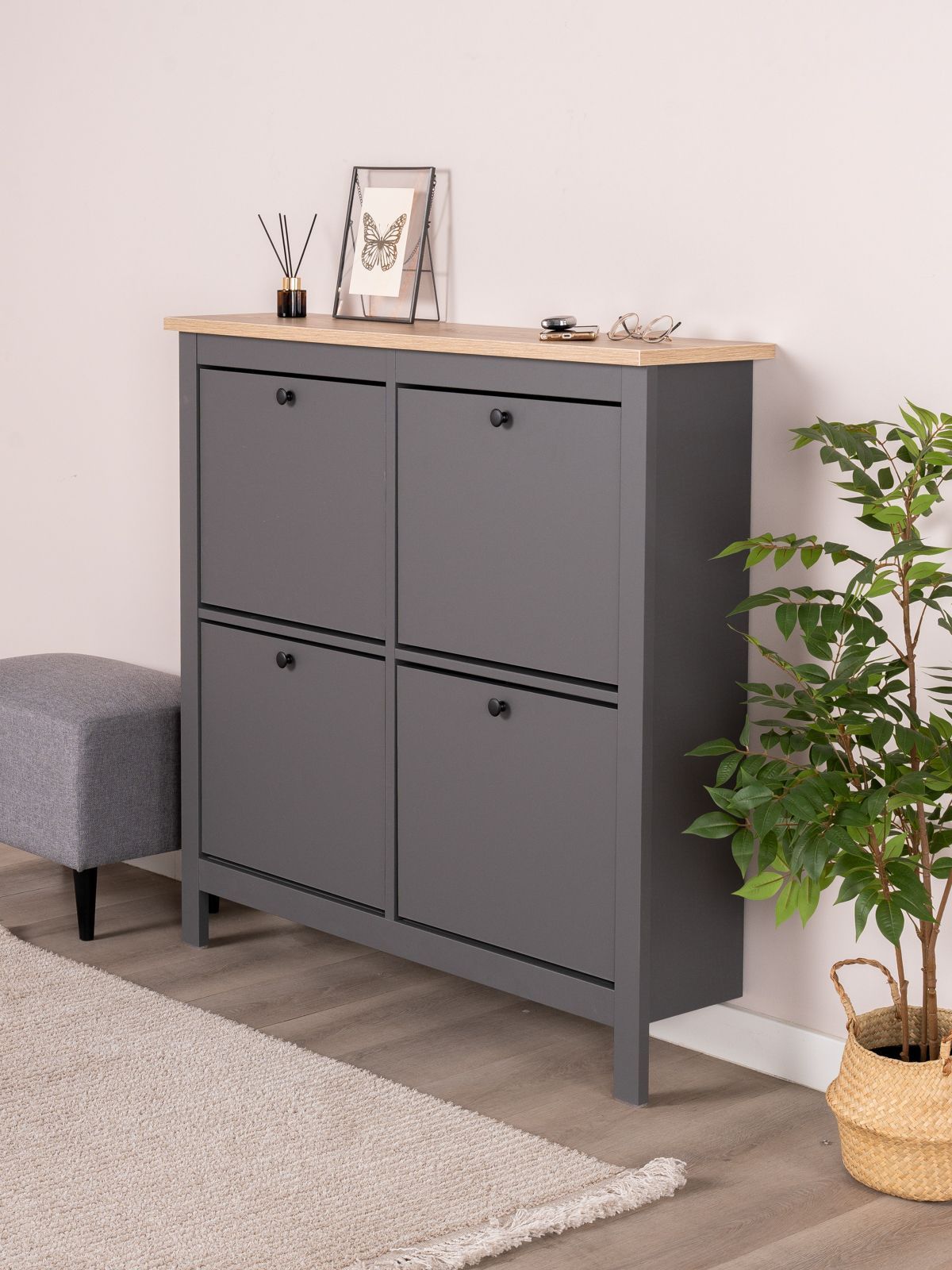 САГА тумба для обуви 113х108 — элегантность и качество в каждой детали! Серия САГА вдохновлена популярной серией HEMNES от IKEA, и станет идеальным дополнением вашей квартиры. Почему выбирают САГА тумба для обуви 113х108? Тумба для обуви САГА — это стильное и функциональное решение для хранения, которое идеально впишется в любой интерьер, будь то прихожая, гардеробная или даже балкон. Ее продуманный дизайн и удобные особенности делают ее незаменимым помощником в организации порядка. Главная особенность тумбы — четыре откидывающихся полки, на которых можно с комфортом разместить до двенадцати пар обуви. Это позволяет легко доставать и убирать обувь, сохраняя ее в идеальном состоянии. Тумба оснащена надежным магнитными фиксаторами, которые обеспечивают безопасность и предотвращает случайное падение полки. Вы можете быть уверены, что обувь останется на своем месте. Не верхнюю полку можно поставить декор или кинуть связку ключей, что очень удобно в прихожей. Несколько тумб можно разместить в ряд, создавая стильное и практичное горизонтальное решение для хранения обуви. Это отличный вариант для больших семей или любителей обуви. Тумба отличается компактными размерами, что делает ее идеальной для небольших пространств. При этом она легко вписывается в различные стили интерьера — от современного до классического. Тумба для обуви САГА — это не просто место для хранения, а стильный и функциональный элемент вашего интерьера. Она поможет поддерживать порядок, сэкономит пространство и станет удобным решением для хранения вашей обуви. Дополните свою прихожую или гардеробную этой тумбой и наслаждайтесь идеальной организацией!