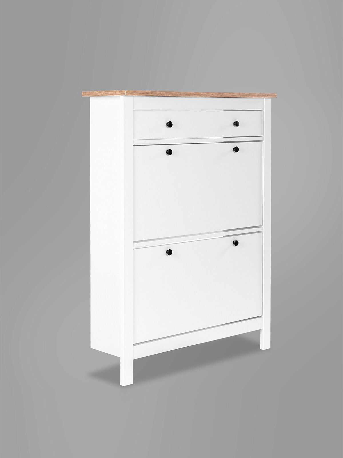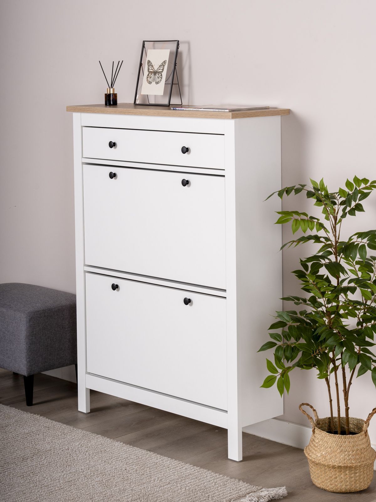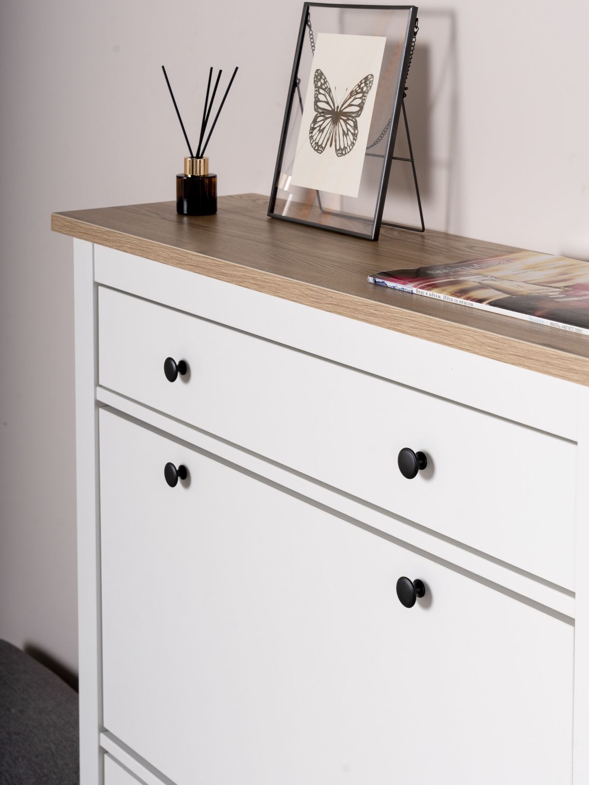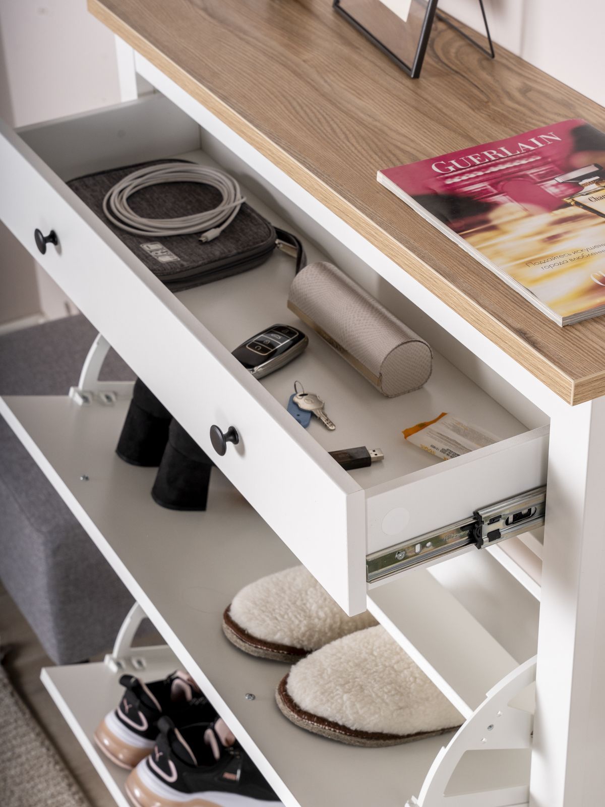 САГА тумба для обуви 92х122— элегантность и качество в каждой детали! Серия мебели САГА вдохновлена популярной серией HEMNES от IKEA, и станет идеальным дополнением вашей квартиры. Почему выбирают САГА тумба для обуви 92х122? Тумба для обуви САГА — это компактное, стильное и функциональное решение для хранения, которое идеально впишется в любой интерьер, будь то прихожая, гардеробная или даже балкон. Ее продуманный дизайн и удобные особенности делают ее незаменимым помощником в организации порядка. Главная особенность тумбы — две откидывающихся полки, на которых можно с комфортом разместить до восьми пар обуви. Это позволяет легко доставать и убирать обувь, сохраняя ее в идеальном состоянии. Тумба оснащена надежными магнитными фиксаторами, которые обеспечивают безопасность и предотвращают случайное падение полки. Вы можете быть уверены, что обувь останется на своем месте. Также у тумбы есть выдвижной ящик, направляющими полного выдвижения и доводчиками, в котором удобно хранить ключи, и другие мелочи. Тумба для обуви САГА — это не просто место для хранения, а стильный и функциональный элемент вашего интерьера. Она поможет поддерживать порядок, сэкономит пространство и станет удобным решением для хранения вашей обуви. Дополните свою прихожую или гардеробную этой тумбой и наслаждайтесь идеальной организацией!