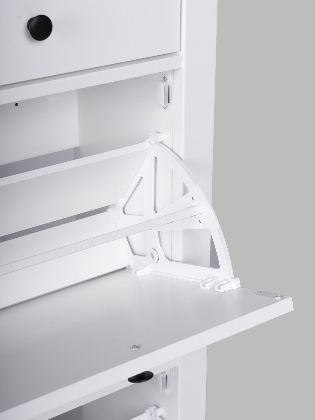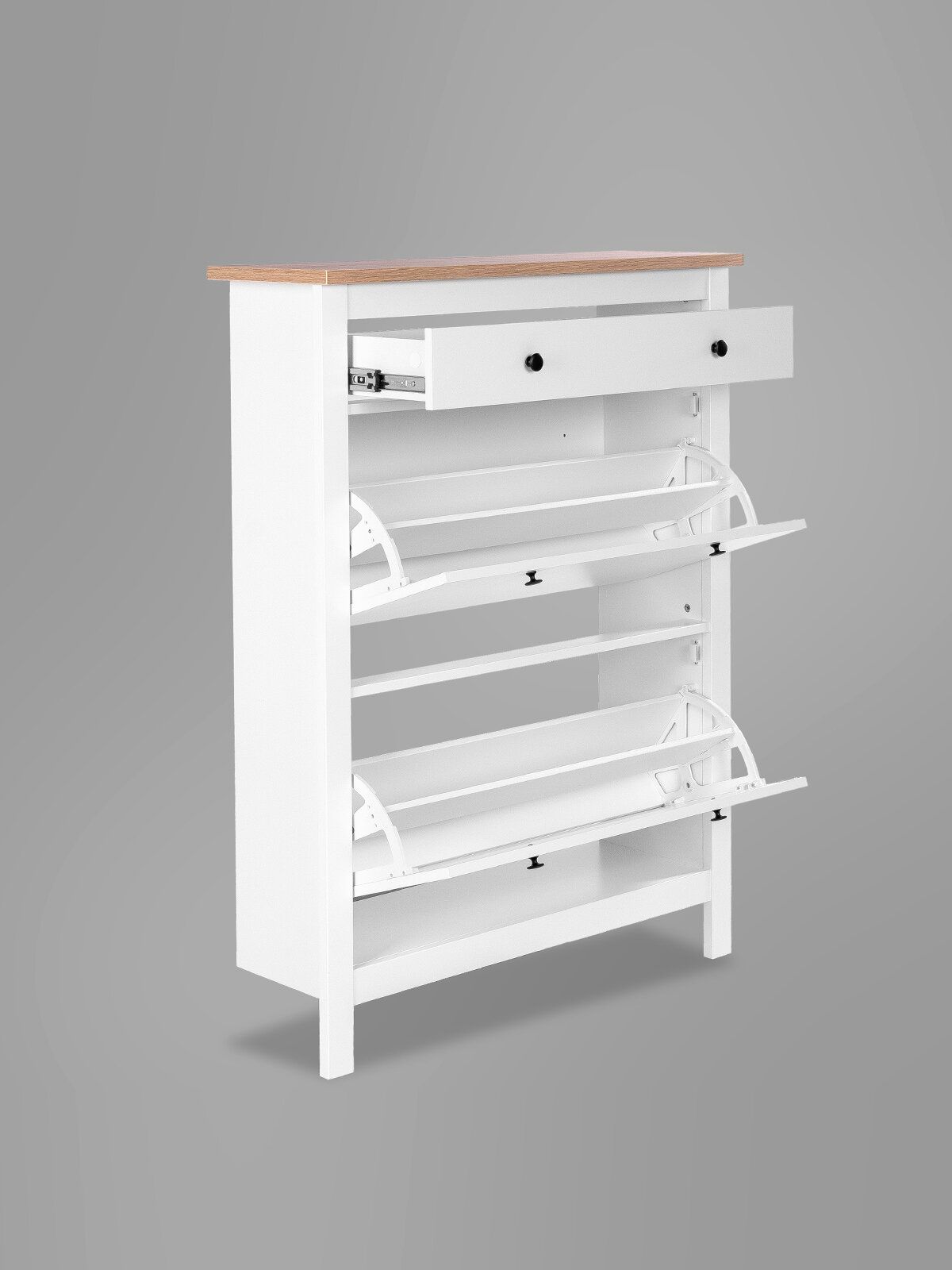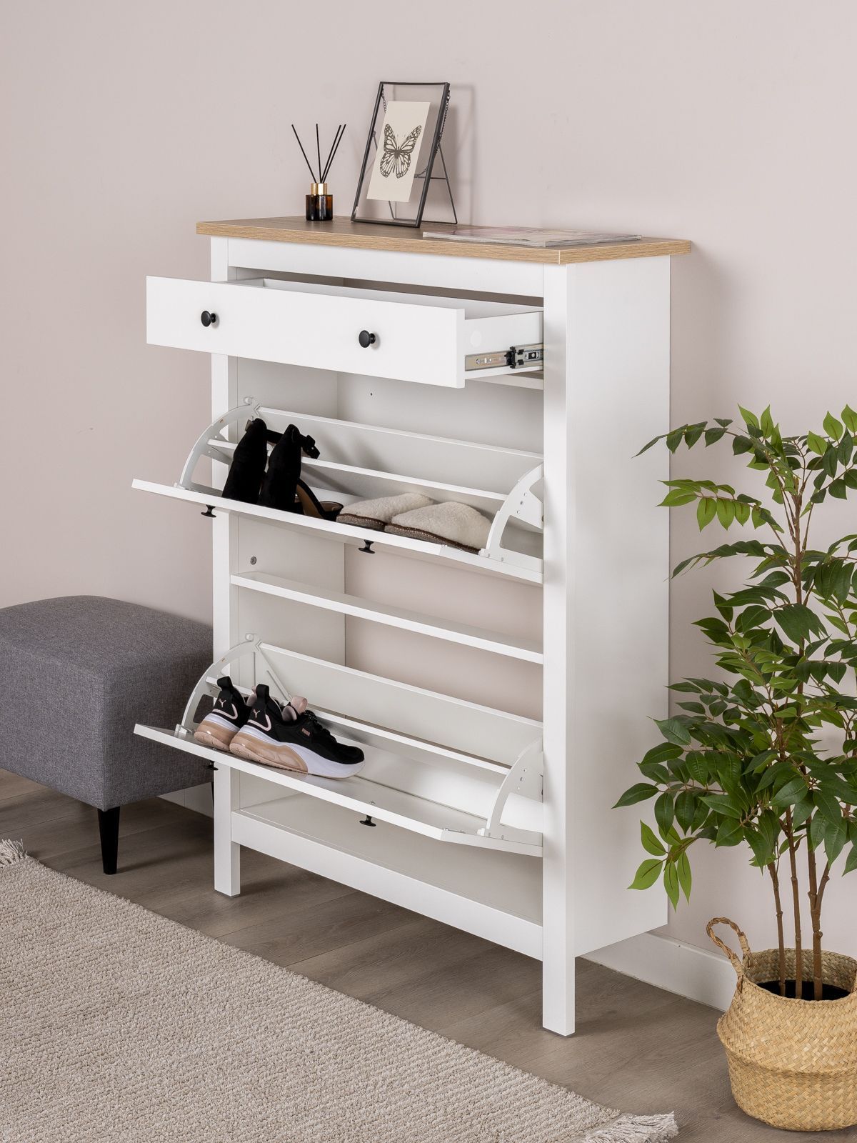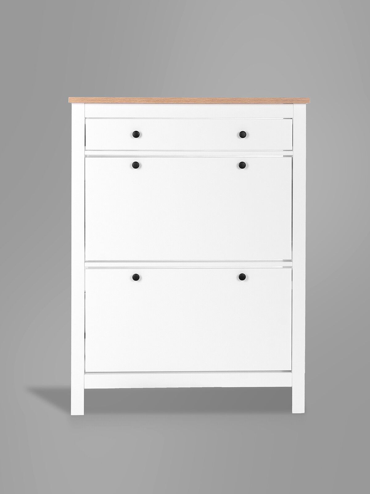 САГА тумба для обуви 92х122— элегантность и качество в каждой детали! Серия мебели САГА вдохновлена популярной серией HEMNES от IKEA, и станет идеальным дополнением вашей квартиры. Почему выбирают САГА тумба для обуви 92х122? Тумба для обуви САГА — это компактное, стильное и функциональное решение для хранения, которое идеально впишется в любой интерьер, будь то прихожая, гардеробная или даже балкон. Ее продуманный дизайн и удобные особенности делают ее незаменимым помощником в организации порядка. Главная особенность тумбы — две откидывающихся полки, на которых можно с комфортом разместить до восьми пар обуви. Это позволяет легко доставать и убирать обувь, сохраняя ее в идеальном состоянии. Тумба оснащена надежными магнитными фиксаторами, которые обеспечивают безопасность и предотвращают случайное падение полки. Вы можете быть уверены, что обувь останется на своем месте. Также у тумбы есть выдвижной ящик, направляющими полного выдвижения и доводчиками, в котором удобно хранить ключи, и другие мелочи. Тумба для обуви САГА — это не просто место для хранения, а стильный и функциональный элемент вашего интерьера. Она поможет поддерживать порядок, сэкономит пространство и станет удобным решением для хранения вашей обуви. Дополните свою прихожую или гардеробную этой тумбой и наслаждайтесь идеальной организацией!