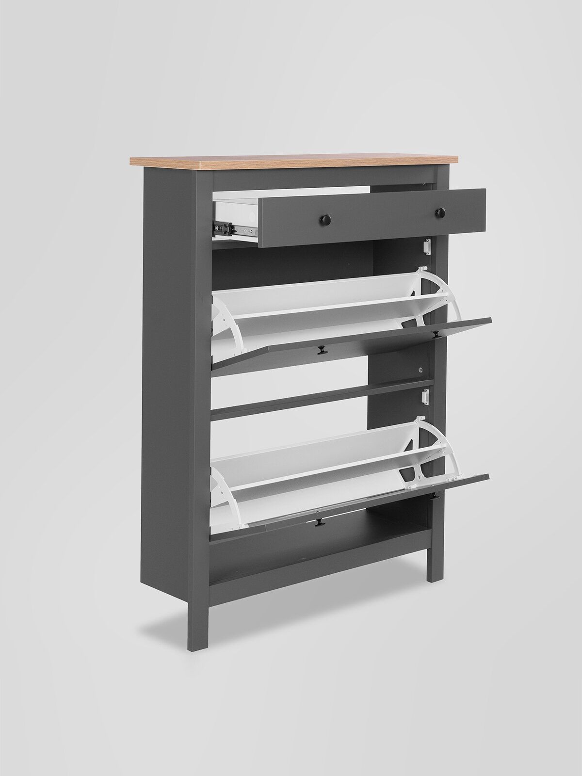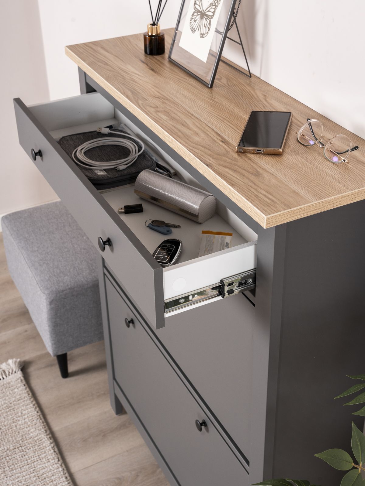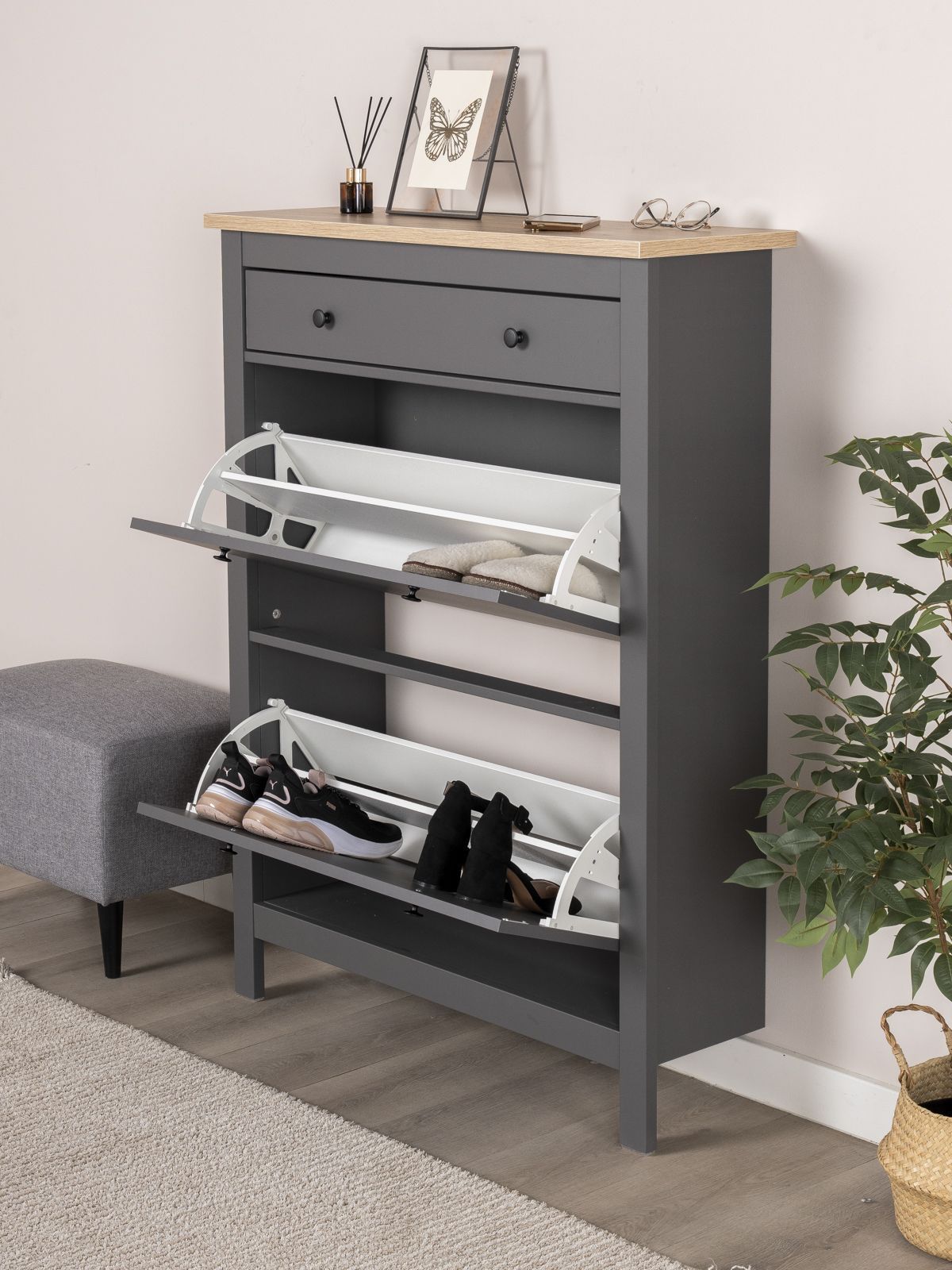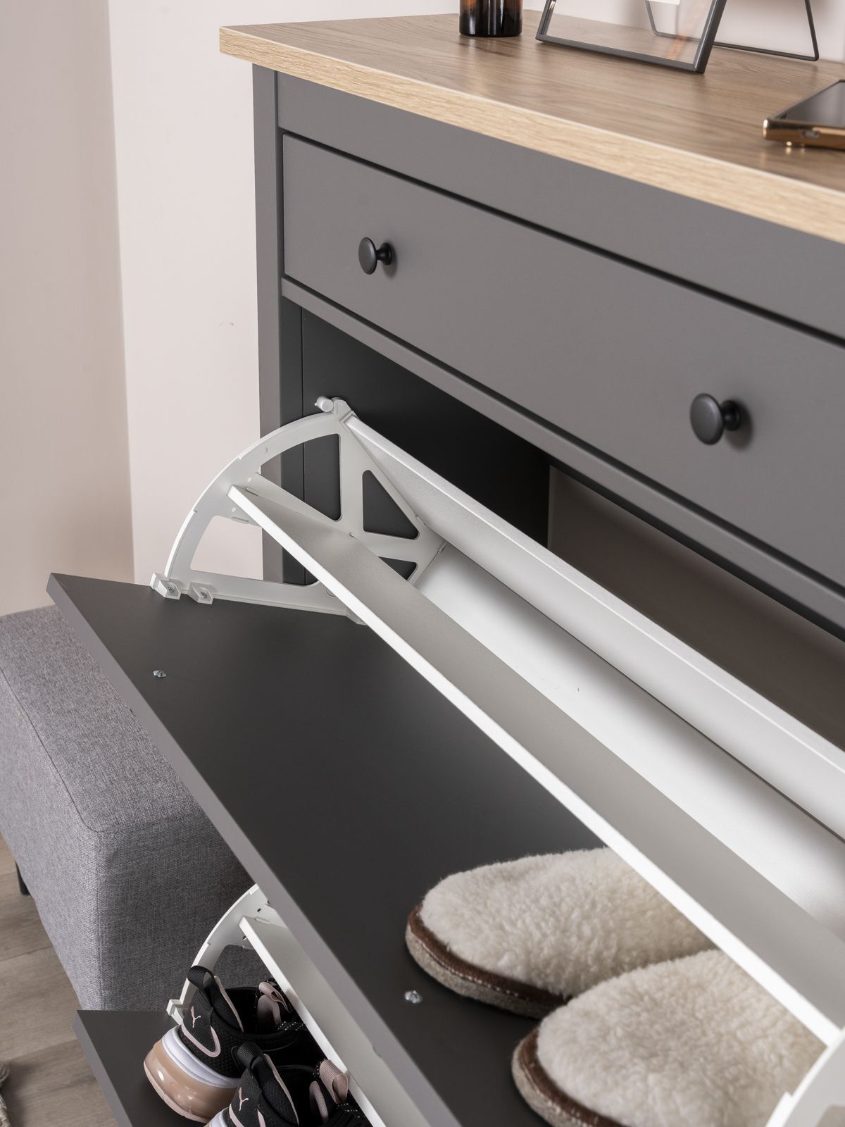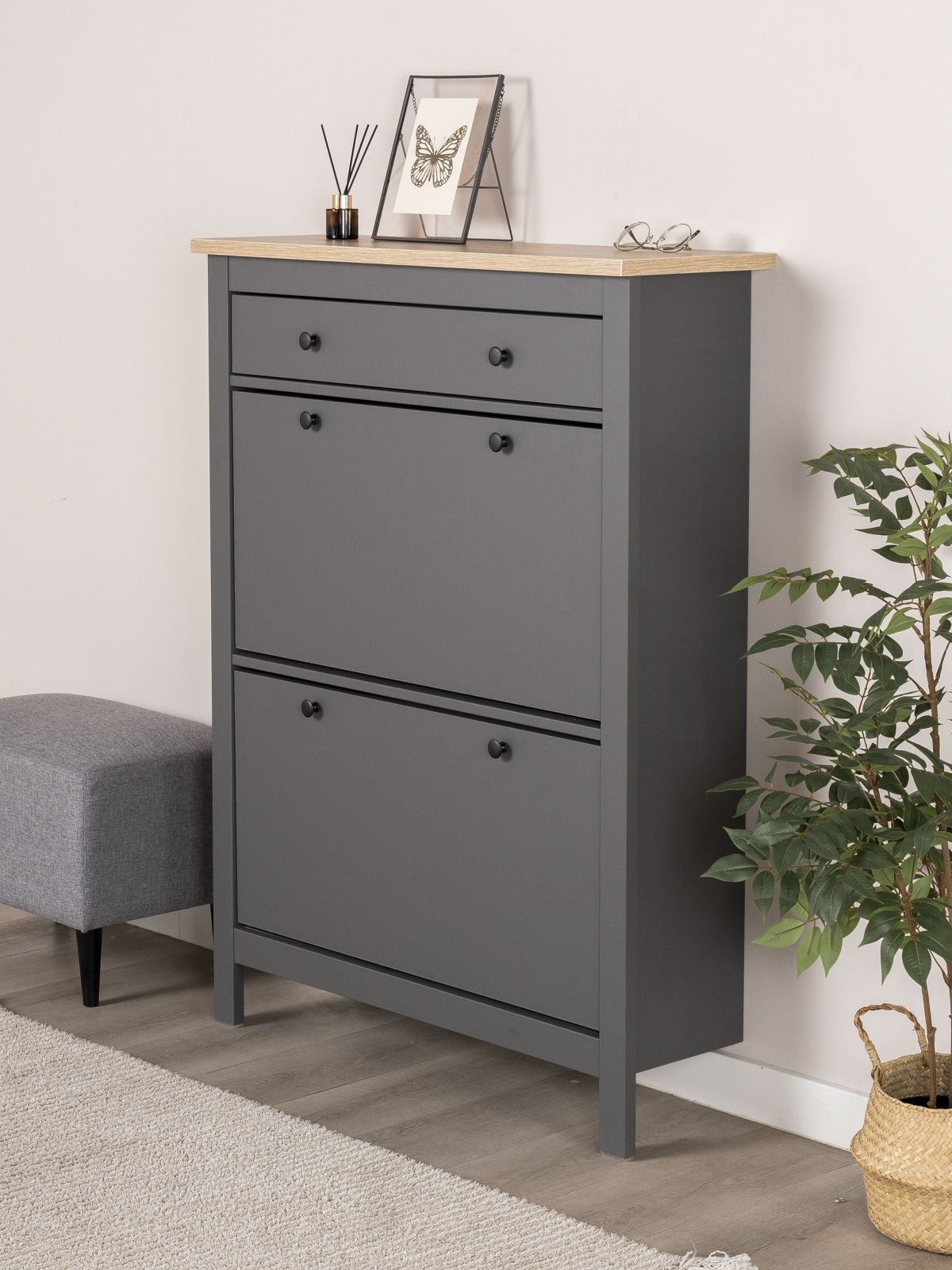 ГУД ЛАКК - знакомая мебель, которую легко купить и собрать! САГА тумба для обуви 92х122— элегантность и качество в каждой детали! Серия мебели САГА вдохновлена популярной серией HEMNES от IKEA, и станет идеальным дополнением вашей квартиры. Почему выбирают САГА тумба для обуви 92х122? Тумба для обуви САГА — это компактное, стильное и функциональное решение для хранения, которое идеально впишется в любой интерьер, будь то прихожая, гардеробная или даже балкон. Ее продуманный дизайн и удобные особенности делают ее незаменимым помощником в организации порядка. Главная особенность тумбы — две откидывающихся полки, на которых можно с комфортом разместить до восьми пар обуви. Это позволяет легко доставать и убирать обувь, сохраняя ее в идеальном состоянии. Тумба оснащена надежными магнитными фиксаторами, которые обеспечивают безопасность и предотвращают случайное падение полки. Вы можете быть уверены, что обувь останется на своем месте. Также у тумбы есть выдвижной ящик, направляющими полного выдвижения и доводчиками, в котором удобно хранить ключи, и другие мелочи. Тумба для обуви САГА — это не просто место для хранения, а стильный и функциональный элемент вашего интерьера. Она поможет поддерживать порядок, сэкономит пространство и станет удобным решением для хранения вашей обуви. Дополните свою прихожую или гардеробную этой тумбой и наслаждайтесь идеальной организацией!