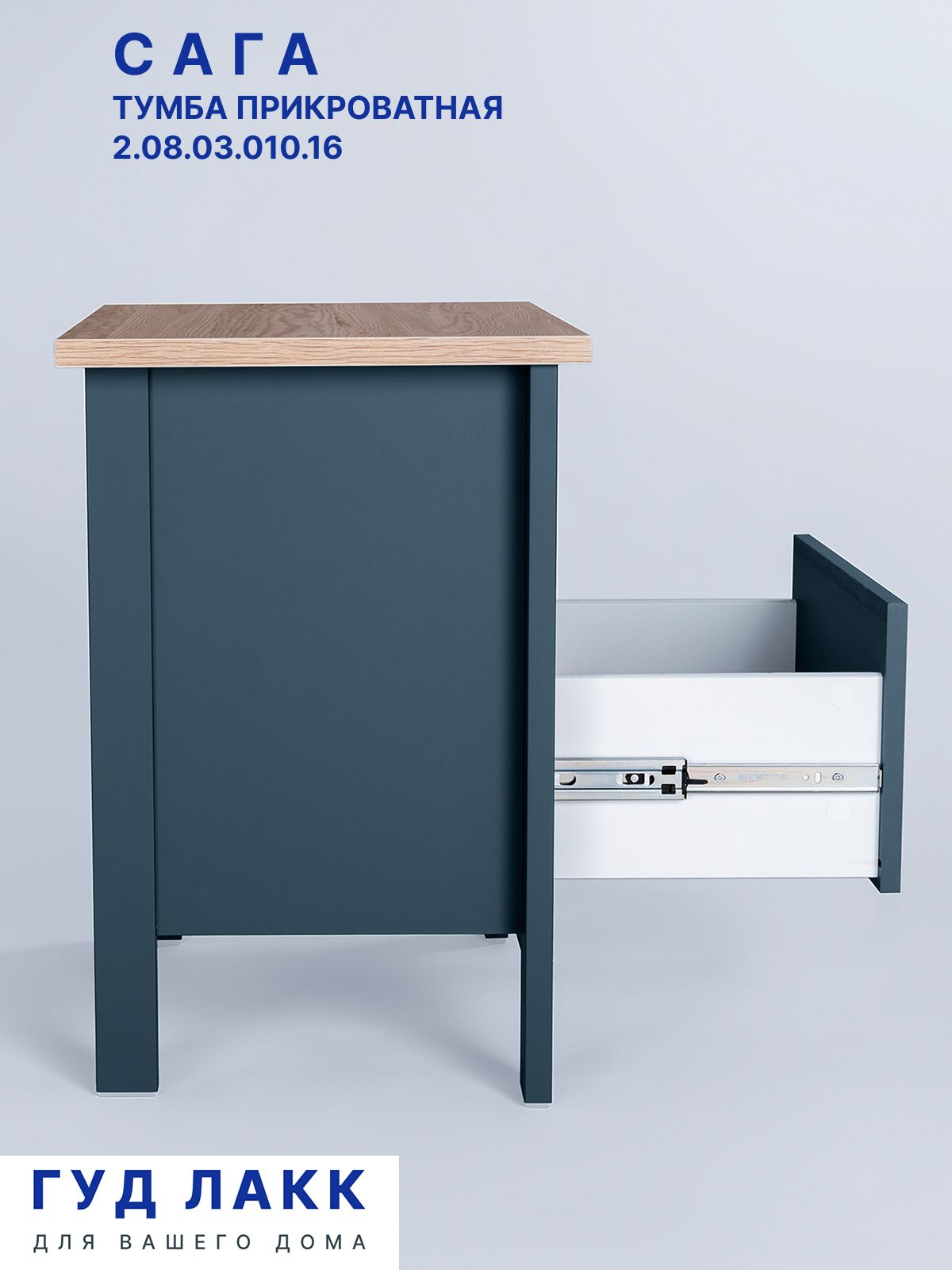 Тумба прикроватная Сага, с доводчиками, 51х41х62 см, темно-бирюзовая/ясень