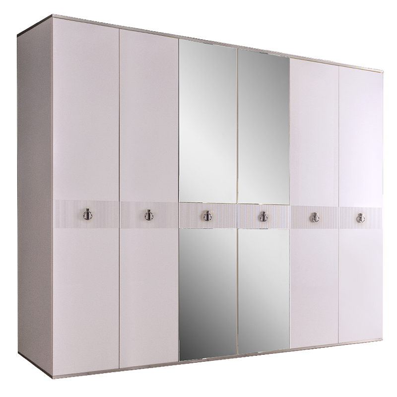В дизайне 6-ти створчатого шкафа с зеркалами Rimini Solo преобладает лаконичность и простота, особый акцент сделан на утонченности и умеренности декора. Приятные и модные цвета, элегантные планки под золото или серебро, ручки-кольца в аналогичном оттенке и фрезерованные вставки в этой модели достигли идеальной гармонии.