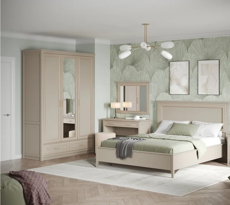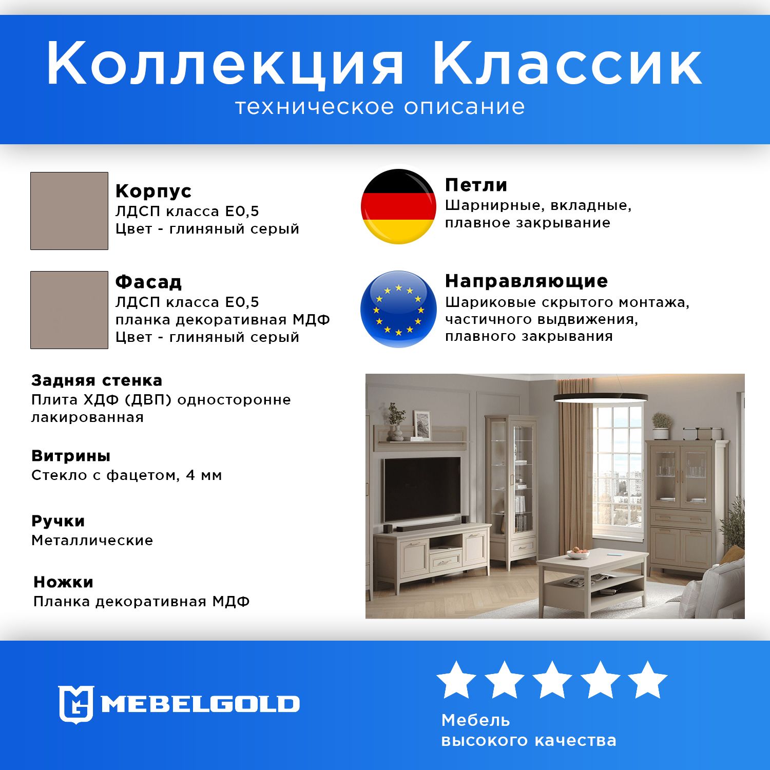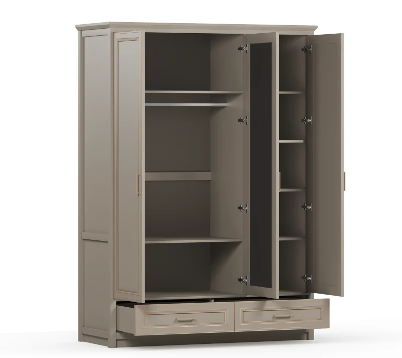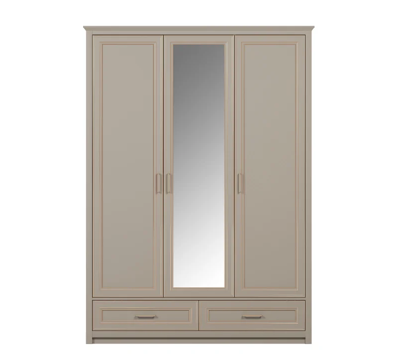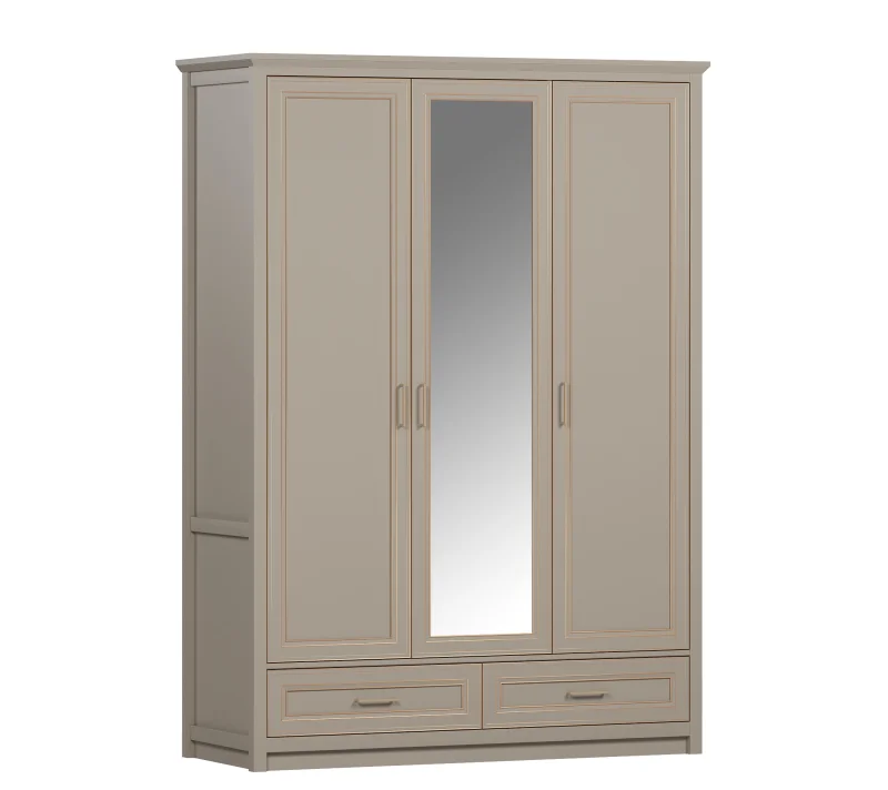 Трехдверный шкаф глиняно-серого цвета Classic с матовым покрытием предупреждает быстрое загрязнение поверхности. За ней легко ухаживать: не требуются частые уборки и специальные средства. Фасады шкафа имеют шикарный вид, дополненный эффектным золочением, высокими ножками и ручками под медь.