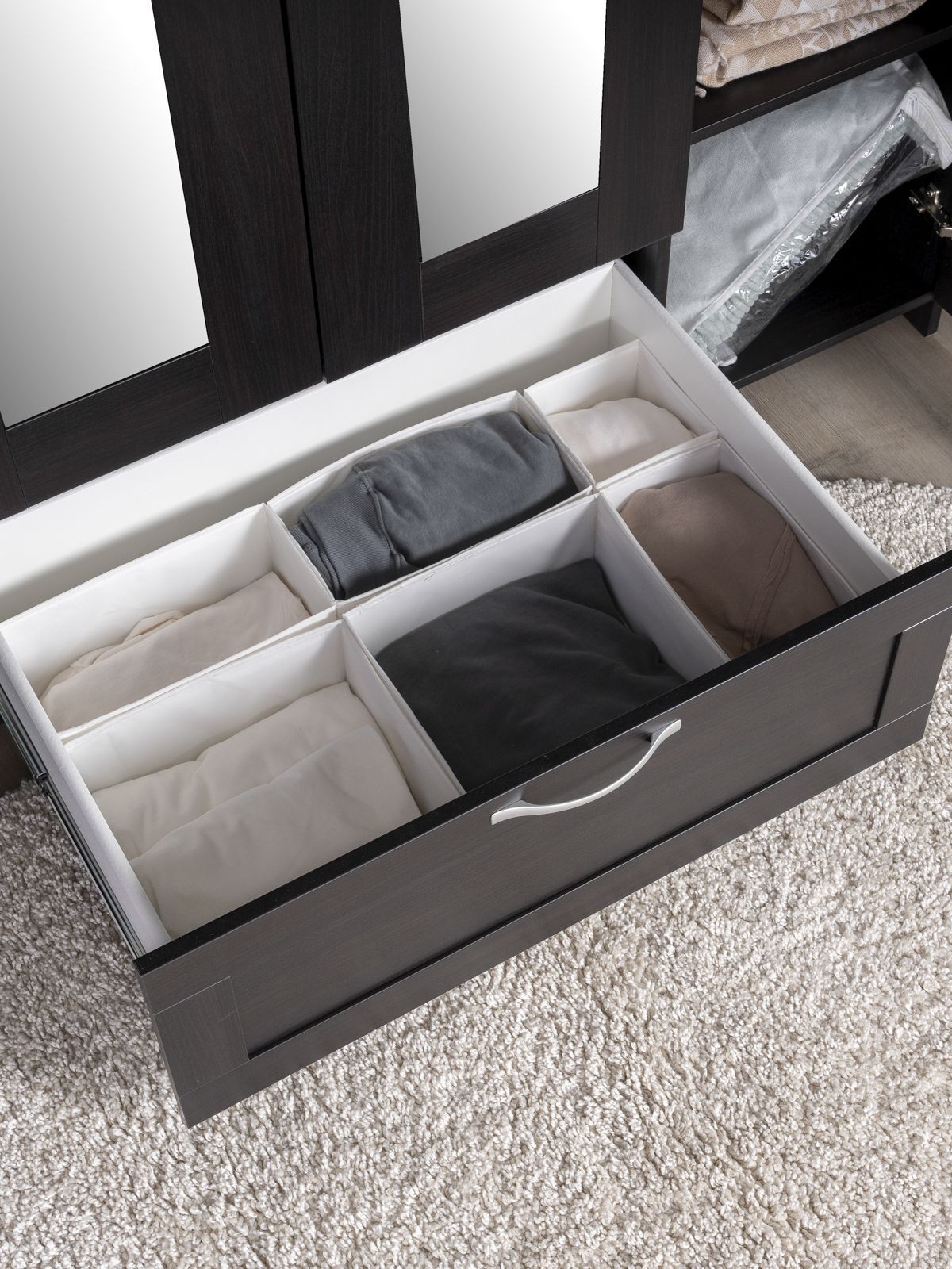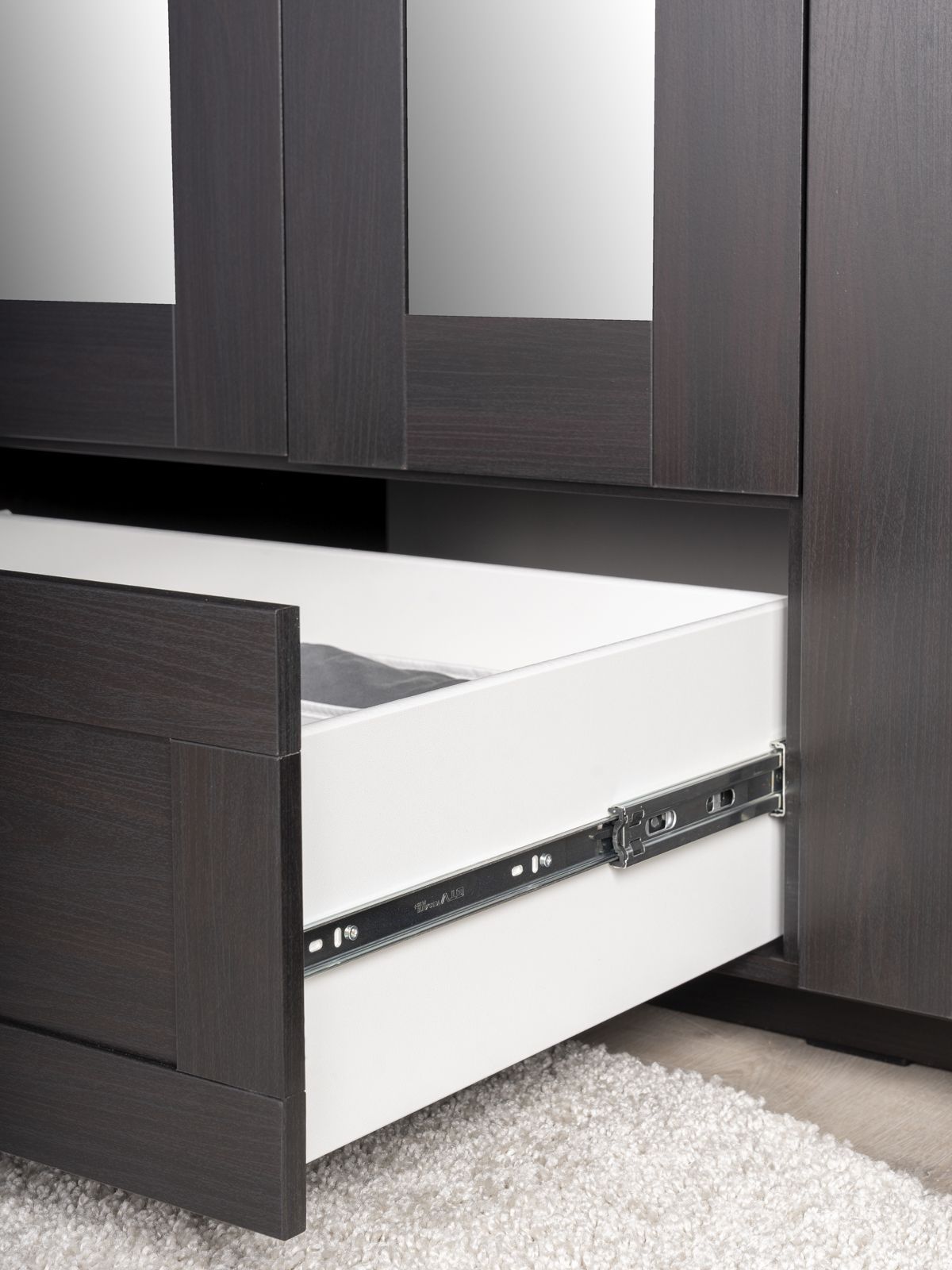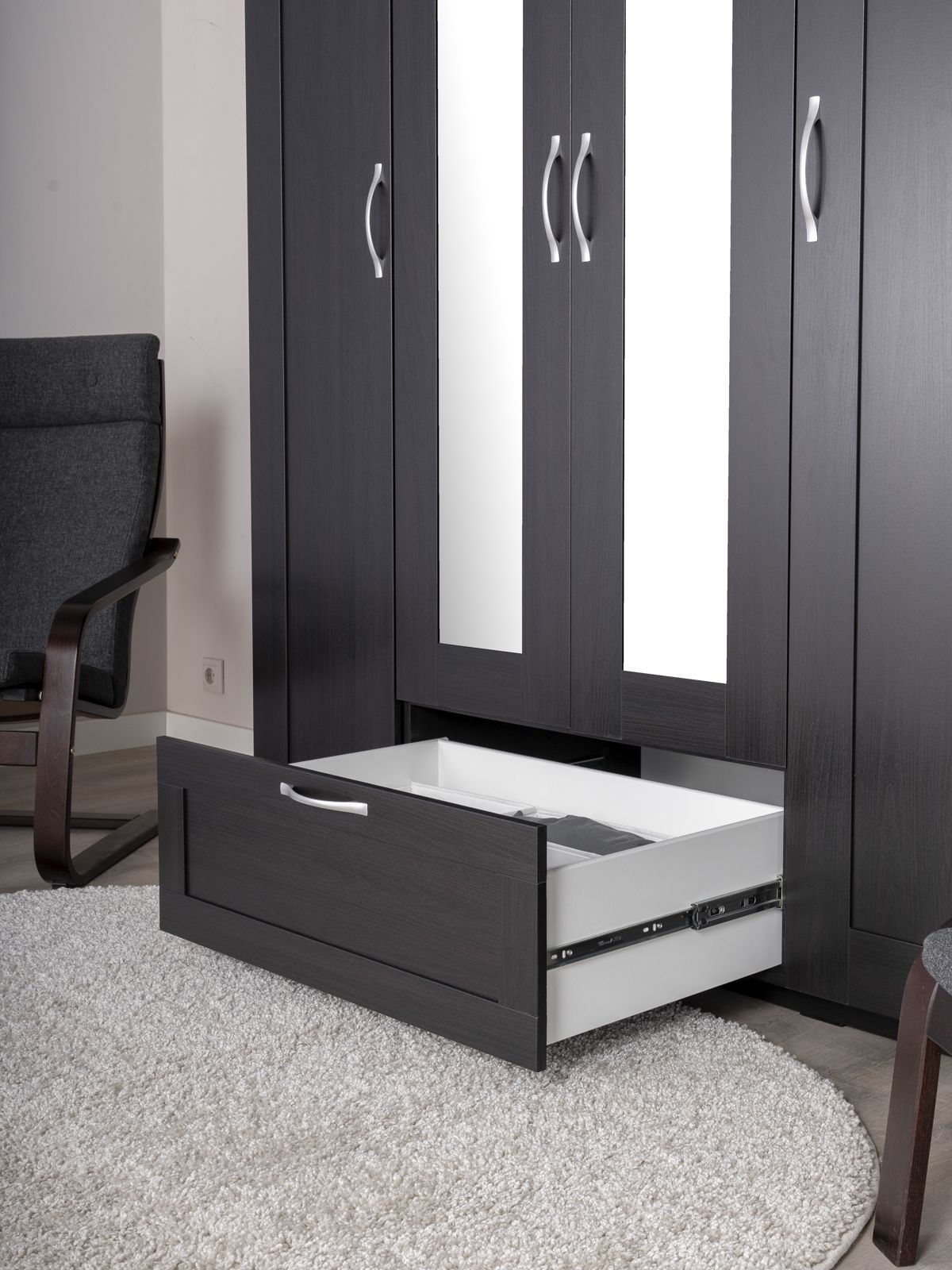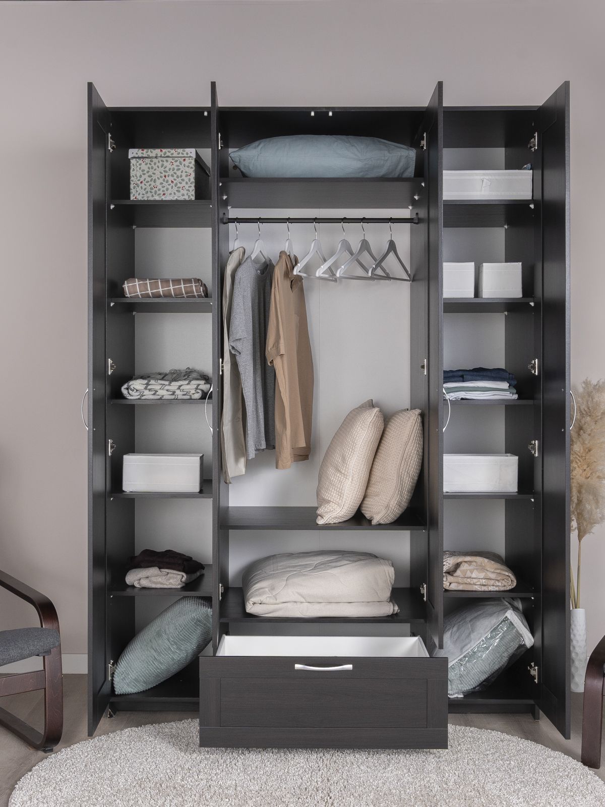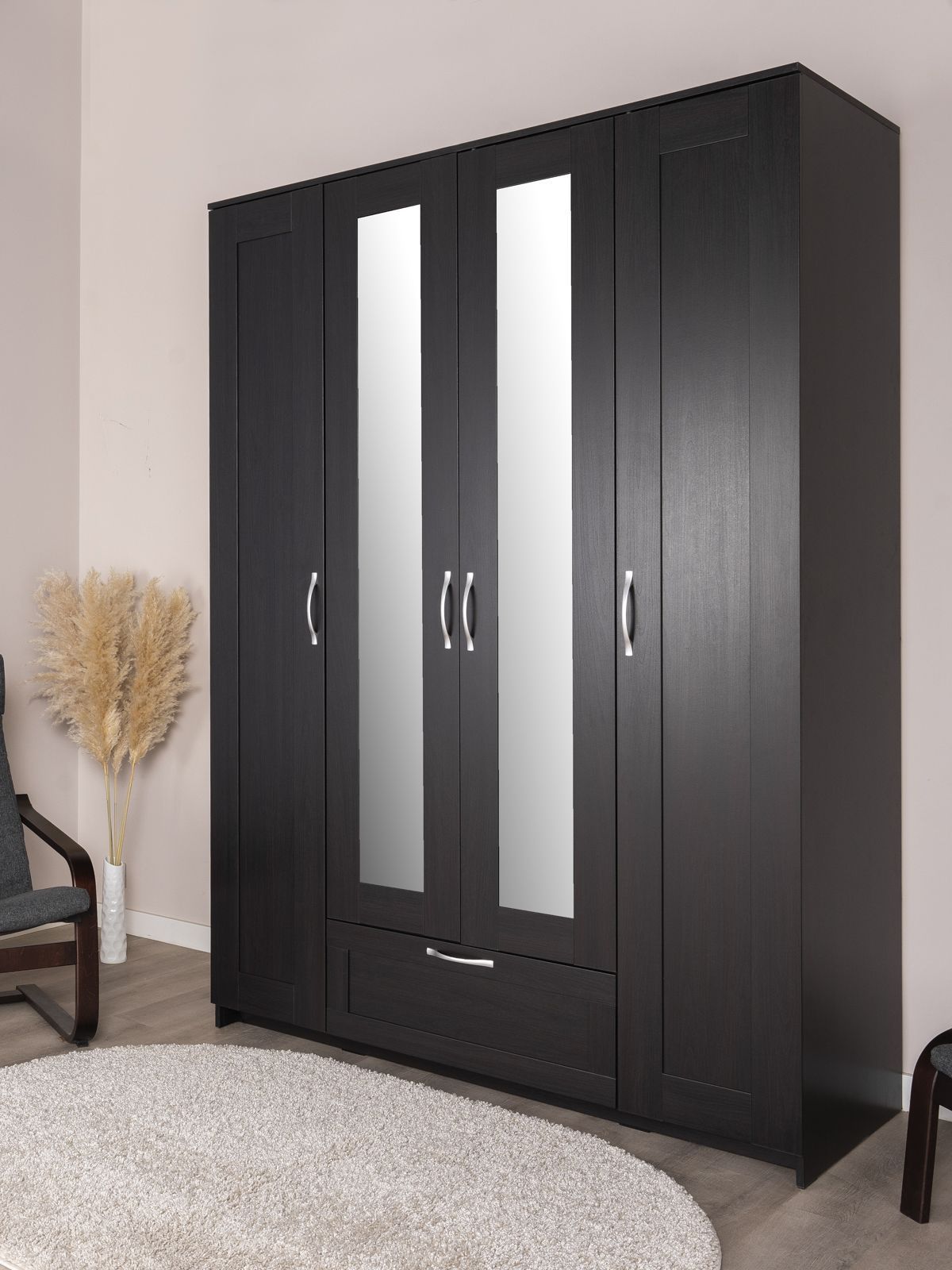 ГУД ЛАКК - знакомая мебель, которую легко купить и собрать! СИРИУС шкаф комбинированный 4 двери и 1 ящик с зеркалом— элегантность и качество в каждой детали! Серия мебели СИРИУС вдохновлена популярной серией BRIMNES от IKEA, и станет идеальным дополнением вашей квартиры. Почему выбирают СИРИУС шкаф комбинированный 4 двери и 1 ящик с зеркалом? Этот шкаф СИРИУС с увеличенной высотой — 220 см, для максимального использования пространства! Шкаф Сириус — это стильное и функциональное решение для хранения, которое сочетает в себе практичность, элегантный дизайн и продуманную организацию пространства. Филенчатые фасады придают шкафу изысканный вид, делая его украшением любого интерьера, а зеркало позволит подобрать идеальный образ. Внутри шкафа расположена прочная платяная штанга, на которой можно разместить одежду на плечиках, сохраняя ее в идеальном состоянии. Просторное внутреннее пространство с тремя дверцами позволяет организовать хранение одежды, обуви, аксессуаров или других вещей. Внешний выдвижной ящик с удобной ручкой предназначен для хранения мелких вещей, аксессуаров или белья. Его можно использовать, не открывая дверцы шкафа, что делает доступ к вещам быстрым и удобным. Так же внутри есть 12 полок, которые можно отрегулировать по высоте для разных вещей. Шкаф имеет оптимальные размеры, что делает его подходящим для небольших помещений, таких как спальни, прихожие, гостевые комнаты или даже гардеробные. Он не занимает много места, при этом остается вместительным.