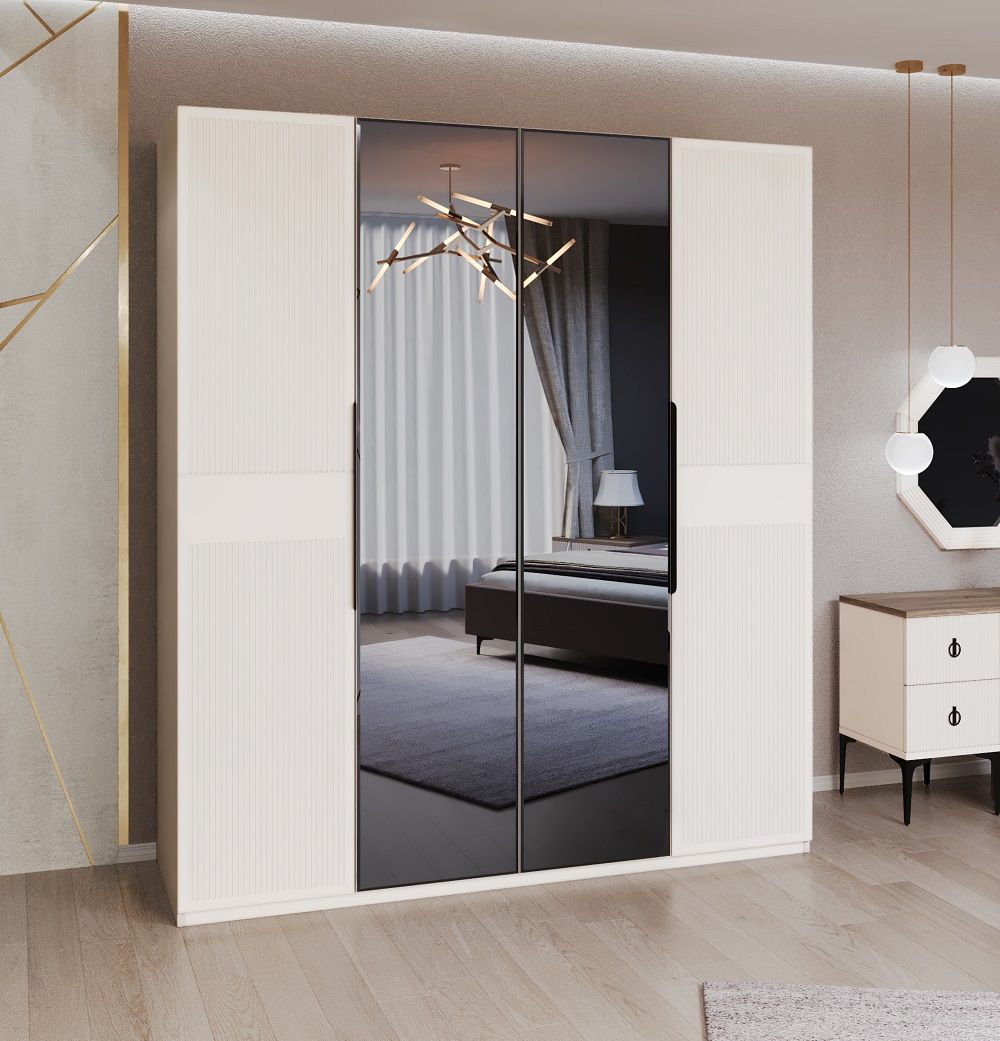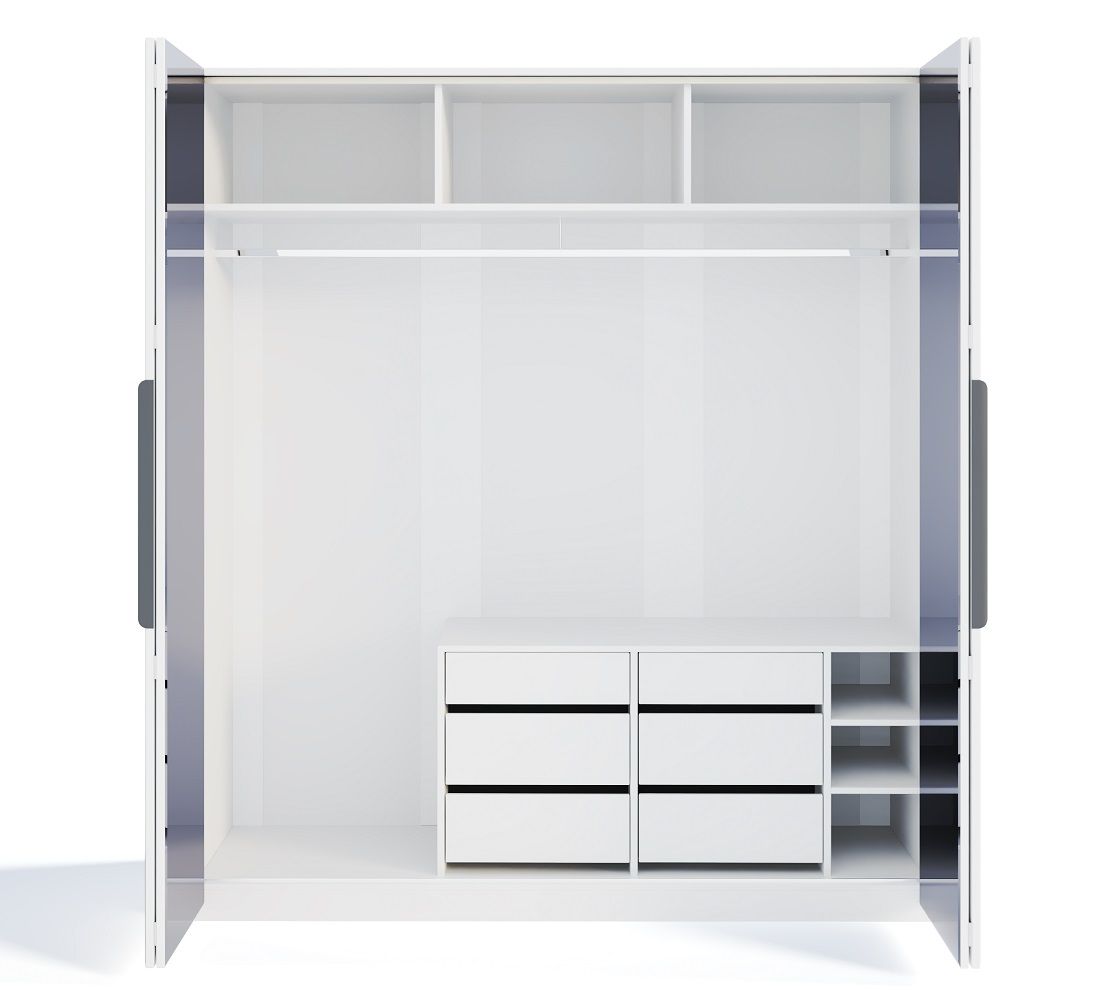 Завершают коллекцию вместительные шкафы "Стелла" которые представлены в 2х размерах — 4х и 6ти дверный. Складной механизм фасадов экономит место, плавная эргономичная форма ручки рейлинга позволяет удобно пользоваться шкафом, стандартное внутреннее наполнение с 2мя функциональными комодами, полками и штангой сохранят ваши вещи в порядке .