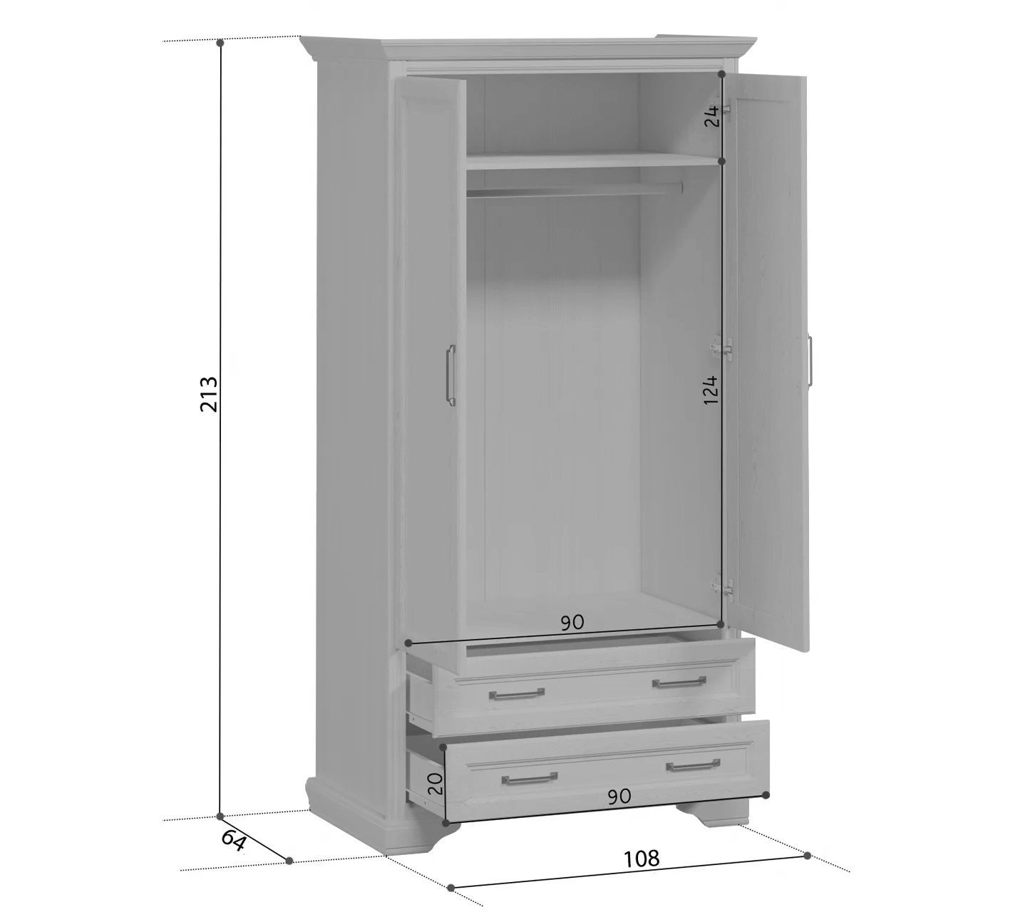 Высота двухдверного шкафа Stylius составляет 213 см, в его верхней части располагается небольшая полка. Благодаря глубине 64 см и ширине 108 см, он занимает устойчивое положение и не требует дополнительного крепления к стене. Его корпус и полки выполнены из ЛДСП высокого класса безопасности. Для удобства дверь может быть установлена с правой или левой стороны.