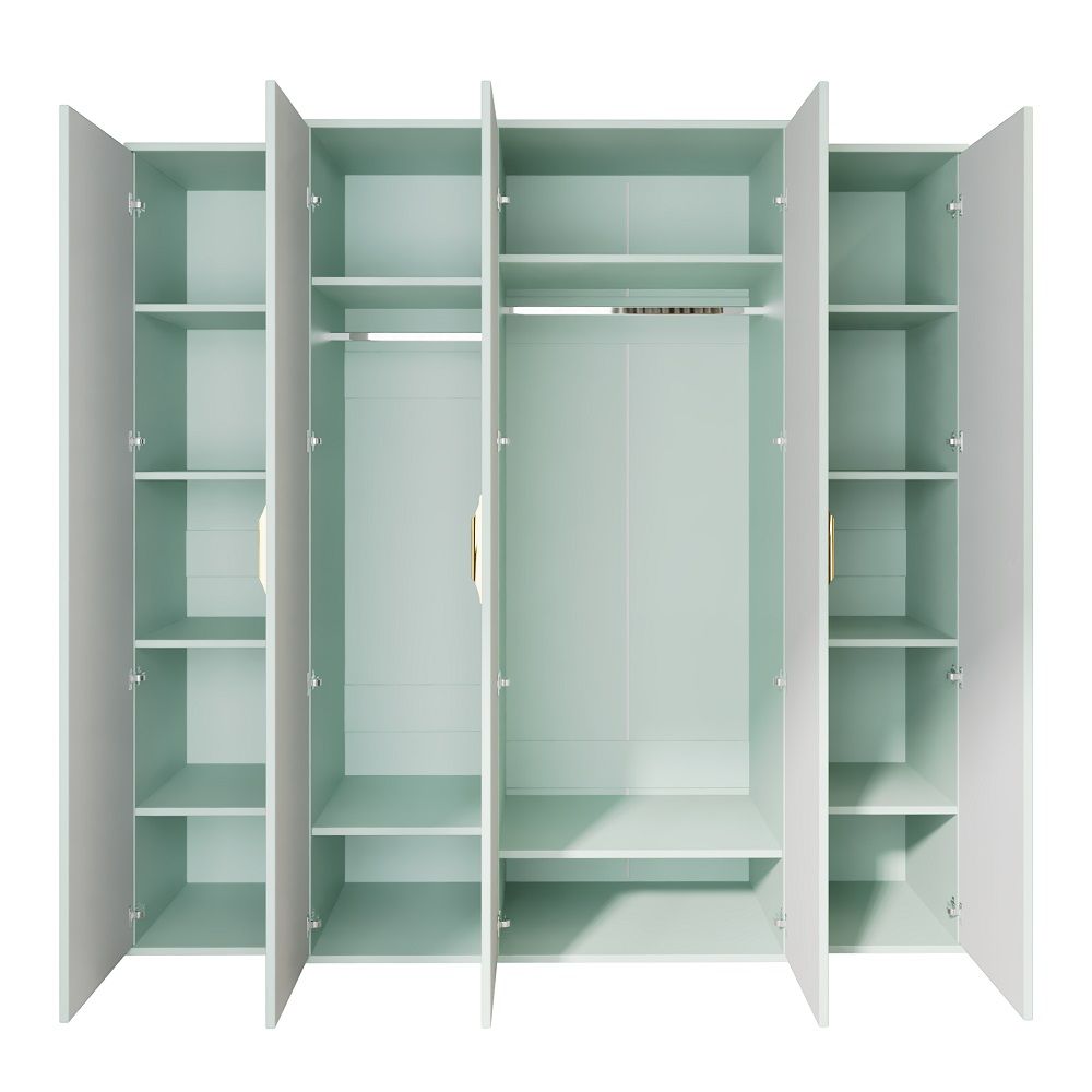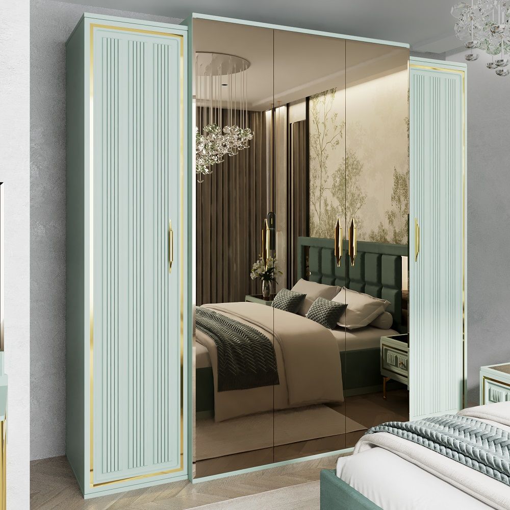 Внутреннее наполнение шкафа выполнено по стандартам гардеробной и укомплектован полки для белья и штанга для одежды. Фасады оснащены фурнитурой с доводчиком и  украшены металлизированным латунным декором — этот тренд сезона является авторским стилем фабрики Эра и такой же декор используется в спальне Lara – это расширяет возможности и позволяет миксовать коллекции новинок. Шкафы выпускаются 4х (1+2портал+1) и 5ти (1+3портал+1) створчатые самые функциональные варианты.