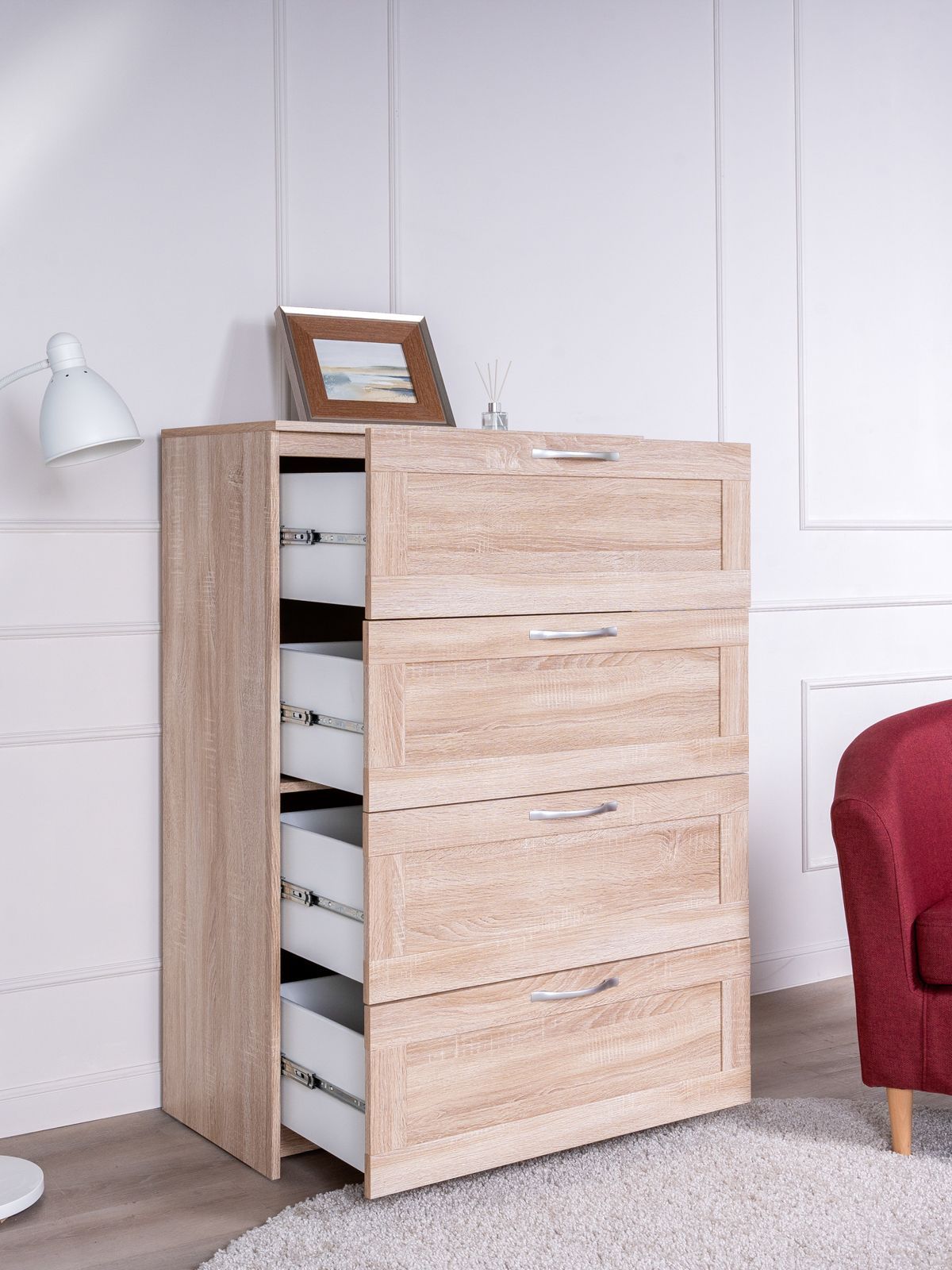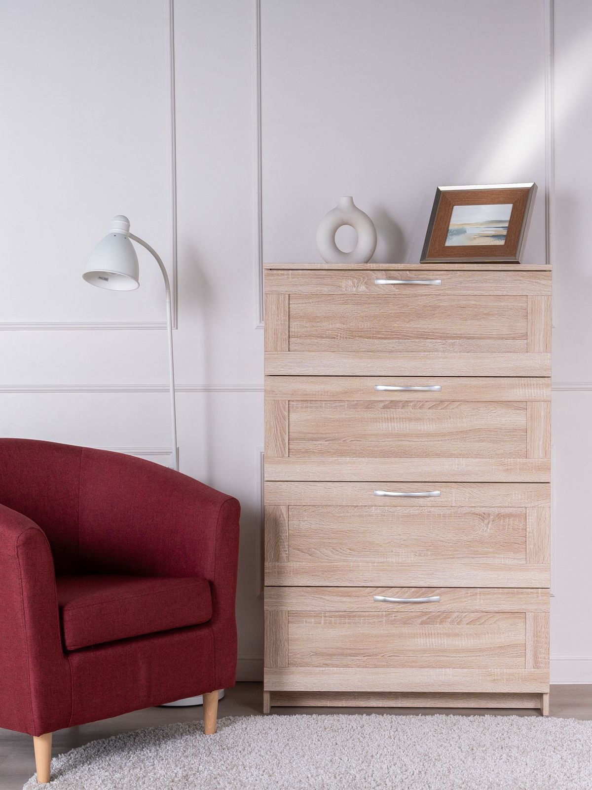 ГУД ЛАКК - знакомая мебель, которую легко купить и собрать! Комод СИРИУС 4 ящика — элегантность и качество в каждой детали! Серия мебели СИРИУС вдохновлена популярной серией BRIMNES от IKEA, и станет идеальным дополнением вашей квартиры. Лаконичный дизайн комодов гармонично впишется в любой интерьер, а компактные размеры не займут много места. Почему выбирают комод СИРИУС 4 ящика? Комод СИРИУС 4 ящика универсальный комод небольшого размера, который позволяет организовать хранение множества необходимых вещей – в верхние необходимые мелочи, чтобы были всегда под рукой, в других – подушек, одеял, белья или одежды, ведь благодаря глубине и максимальной нагрузке 8 кг они подходят для любых целей. А на столешнице комода можно поставить все, от рамок и ваз до аквариума – ведь максимальная нагрузка на нее целых 15 кг! Компактный размер и вертикально расположенные позволяет разместить его в небольших пространствах. УЗНАВАЕМЫЙ ДИЗАЙН В СТИЛЕ СКАНДИНАВСКОГО МИНИМАЛИЗМА. Комод с филенчатым фасадом — это элегантное решение, которое добавляет изысканности, и может использоваться в любых интерьерах. Удобные ручки без острых краев одновременно элегантны и безопасны. Утопленная нижняя планка добавляет комоду легкости и воздушности. ВМЕСТИТЕЛЬНЫЕ ЯЩИКИ. Здесь удобно хранить книги, гаджеты и аксессуары для них, украшения, или мелочи, и многое другое, что обязательно должно быть у Вас под рукой. Тумба МАЛЬТА – это маленькая Нарния). ЭКОЛОГИЧНОСТЬ. Наша мебель производится на заводе полного цикла по принципу «от древесины до готового изделия». При этом применяются максимально жесткие требования к экологичности на уровне, установленном для детской мебели. КАЧЕСТВО НА УРОВНЕ IKEA. Комод СИРИУС изготовлен на сертифицированной фабрике в Беларуси, которая ранее производила мебель для шведского бренда. Кстати, в том числе поэтому наш ассортимент прекрасно сочетается с мебелью ИКЕА, которая, возможно, есть у Вас дома. Сочетается как по дизайну, так и за счет совпадения цветовой гаммы. ЛЕГКОСТЬ СБОРКИ. Вы можете сами легко и быстро собрать нашу мебель, что позволит сэкономить и время на ожидание сборщика, и деньги на оплату его услуг. А поможет в этом не только высокое качество изготовленной мебели, но и понятная пошаговая инструкция. Кстати, если вы вдруг потеряли инструкцию, ее всегда можно скачать здесь, в карточке товара. НАДЕЖНОСТЬ. Несмотря на то, что гарантийный срок на мебель по закону составляет 24 месяца, реальный срок службы нашей мебели составляет до 20 лет. Уж поверьте, сменить обстановку вы решите гораздо раньше, чем выйдет из строя наша мебель. Мы хорошо знаем жизненный путь нашей мебели. Из Вашей квартиры она переедет на квартиру к детям, потом к внукам, потом на дачу, с дачи – на гараж, а потом, если захотите – вы сможете ее продать! КАЧЕСТВЕННАЯ ПЛОСКАЯ УПАКОВКА. Детали в упаковке уложены максимально плотно, с использованием демпфирующих материалов. Это позволяет максимально снизить риск повреждения при транспортировке. Однако обращаем внимание, что даже самая лучшая упаковка не гарантирует отсутствие повреждений при грубом обращении с товаром в процессе доставки. Но для таких случаев у нас работает сервисная служба, которая всегда готова бесплатно заменить поврежденные элементы (работает ежедневно с 08:00 до 20:00 МСК). ВЫСОКАЯ СОЧЕТАЕМОСТЬ МЕ