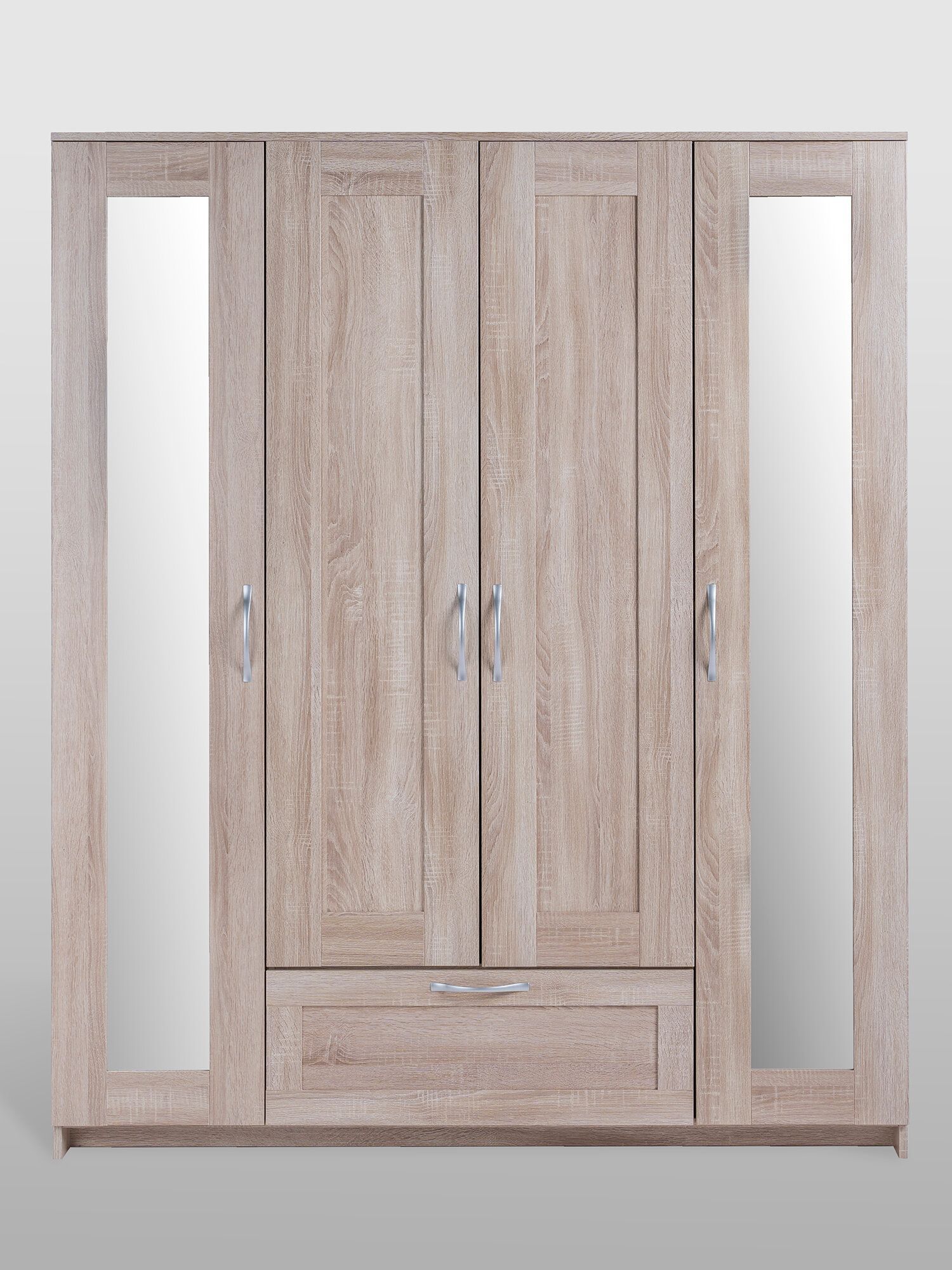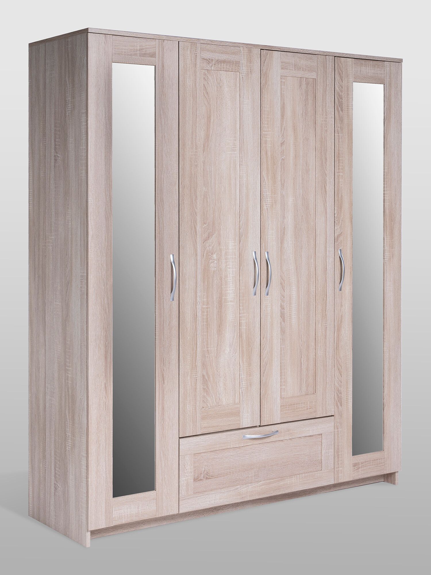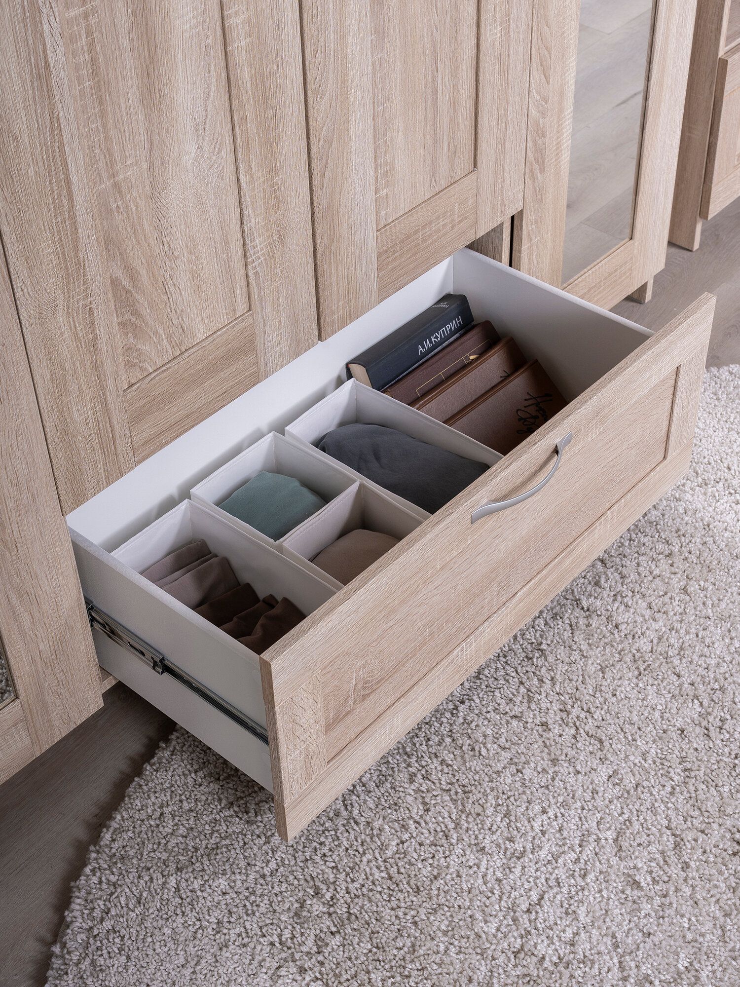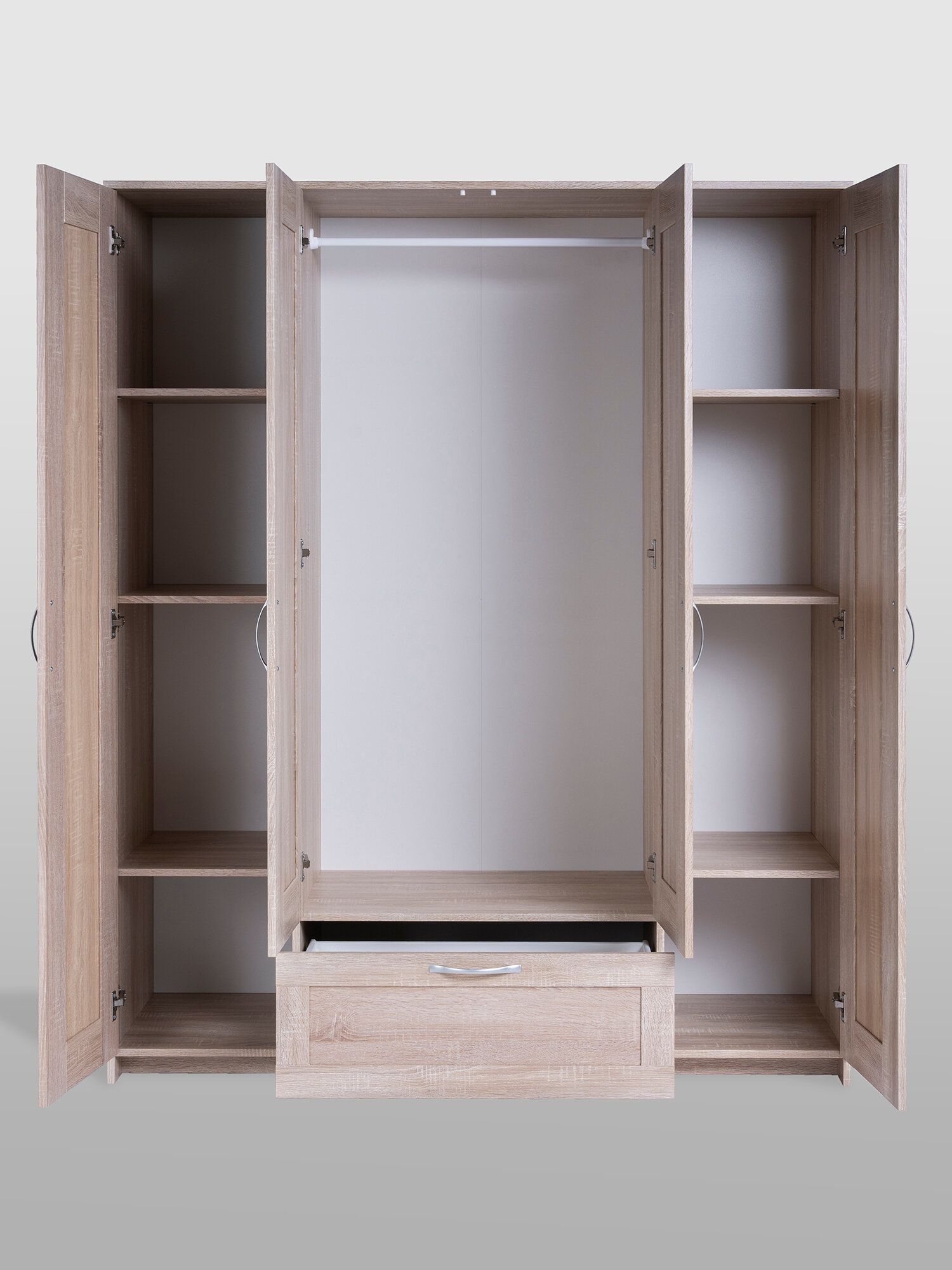 ГУД ЛАКК - знакомая мебель, которую легко купить и собрать! Шкаф ГУД ЛАКК СИРИУС, 4 двери и 1 ящик с зеркалами, 190x156x50 см — элегантность и качество в каждой детали! Серия мебели СИРИУС вдохновлена популярной серией BRIMNES от IKEA, и станет идеальным дополнением вашей квартиры. Почему выбирают Шкаф ГУД ЛАКК СИРИУС, 4 двери и 1 ящик с зеркалами, 190x156x50 см? Шкаф СИРИУС — это стильное и функциональное решение для хранения, которое сочетает в себе практичность, элегантный дизайн и продуманную организацию пространства. Филенчатые фасады придают шкафу изысканный вид, делая его украшением любого интерьера, а зеркало позволит подобрать идеальный образ. Внутри шкафа расположена прочная платяная штанга, на которой можно разместить одежду на плечиках, сохраняя ее в идеальном состоянии. Просторное внутреннее пространство с тремя дверцами позволяет организовать хранение одежды, обуви, аксессуаров или других вещей. Внешний выдвижной ящик с удобной ручкой предназначен для хранения мелких вещей, аксессуаров или белья. Его можно использовать, не открывая дверцы шкафа, что делает доступ к вещам быстрым и удобным. Так же внутри есть 8 полок, которые можно отрегулировать по высоте для разных вещей. Шкаф имеет оптимальные размеры, что делает его подходящим для небольших помещений, таких как спальни, прихожие, гостевые комнаты или даже гардеробные. Он не занимает много места, при этом остается вместительным. Шкаф СИРИУС — это идеальное сочетание стиля, функциональности и доступности. Он станет надежным помощником в организации хранения, создании уютной атмосферы и поддержании порядка в вашем доме. Благодаря своему универсальному дизайну и продуманной конструкции, этот шкаф будет радовать вас долгие годы!