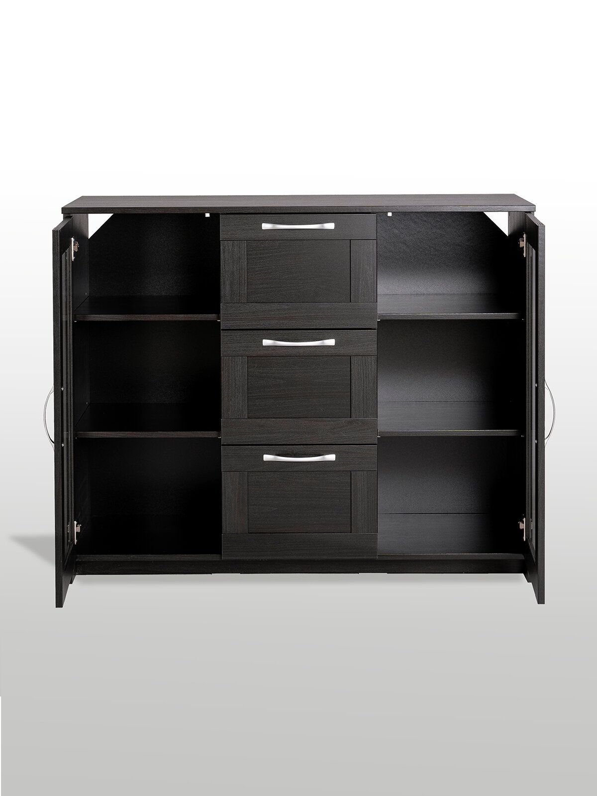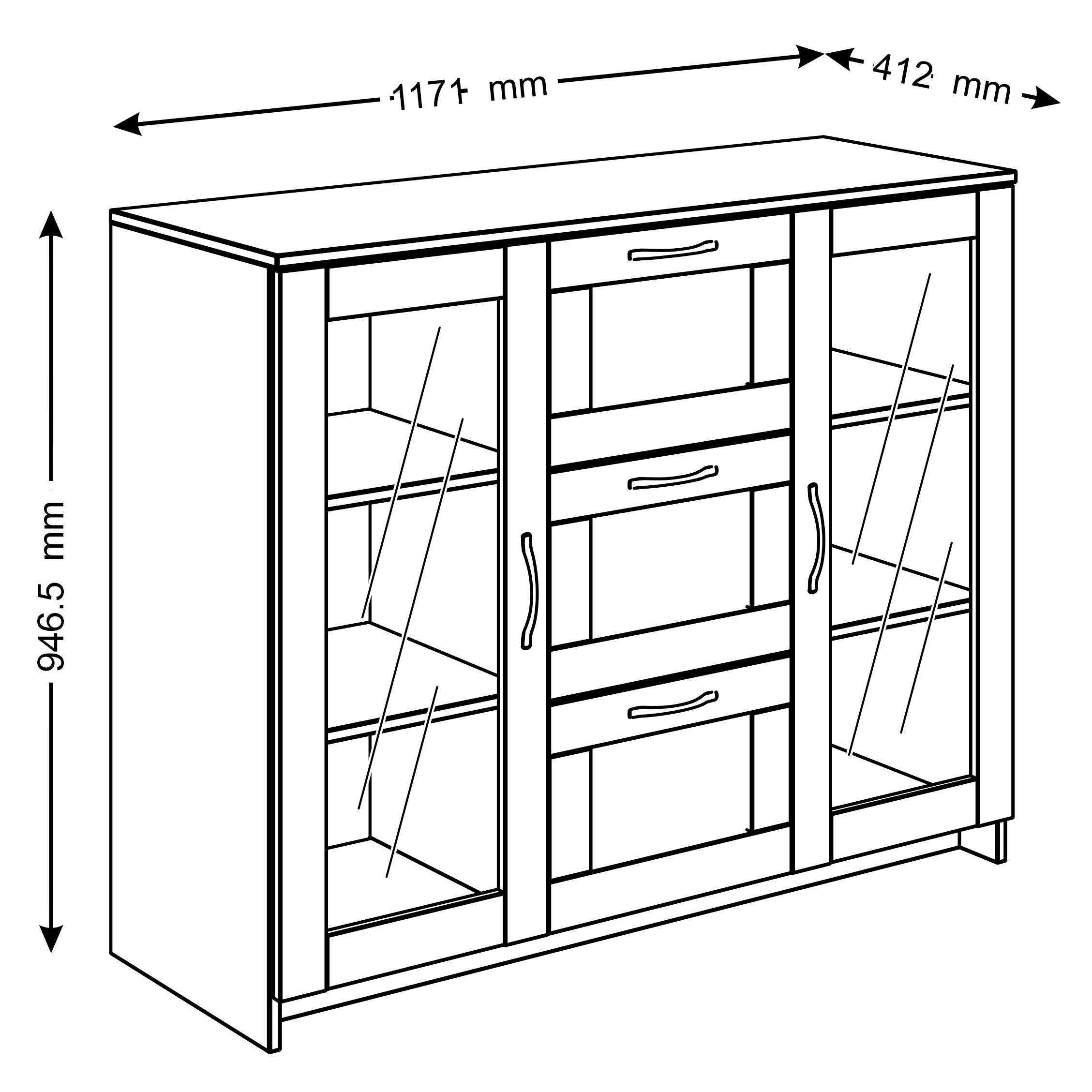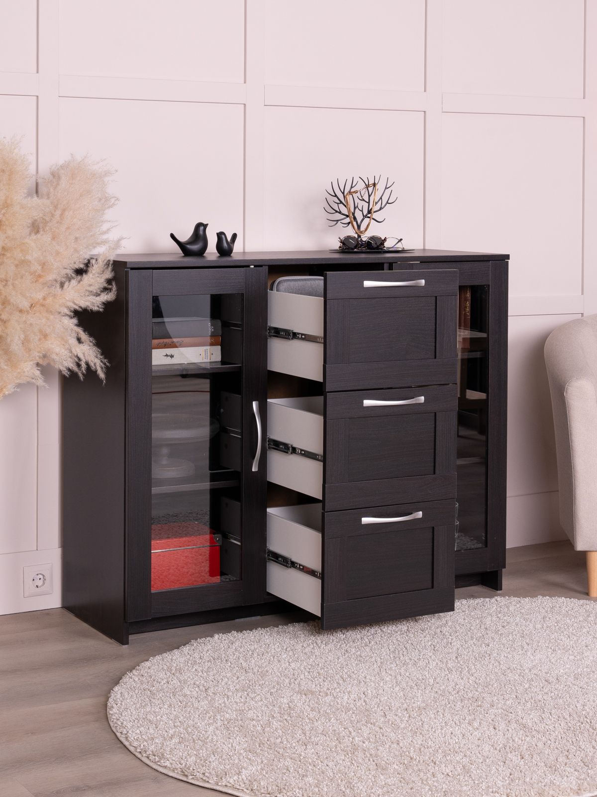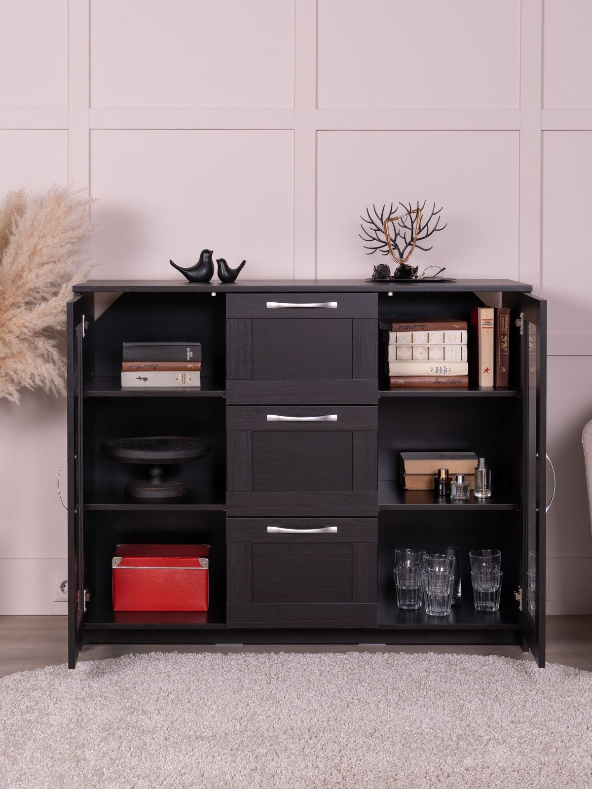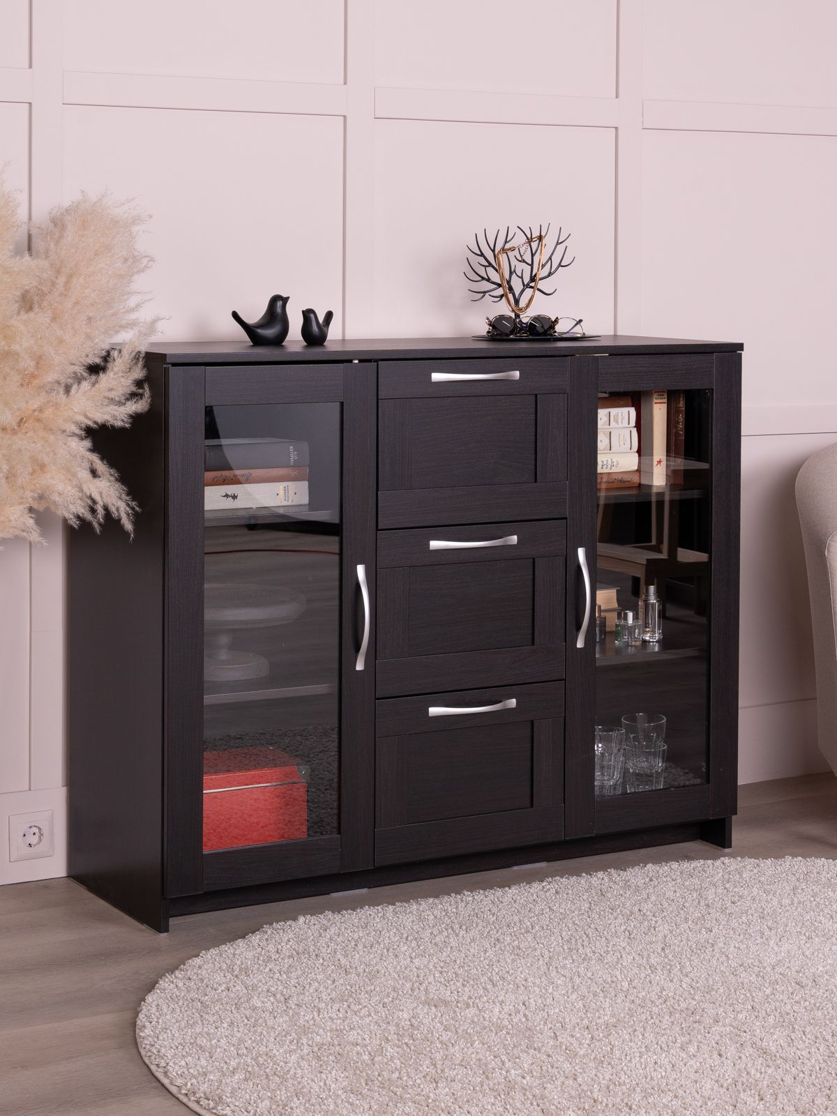 Тумба Сириус, 2 двери со стеклом и 3 ящика, 117х41х95 см, дуб венге, черно-коричневая