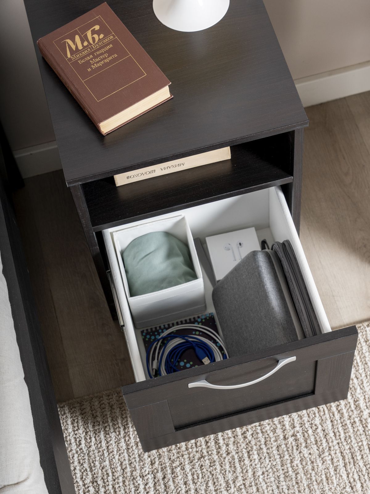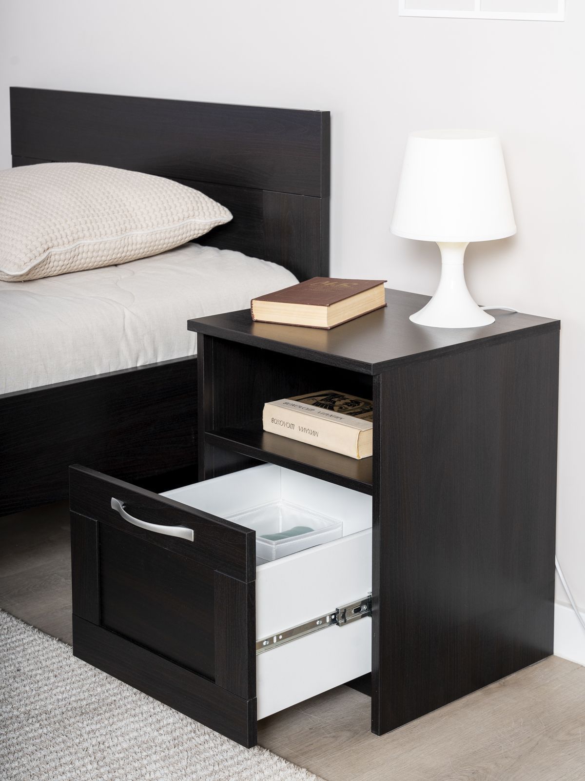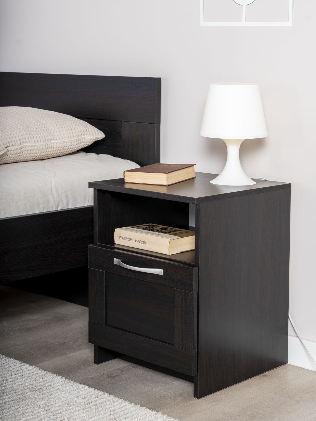 ГУД ЛАКК - знакомая мебель, которую легко купить и собрать! Прикроватная тумба СИРИУС— элегантность и качество в каждой детали! Серия мебели СИРИУС вдохновлена популярной серией BRIMNES от IKEA, и станет идеальным дополнением вашей квартиры. Лаконичный дизайн комодов гармонично впишется в любой интерьер, а компактные размеры не займут много места. Почему выбирают прикроватную тумбу СИРИУС? Тумба СИРИУС — это элегантное и функциональное решение для прикроватного хранения, которое сочетает в себе стиль и практичность. Ее главная особенность — две открытые полки, которые позволяют удобно разместить всё, что нужно под рукой. Верхняя полка идеально подойдет для светильника, создающего уютную атмосферу для чтения, кружки утреннего кофе или телефона на зарядке. Нижняя полка станет удобным местом для книги, планшета или других мелочей, которые должны быть всегда в доступе. Дополнительно тумба оснащена вместительным выдвижным ящиком, где можно спрятать то, что используется реже, например, вкусняшки, аксессуары или важные мелочи. Небольшие габариты тумбы делают ее компактной, но при этом она остается очень вместительной. Ее лаконичный и стильный дизайн позволяет использовать ее не только у кровати, но и в любой другой комнате: в гостиной — для хранения пультов и аксессуаров, в прихожей — для ключей и мелочей. Тумба СИРИУС — это не просто мебель, а настоящий помощник в организации пространства. Она сочетает в себе удобство, элегантность и универсальность, делая ее незаменимым элементом вашего интерьера. Где бы вы ее ни поставили, она пригодится везде! УЗНАВАЕМЫЙ ДИЗАЙН В СТИЛЕ СКАНДИНАВСКОГО МИНИМАЛИЗМА. Комод с филенчатым фасадом — это элегантное решение, которое добавляет изысканности, и может использоваться в любых интерьерах. Удобные ручки без острых краев одновременно элегантны и безопасны. Утопленная нижняя планка добавляет комоду легкости и воздушности. ВМЕСТИТЕЛЬНЫЕ ЯЩИКИ. Здесь удобно хранить книги, гаджеты и аксессуары для них, украшения, или мелочи, и многое другое, что обязательно должно быть у Вас под рукой. Тумба МАЛЬТА – это маленькая Нарния). ЭКОЛОГИЧНОСТЬ. Наша мебель производится на заводе полного цикла по принципу «от древесины до готового изделия». При этом применяются максимально жесткие требования к экологичности на уровне, установленном для детской мебели. КАЧЕСТВО НА УРОВНЕ IKEA. Тумба СИРИУС изготовлен на сертифицированной фабрике в Беларуси, которая ранее производила мебель для шведского бренда. Кстати, в том числе поэтому наш ассортимент прекрасно сочетается с мебелью ИКЕА, которая, возможно, есть у Вас дома. Сочетается как по дизайну, так и за счет совпадения цветовой гаммы. ЛЕГКОСТЬ СБОРКИ. Вы можете сами легко и быстро собрать нашу мебель, что позволит сэкономить и время на ожидание сборщика, и деньги на оплату его услуг. А поможет в этом не только высокое качество изготовленной мебели, но и понятная пошаговая инструкция. Кстати, если вы вдруг потеряли инструкцию, ее всегда можно скачать здесь, в карточке товара. НАДЕЖНОСТЬ. Несмотря на то, что гарантийный срок на мебель по закону составляет 24 месяца, реальный срок службы нашей мебели составляет до 20 лет. Уж поверьте, сменить обстановку вы решите гораздо раньше, чем выйдет из строя наша мебель. Мы хорошо знаем жизненный путь нашей мебели. Из Вашей кв