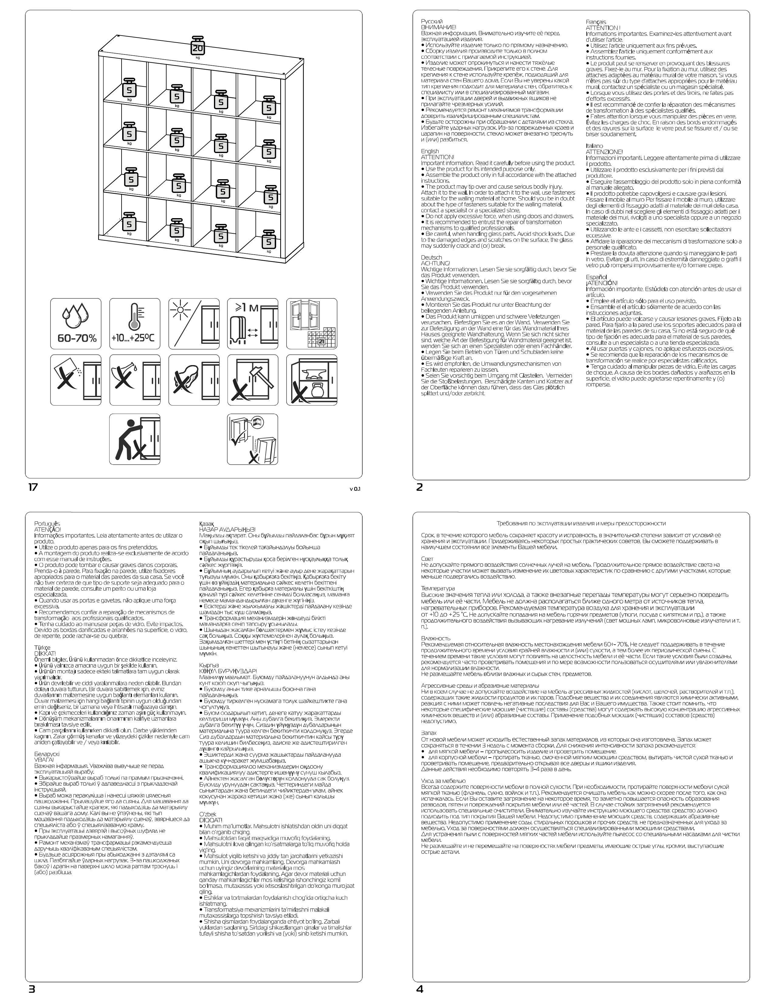 Сборка: 10% от стоимости, но не менее 1000 руб. Выезд сборщика за МКАД: +40 руб./км. Навес зеркал, полок, вешалок: 100 руб одно отверстиеСтяжка: 50 руб.Вынос упаковочного материала сборщиками не производится.