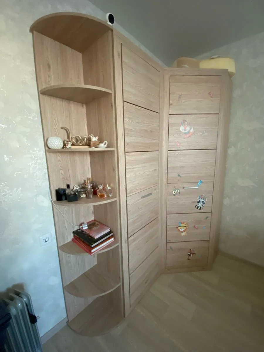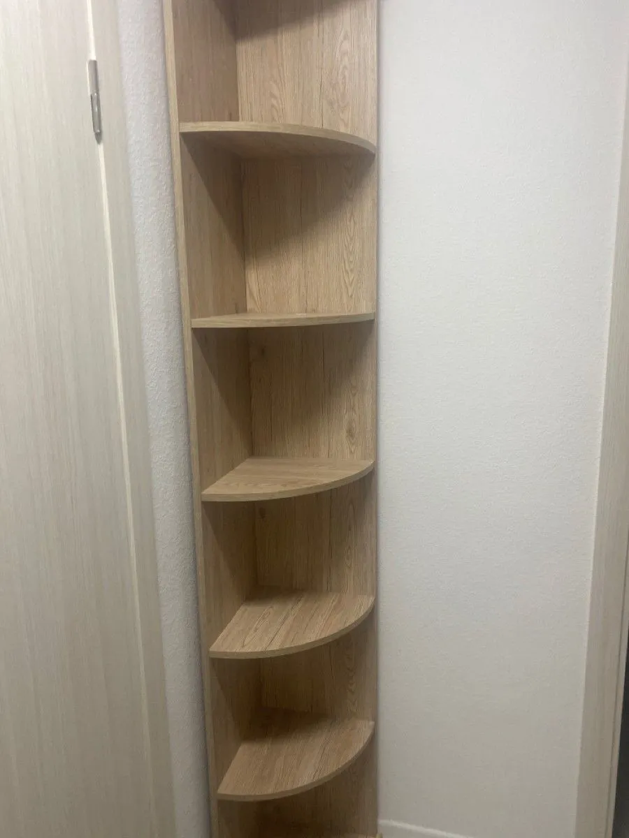 Открытый угловой шкаф Oskar – отличное решение для интерьеров, где не всегда возможно поставить полноразмерную мебель. Внешне такая модель напоминает стеллажную систему с большим количеством отделений. В качестве основных мест для хранения здесь выступают треугольные полки, скругленные с внешней стороны. Конструкция не содержит травмирующих элементов, поэтому может быть установлена в детской.