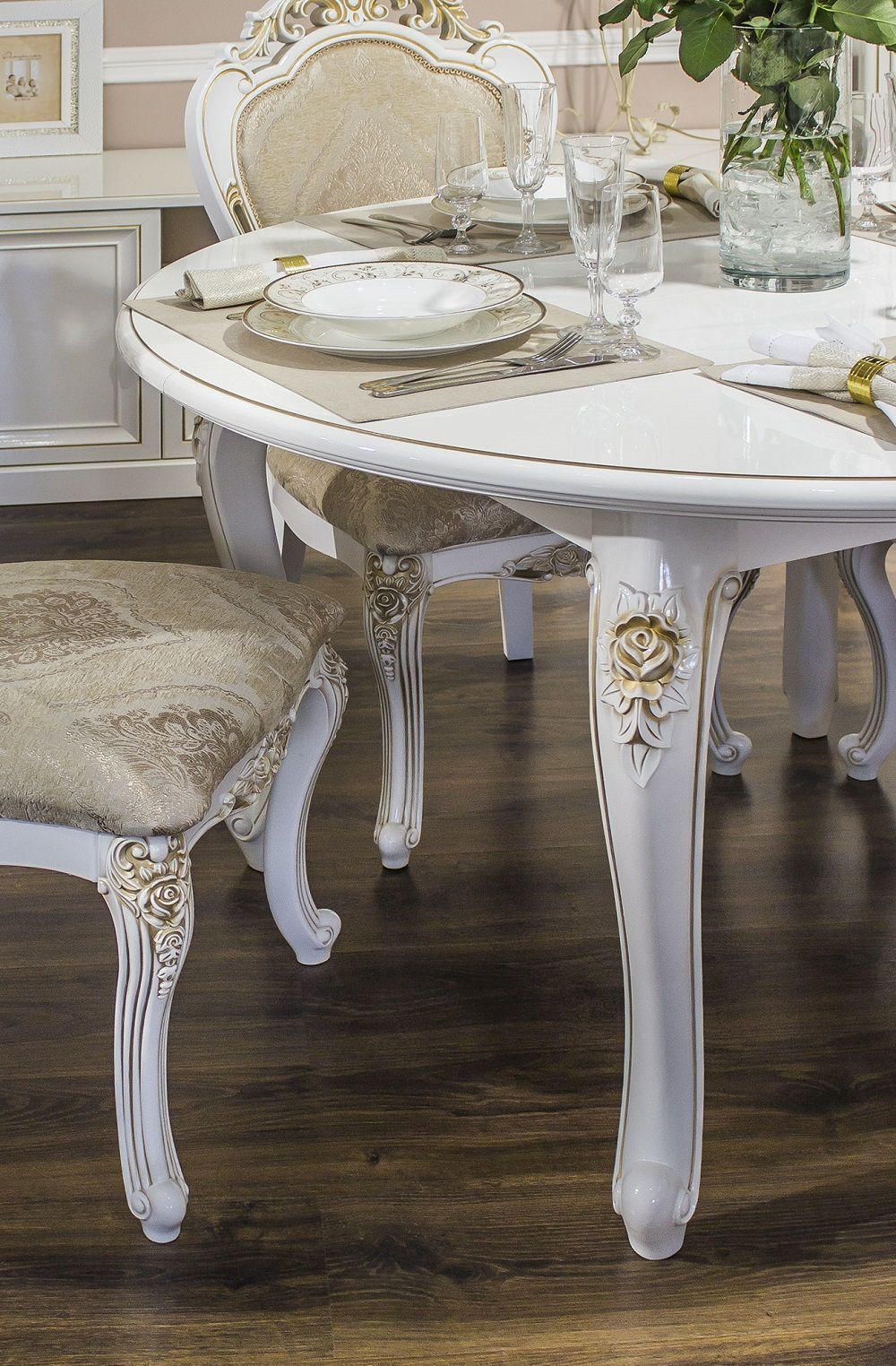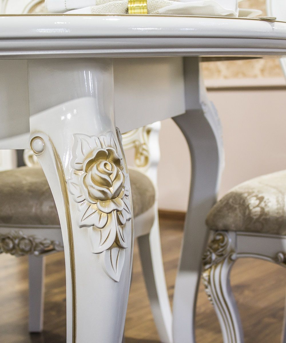 Столовая "Натали" подойдет для ценителей изысканности, классики и благородства. Мебель в светлых оттенках зрительно расширяет пространство, а золотая патина выделяет стилистические решения.