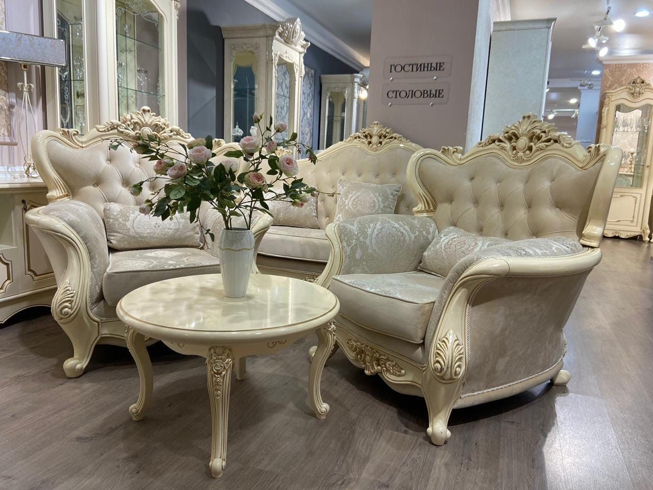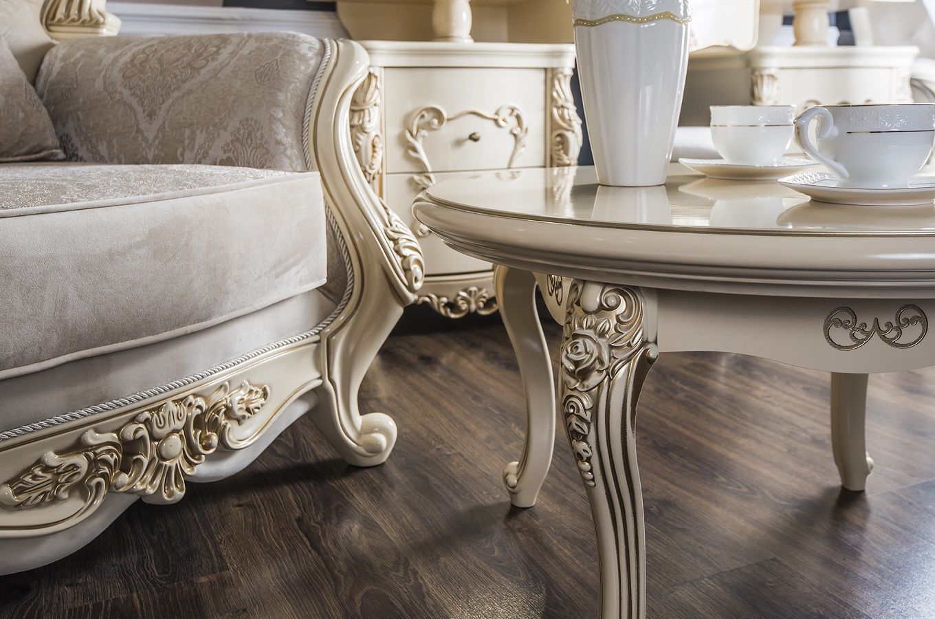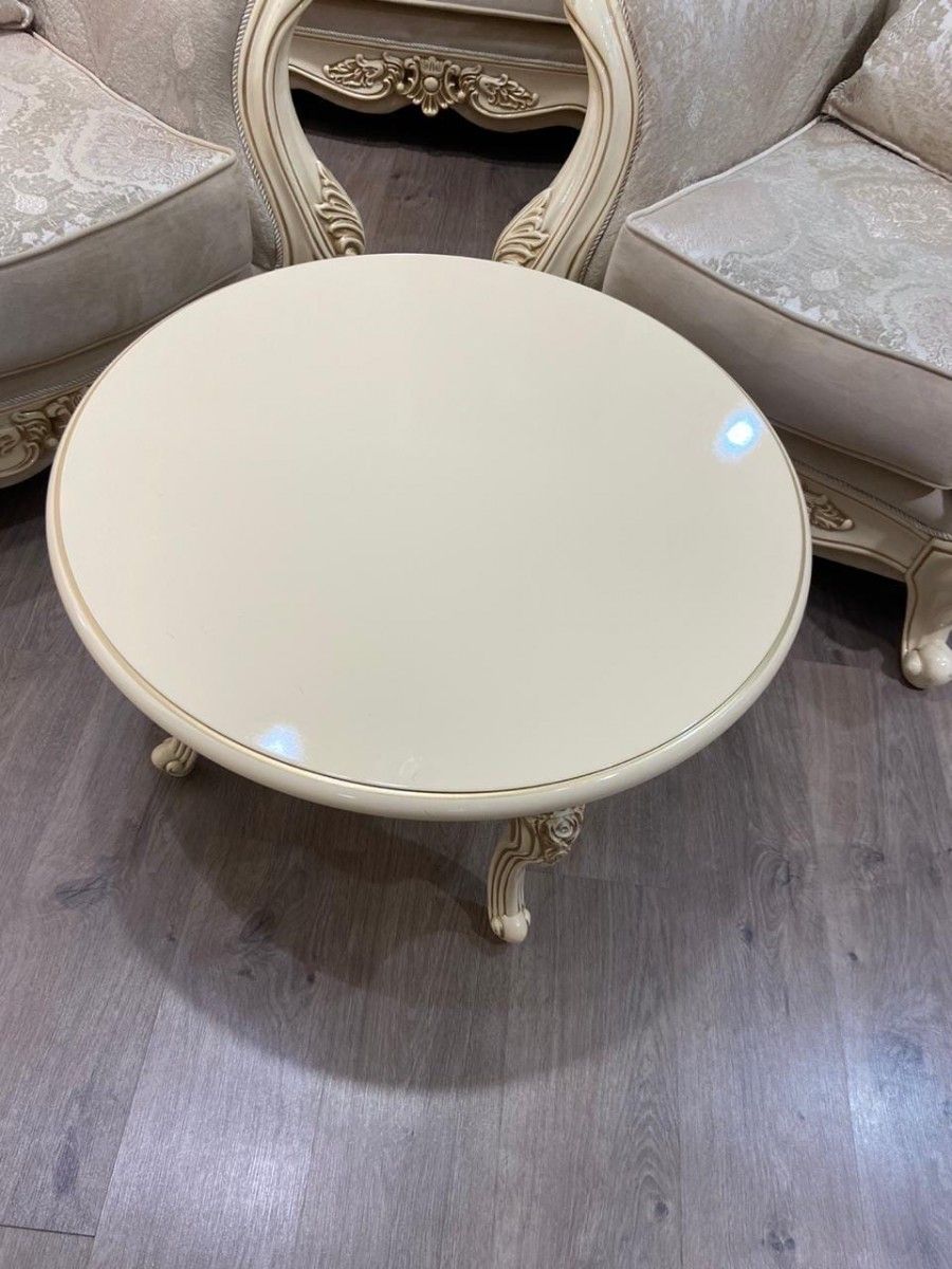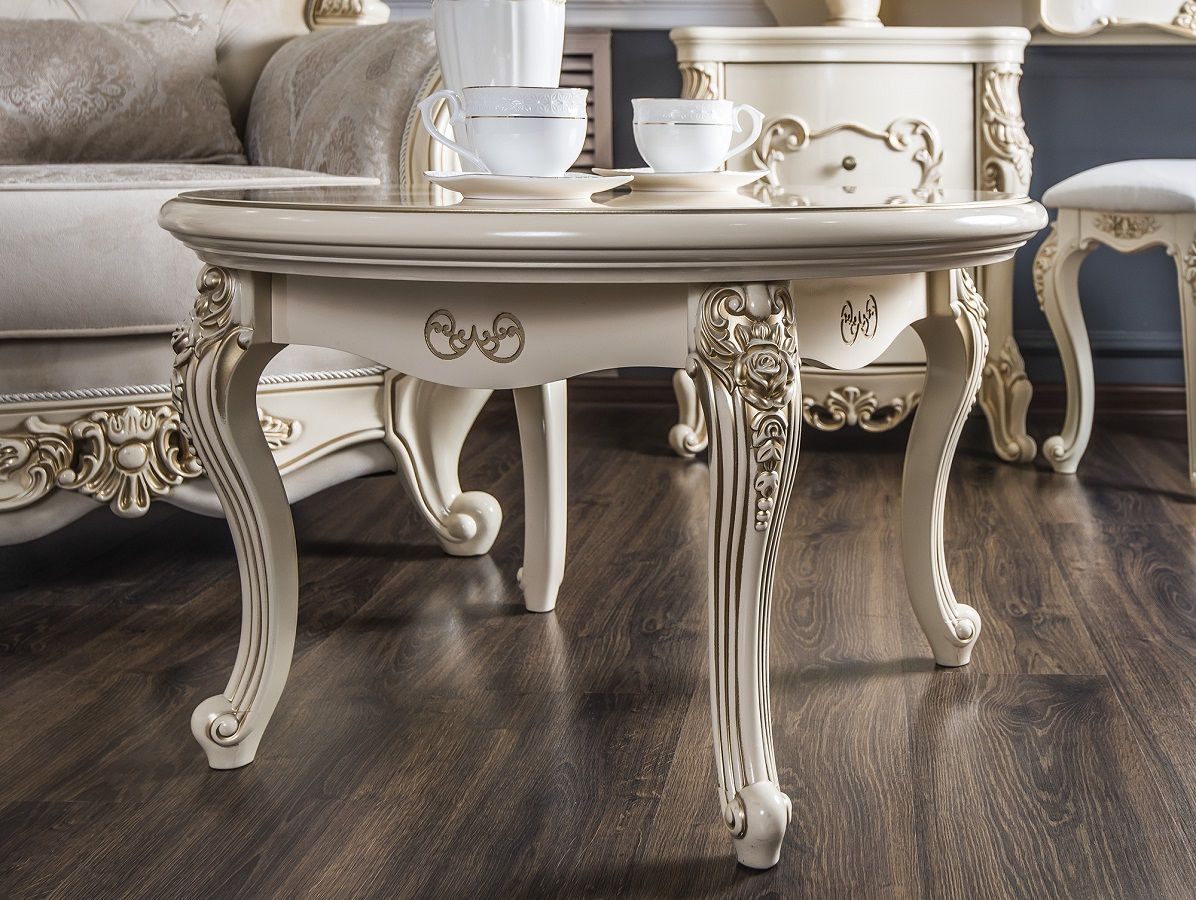 Круглый журнальный столик «Джоконда» с толщиной столешницы 60 мм изготовлен на мебельной фабрике «Эра» из цельнокроенного МДФ и ЛДСП категории Е1. Накладной декор в виде завитков и растительных орнаментов сделан из ППУ, легкого и износостойкого полимера. Столешница равномерно окрашена в 4 слоя экологически безопасной краской в цвете крем и имеет красивый глянцевый блеск.
