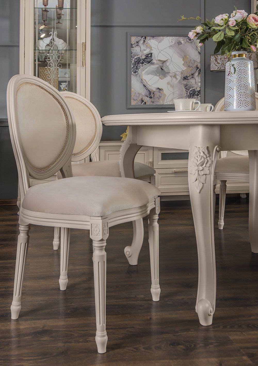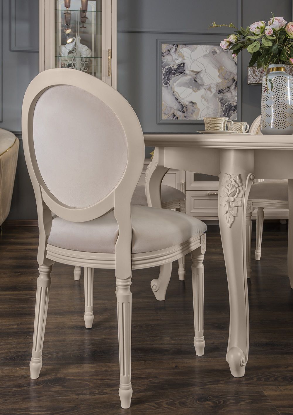 МОККО — это столовая группа с круглым столом и мягкими стульями на античных ножках.