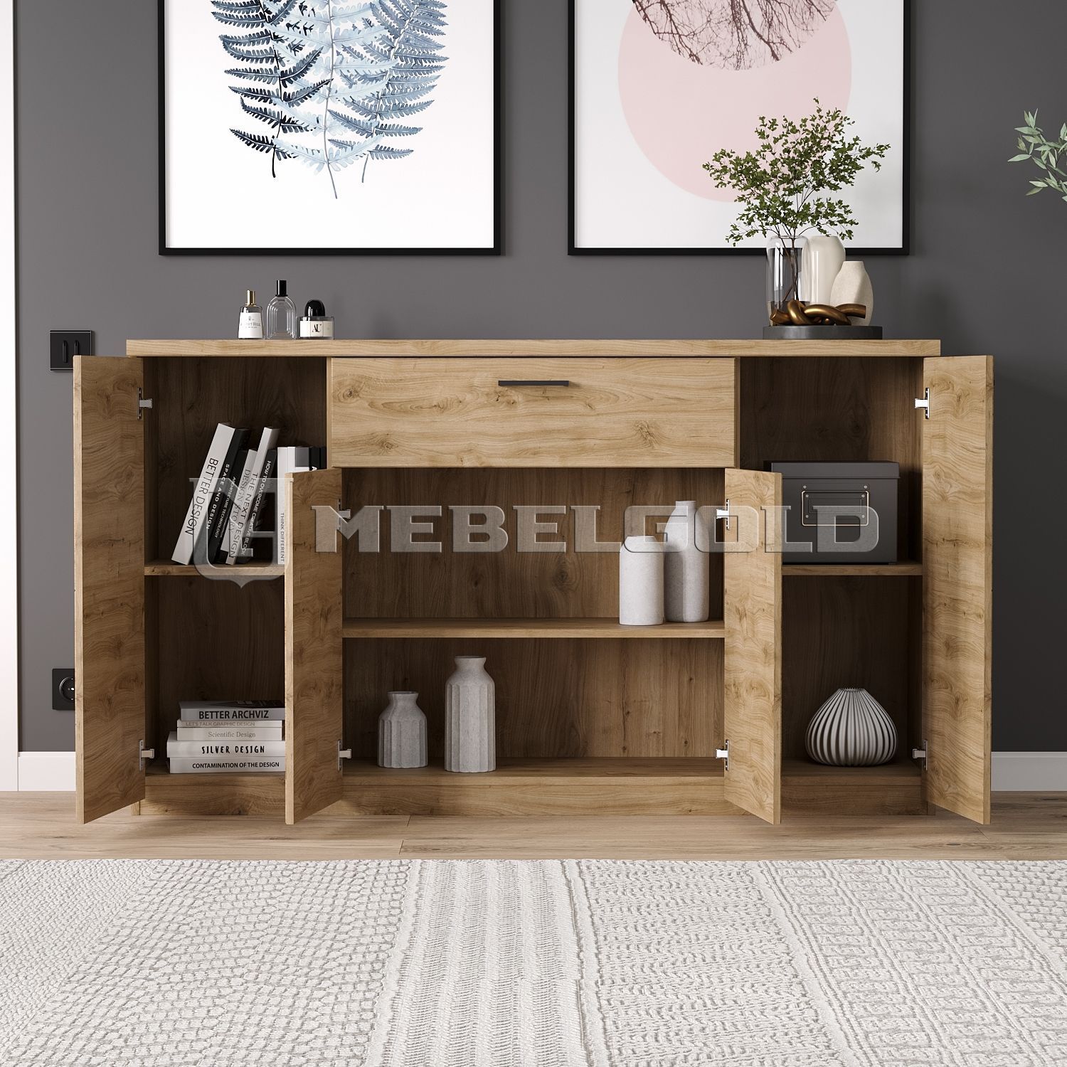 Универсальная модель тумбы Doorset 4D1S создана для хранения белья, бытовых принадлежностей и личных вещей. При ее изготовлении белорусский производитель Anrex особое внимание уделил наполнению и создал конструкцию с четырьмя распашными дверями и одним выдвижным ящиком. Тумбочка имеет небольшую высоту (94 см), поэтому на нее можно устанавливать светильники, декор и предметы постоянного пользования. Она прекрасно смотрится отдельно и в составе мебельного гарнитура.