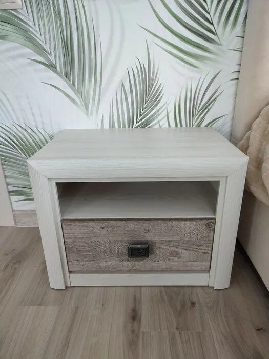Покрытая ламинированной пленкой прикроватная тумба Koen имеет светлый каркас в цвете снежного ясеня. Его эффектно оттеняют коричневые вставки в тон натуральной сосны, особенно фактурно на их фоне смотрятся черные квадратные ручки с гравировкой. Они придают изделию динамику и подчеркивают стиль.