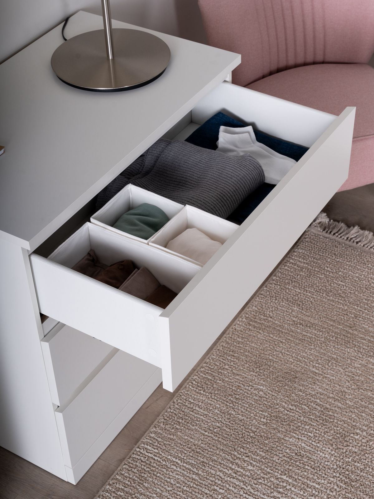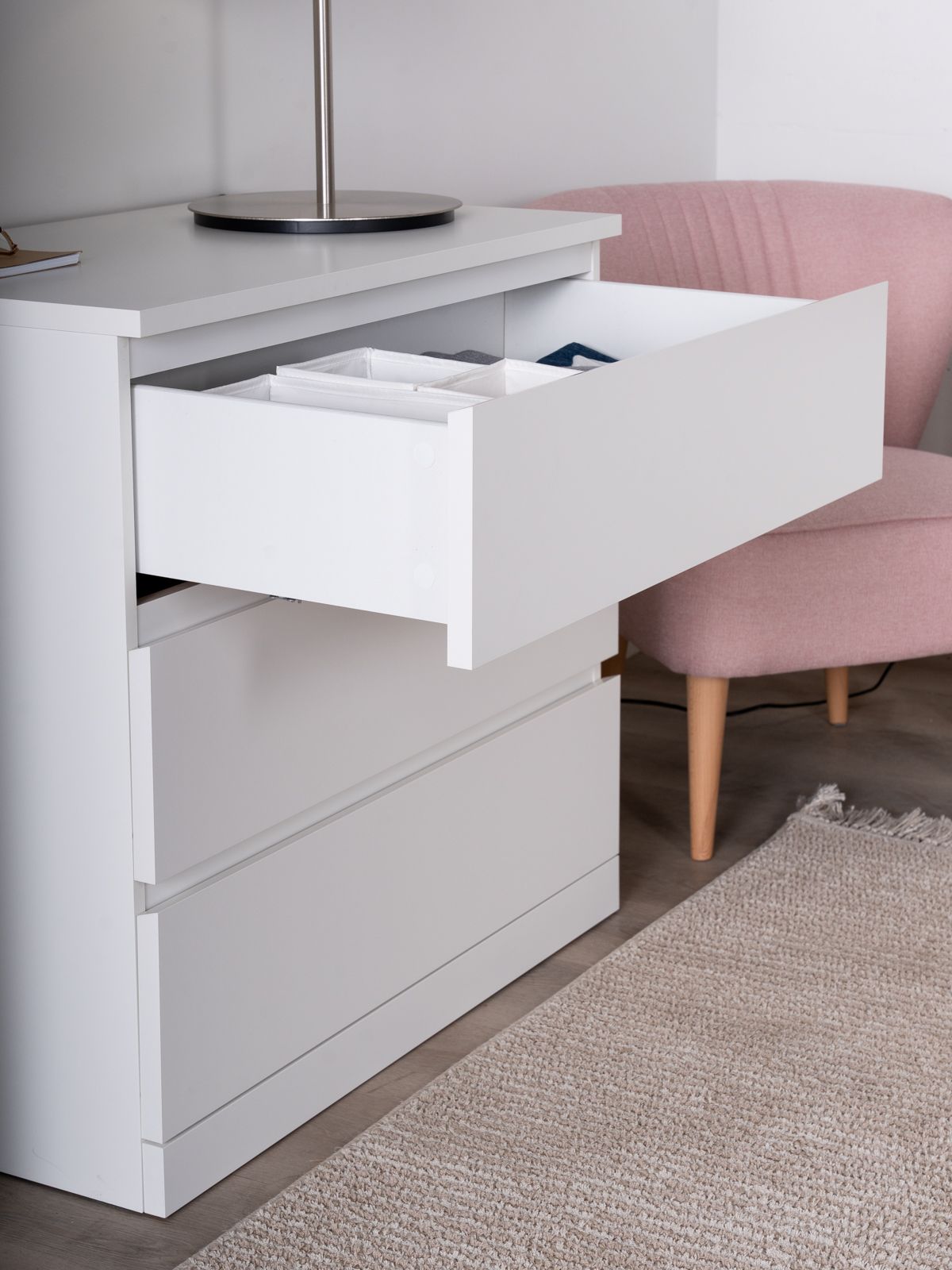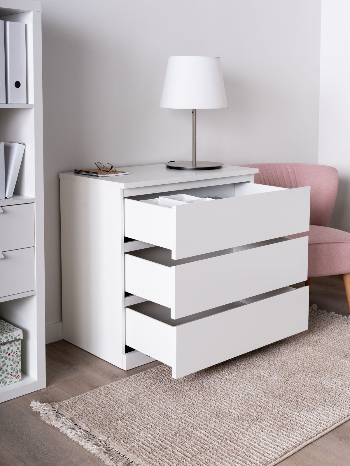 Комод ВАРМА ПРАЙМ 3 ящика 80х77х48 — элегантность и качество в каждой детали! Серия мебели ВАРМА вдохновлена популярными сериями MALM и BILLY от IKEA, и станет идеальным дополнением вашей квартиры. Лаконичный дизайн комодов гармонично впишется в любой интерьер, а компактные размеры не займут много места. Почему выбирают комод ВАРМА ПРАЙМ 3 ящика 80х77х48? Комод ВАРМА ПРАЙМ — ультимативный комод, который позволяет организовать хранение всех необходимых вещей – в верхние необходимые мелочи, чтобы были всегда под рукой, в других – подушек, одеял, белья или одежды, ведь благодаря глубине и максимальной нагрузке 8 кг они подходят для любых целей. А на столешнице комода можно поставить все, от рамок и ваз до аквариума – ведь максимальная нагрузка на нее целых 15 кг! Компактный размер позволяет разместить его в небольших пространствах. Комод ВАРМА представлен в трех вариантах: Белый цвет покрыт прочной эмалью. Эмалевое покрытие создает гладкую, ровную поверхность с приятным матовым блеском, добавляя мебели изысканности и визуальной легкости. Оно устойчиво к царапинам, влаге и выгоранию, что делает комод долговечным и простым в уходе. Цвета \"черный ясень\" и \"беленый дуб\" покрыты натуральным шпоном. Шпон сохраняет естественную текстуру древесины, придавая комоду благородный внешний вид и добавляя интерьеру уют и теплоту. Такая мебель выглядит дорого и стильно, оставаясь при этом доступной по цене. Доводчики обеспечивают плавное и тихое закрывание ящиков. Направляющие полного выдвижения позволяют выдвигать ящик целиком, предоставляя полный доступ к его содержимому, упрощая поиск вещей и организацию внутреннего пространства ящика.