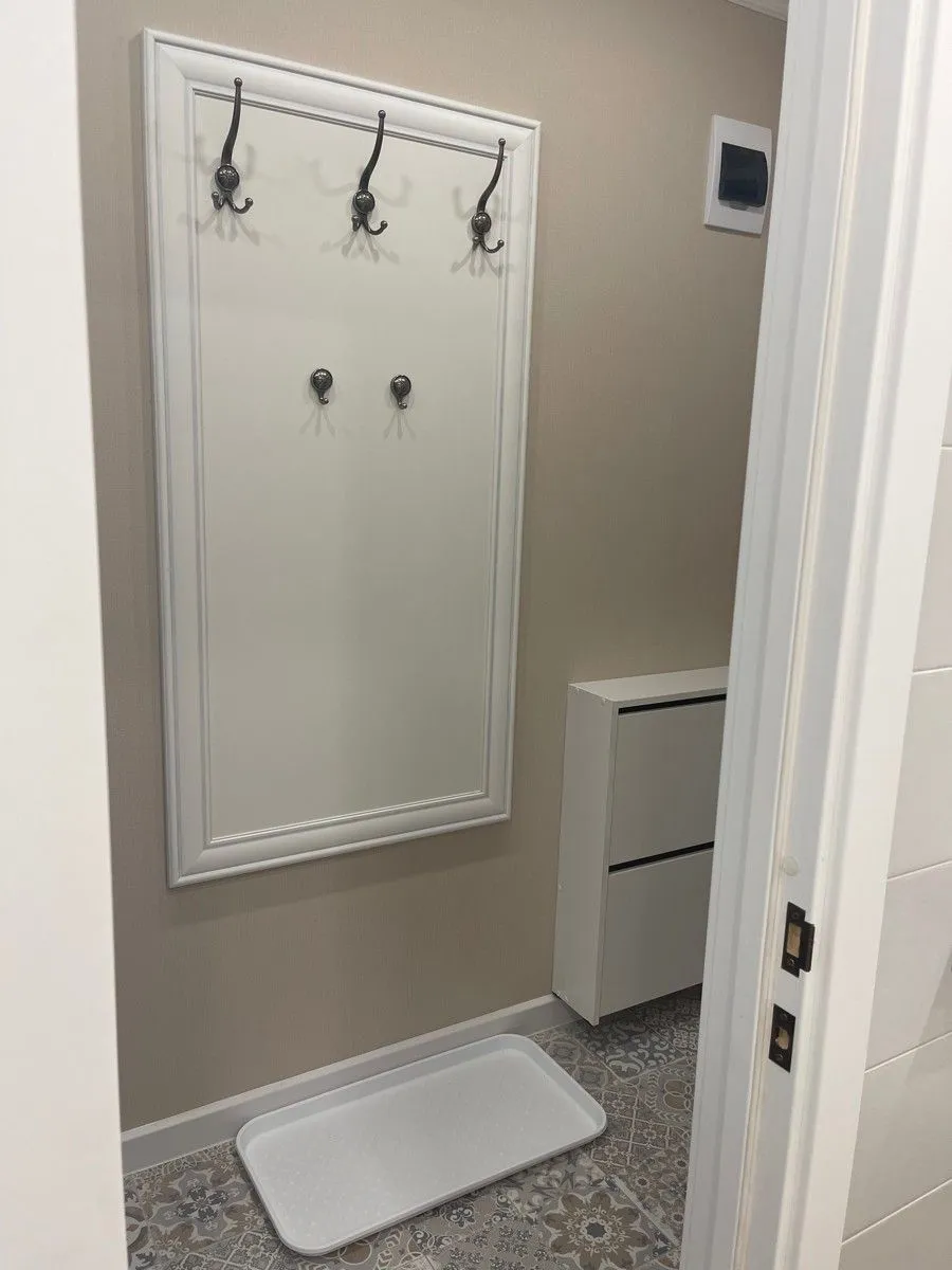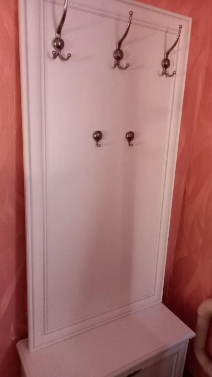 Простая белая вешалка Kentaki с крючками под бронзу подойдет прихожей современного, классического и неоклассического стиля. Ее можно установить над обувной полкой, комодом или тумбой с аналогичным дизайном.