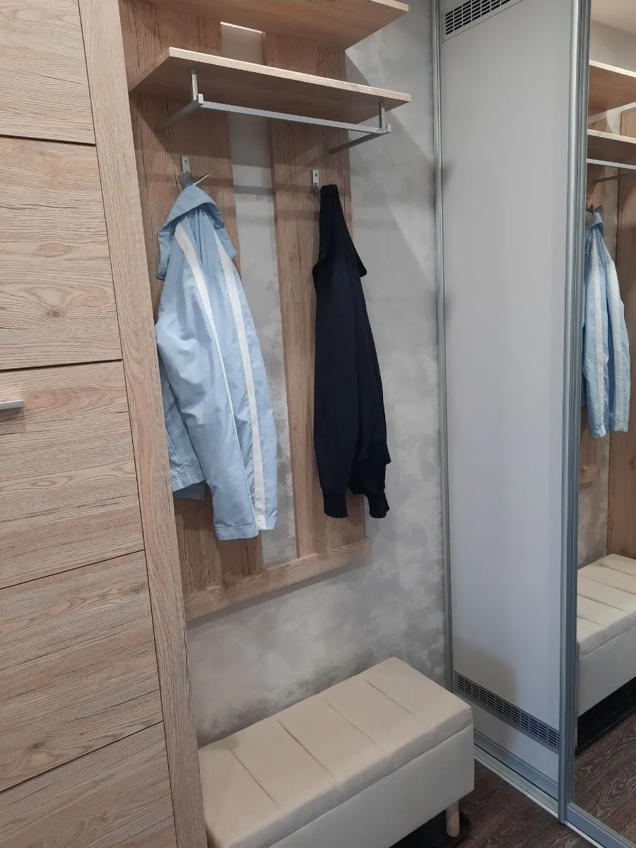 Настенная вешалка коллекции Oskar 60 – это более компактная модель коллекции. Она состоит из двух независимых элементов типа досок, объединенных между собой планками. В верхней части установлены две дополнительные полки. Для большей вместительности производитель укомплектовал одну из них металлической штангой для плечиков и рассредоточил по щиту 4 двойных крючка польского производства. Разная высота их расположения позволит пользоваться этим предметом ребенку и взрослому.
